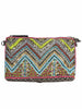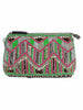 This jacquard cotton sling bag with one metal chain has one main zip closure compartment and also has one zip pocket one patch pocket inside. This sling bag is decorated with bead work. It can also be used as a clutch.