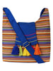 Striped cotton sling bag has one main compartment with zip closure and a flap decorated with tessles. it also has one zip pocket and one patch pocket inside along with 1 zip pocket at the back. the strap is adjustable.