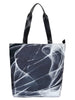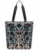 Printed canvas tote bag with two handles made with canvas. has one main zip compartment. also has one zip pocket inside and one zip pocket at the back.
