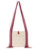 This cotton jacquard sling bag has one long shoulder strap and one main compartment with wodden button closure. it also has one zip pocket and two patch pockets inside and is decorated with tassels.