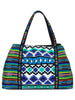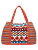 This jacquard canvas handbag with two handles made with cotton has one main compartment with magnetic button closure and also has one zip pocket and one patch pocket inside. Decorated with bead work.