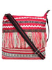 This striped jacquard & PU sling bag embellished with fringes and lace has one main compartment with zip closure. It has one zip pocket and one mobile patch pocket inside along with an adjustable sling strap.