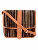 This striped velvet & PU sling bag has one main compartment with flap which has a megnatic button closure. It has one zippocket and 2 patch pocket inside along with an adjustable sling strap.