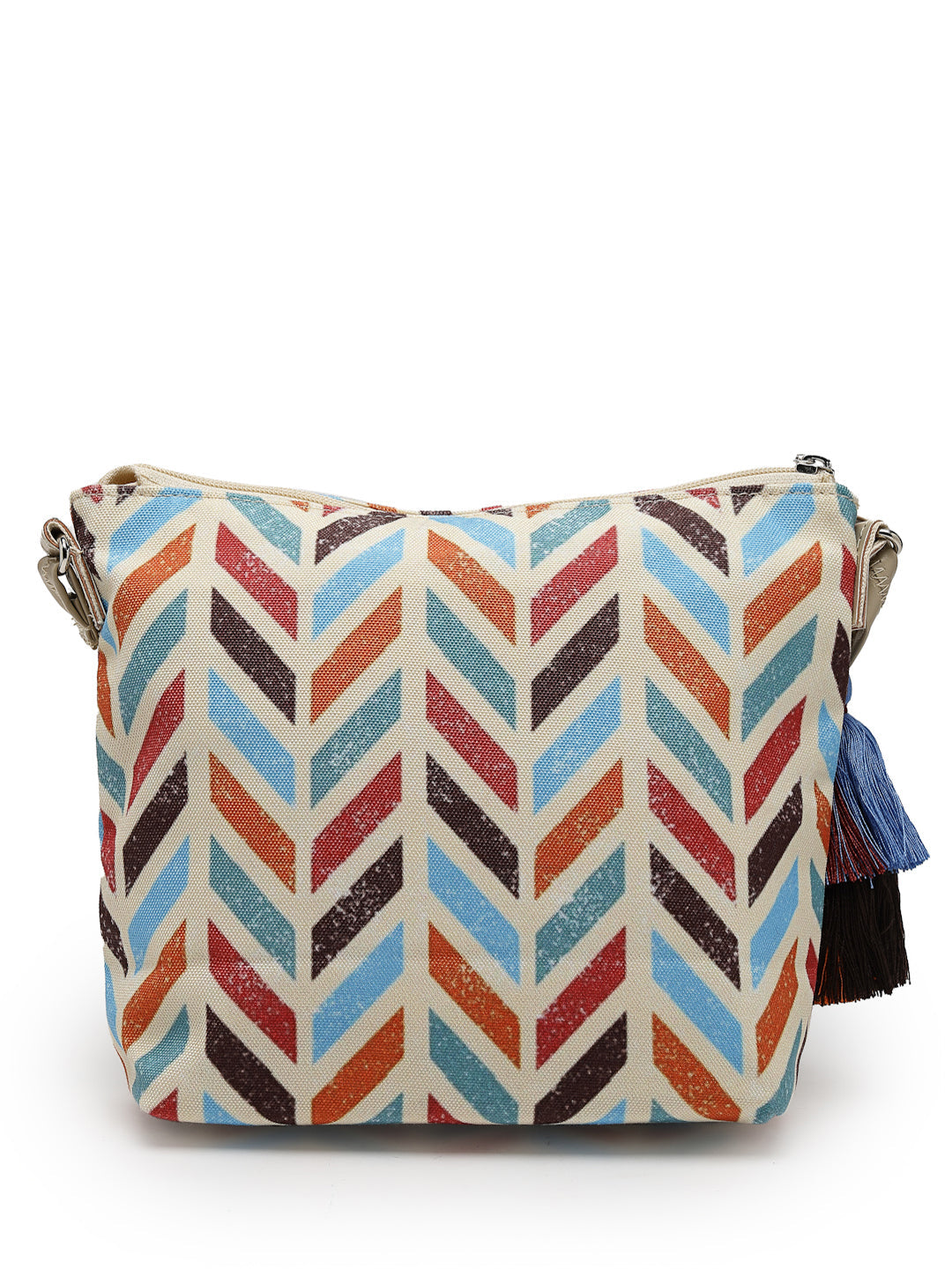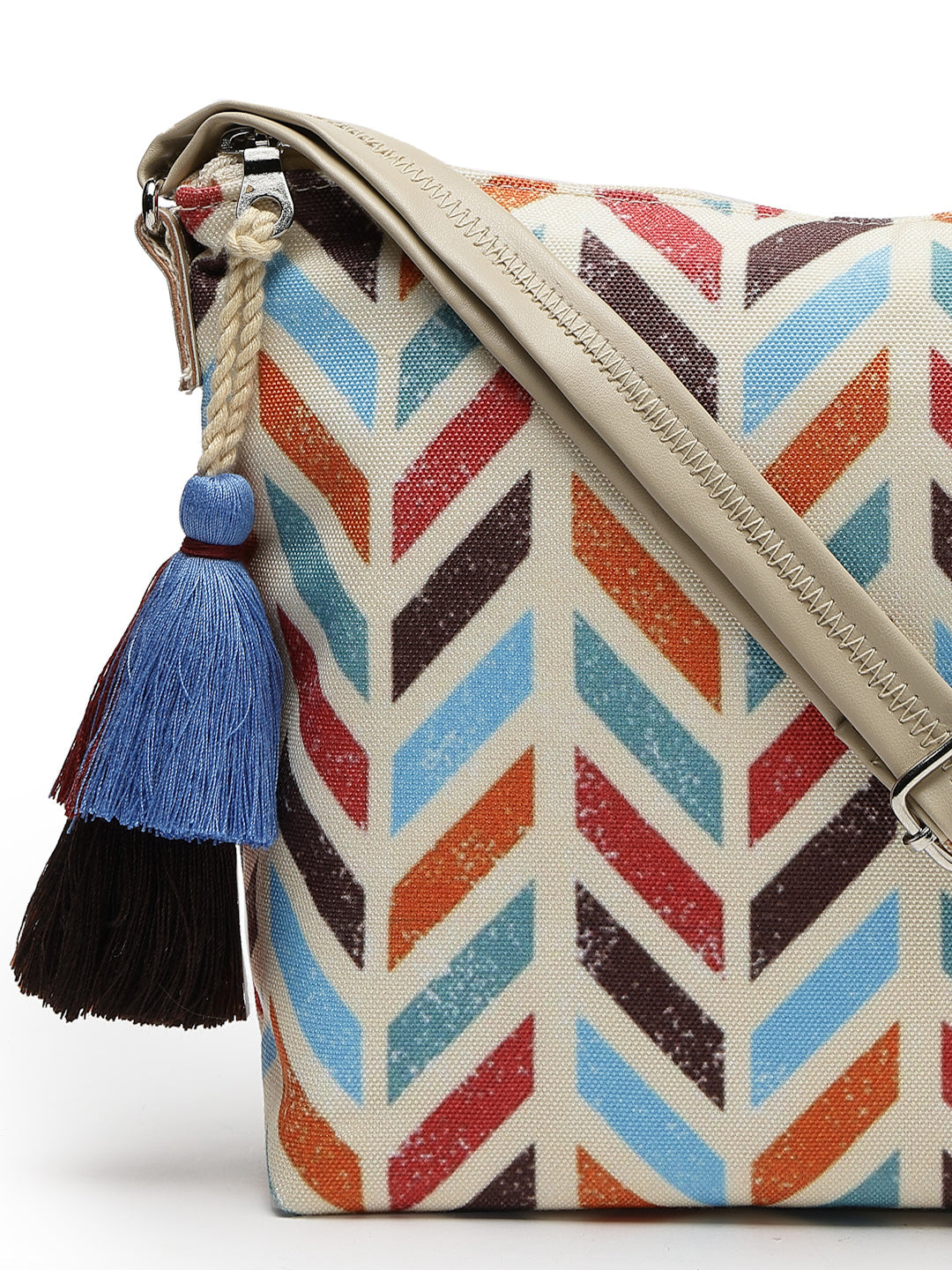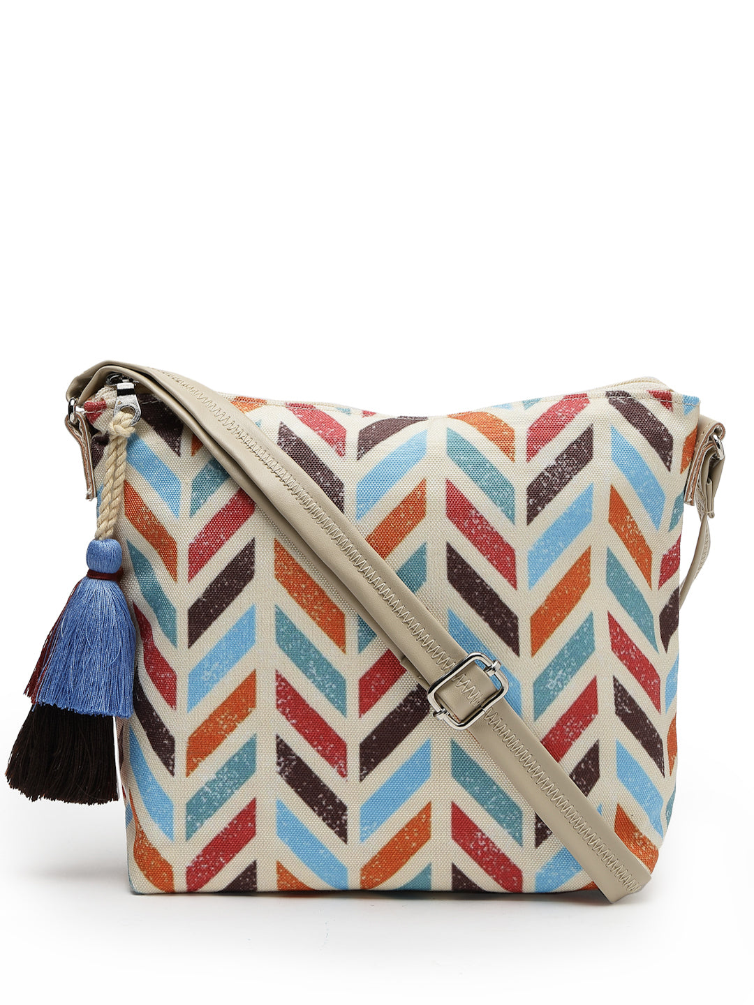 This floral digital printed sling bag is designed with polyester and leatherette material. This grey and multi color bag has been embellished with tassels keeping in mind the latest trends. It has a robust zip closure and adjustable zig-zag embroidered sling strap.It sports three main compartments adding one zip compartment and one mobile pocket inside.