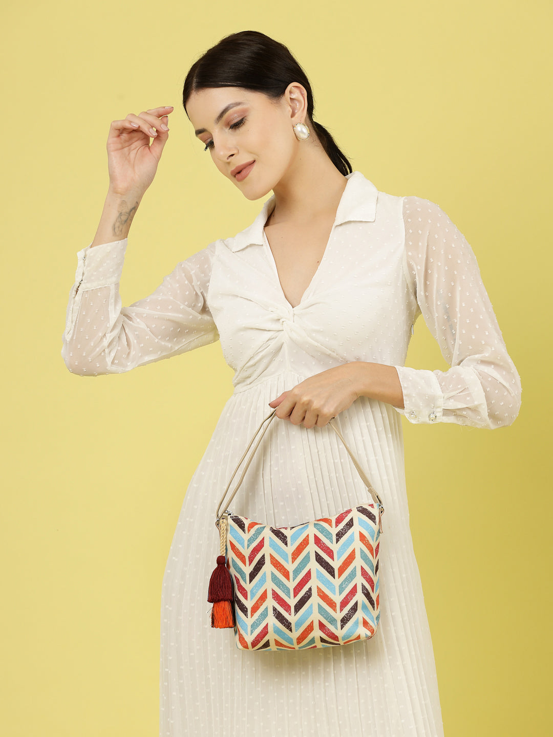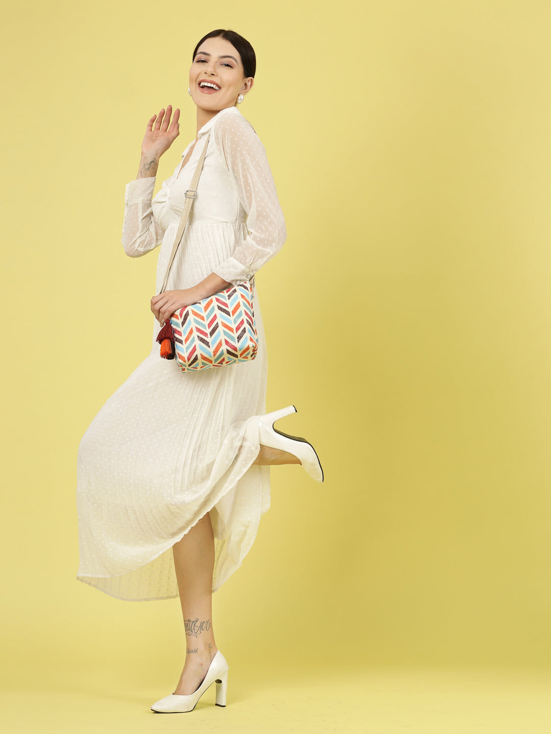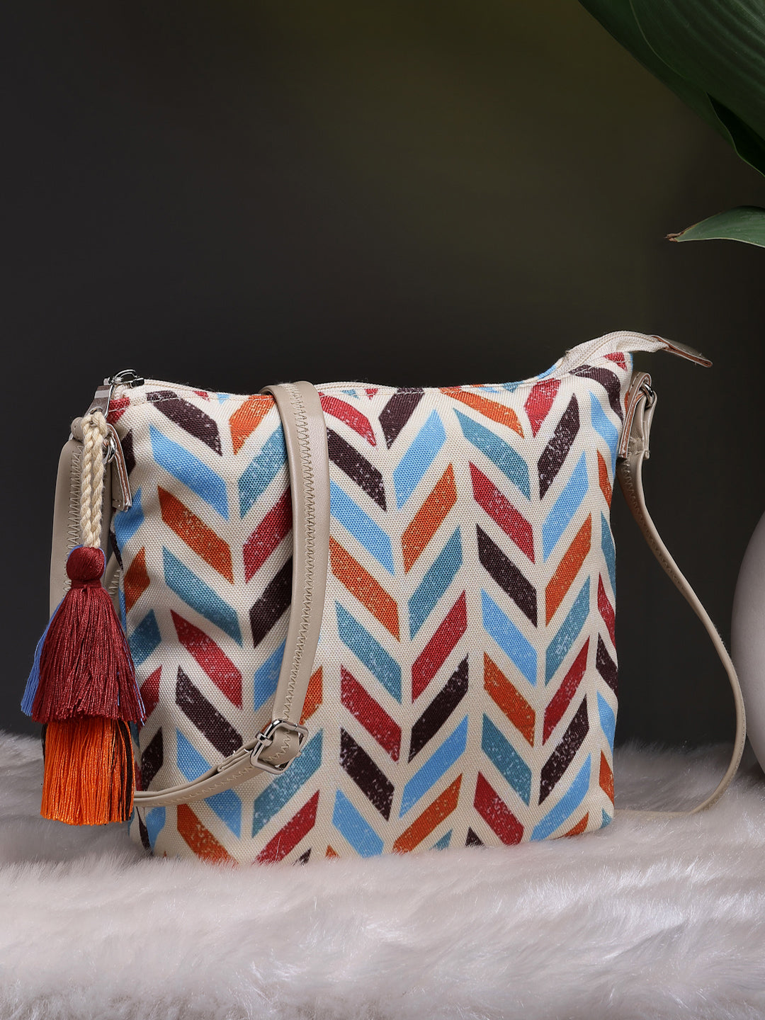 This floral digital printed sling bag is designed with polyester and leatherette material. This grey and multi color bag has been embellished with tassels keeping in mind the latest trends. It has a robust zip closure and adjustable zig-zag embroidered sling strap.It sports three main compartments adding one zip compartment and one mobile pocket inside.