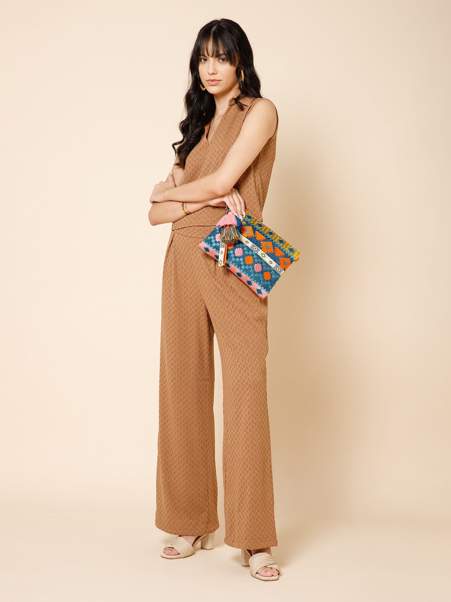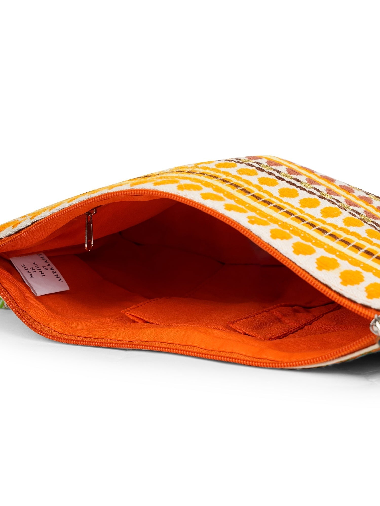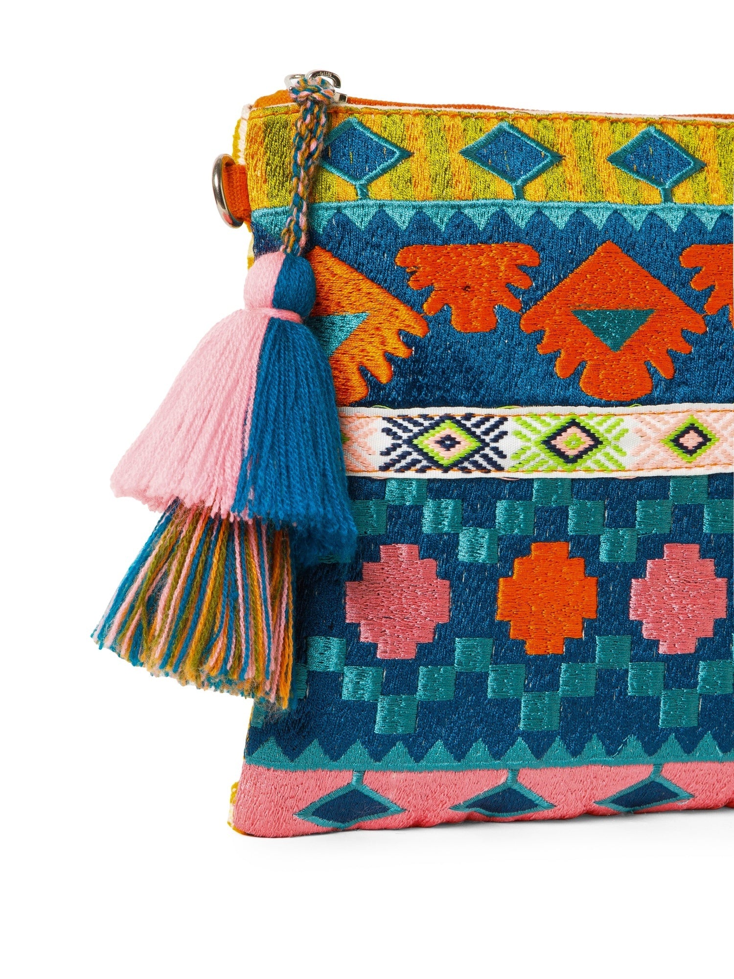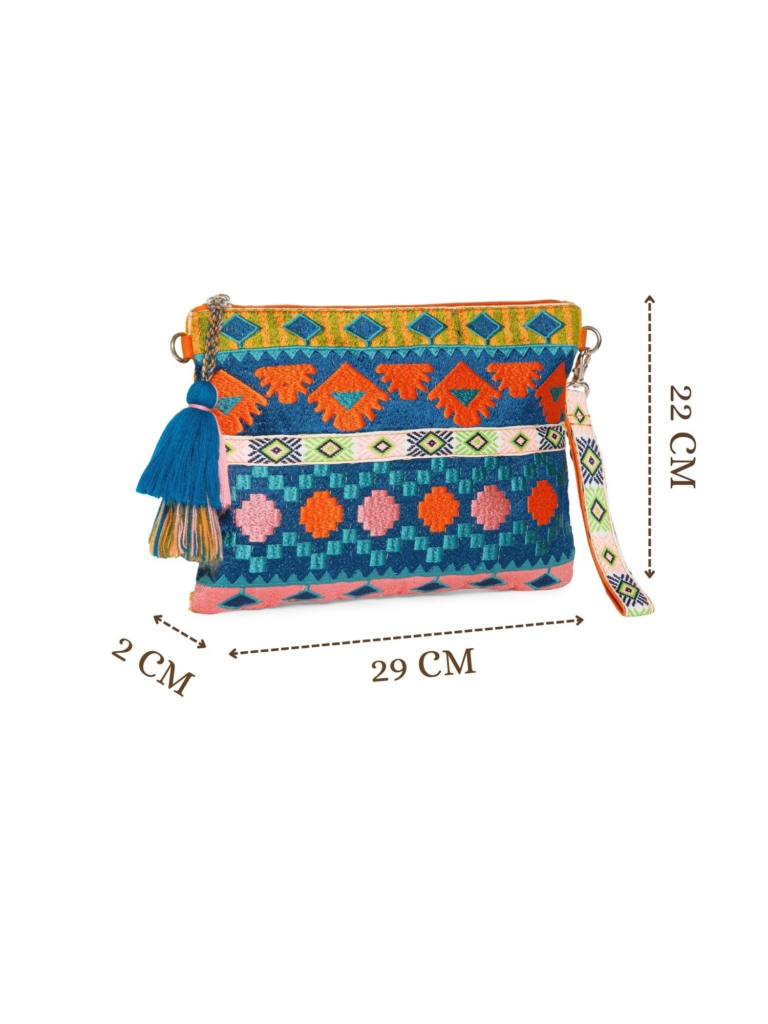 This Anekaant Sling Bag from the Tribal Collection is crafted in a vibrant palette of deep teal, burnt orange, blush pink, and bright lime green, highlighted with a coral strap and bright pink tassel accent. Showcasing ethnic motifs in a geometric, tribal-inspired woven design with diamond and traditional shapes, its detailed embroidery lends a rich artisanal appeal. Measuring 29 x 22 x 2 cm (L x H x W), this bag includes a main compartment secured with a zipper closure, one inner zip pocket for valuables, and one inner slip pocket for essentials. Designed with an adjustable, detachable sling strap and a detachable wrist loop, it offers versatile carrying options for both casual outings and festive occasions.