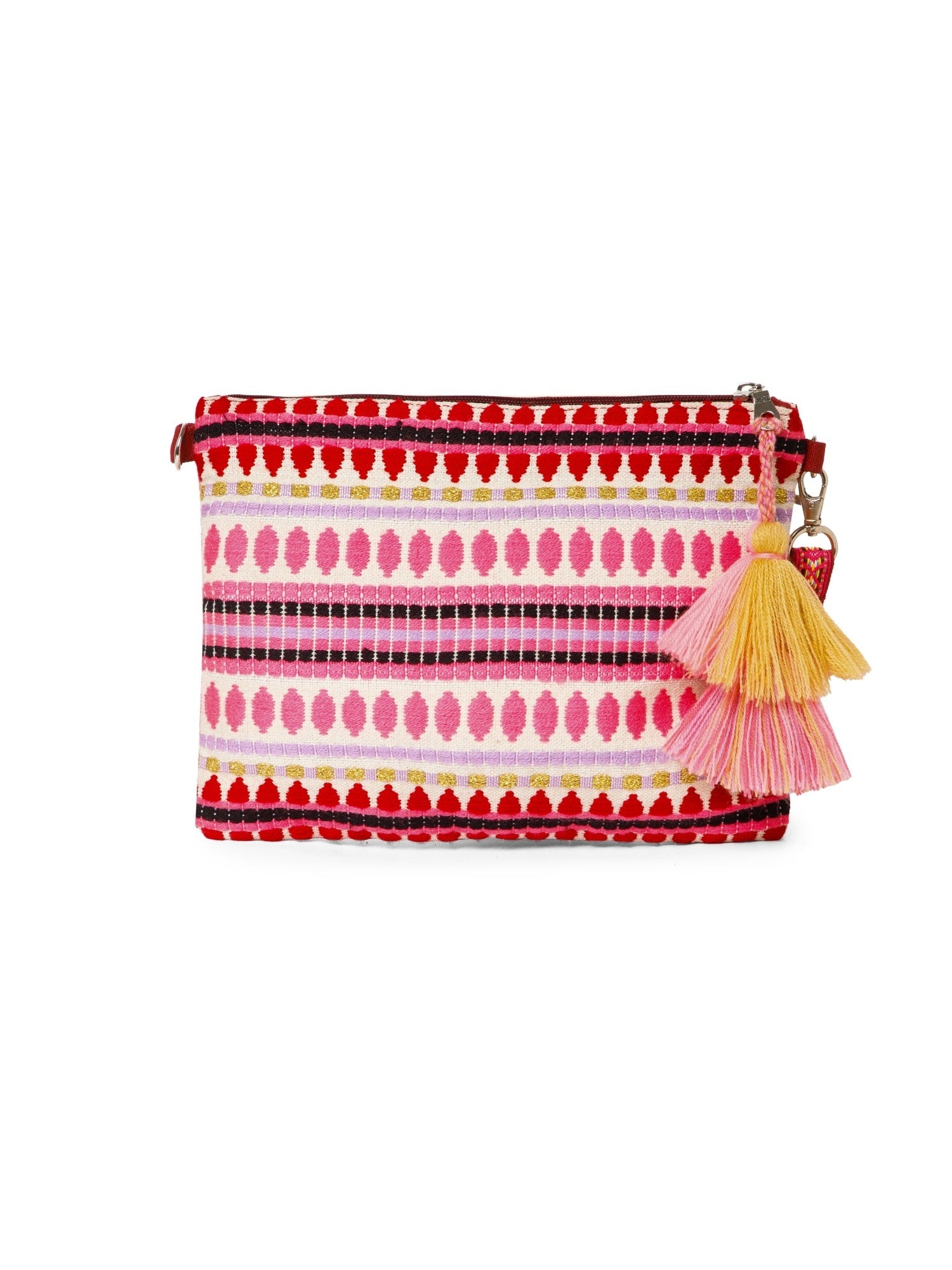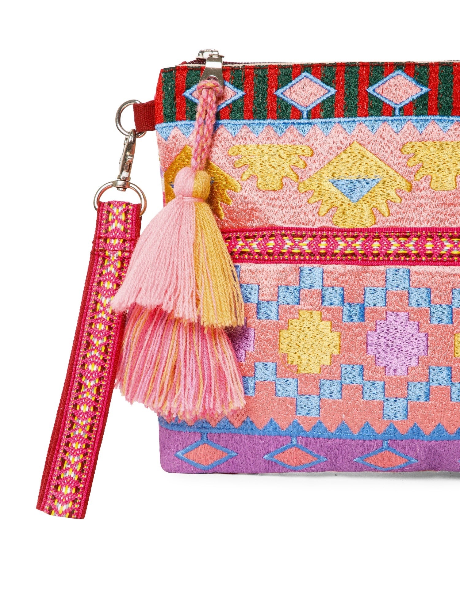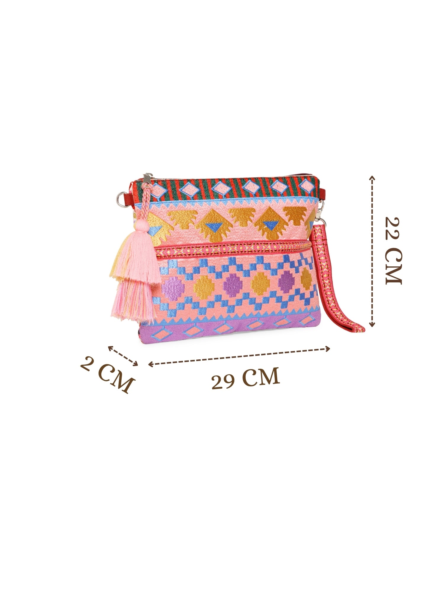 This Anekaant Sling Bag from the Tribal Collection is crafted in a vibrant mix of magenta, hot pink, mustard yellow, royal blue, and green, accented with a dark maroon strap and bright pink tassels. Showcasing ethnic motifs in a geometric, tribal-inspired woven design with diamond and traditional shapes, its detailed embroidery lends a rich artisanal appeal. Measuring 29 x 22 x 2 cm (L x H x W), this bag includes a main compartment secured with a zipper closure, one inner zip pocket for valuables, and one inner slip pocket for essentials. Designed with an adjustable, detachable sling strap and a detachable wrist loop, it offers versatile carrying options for both casual outings and festive occasions.