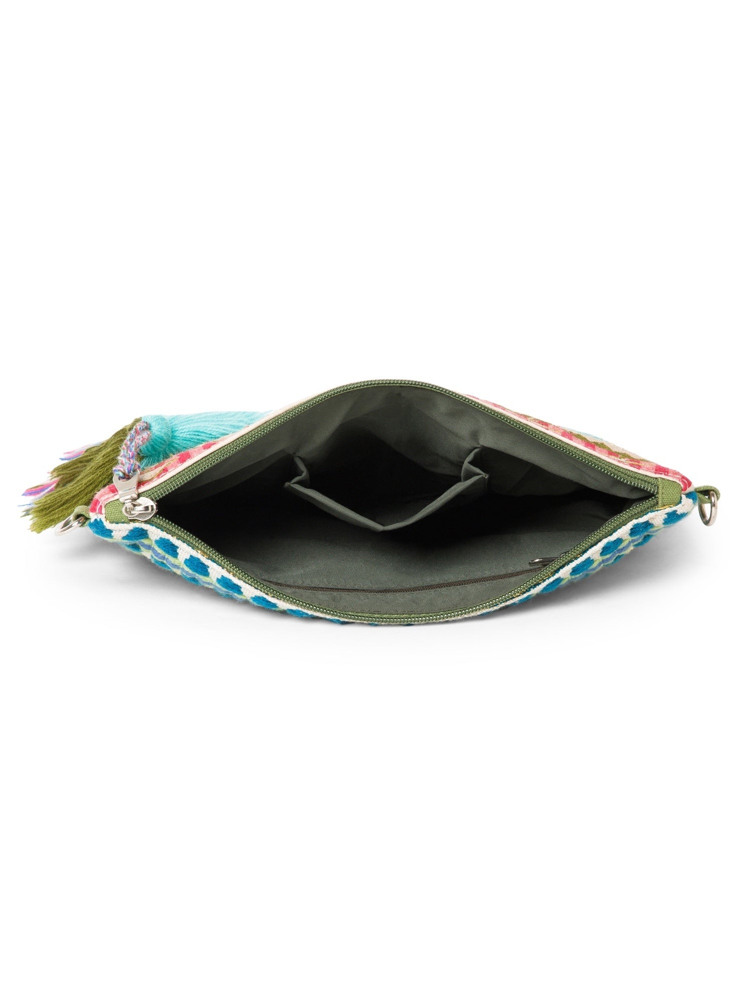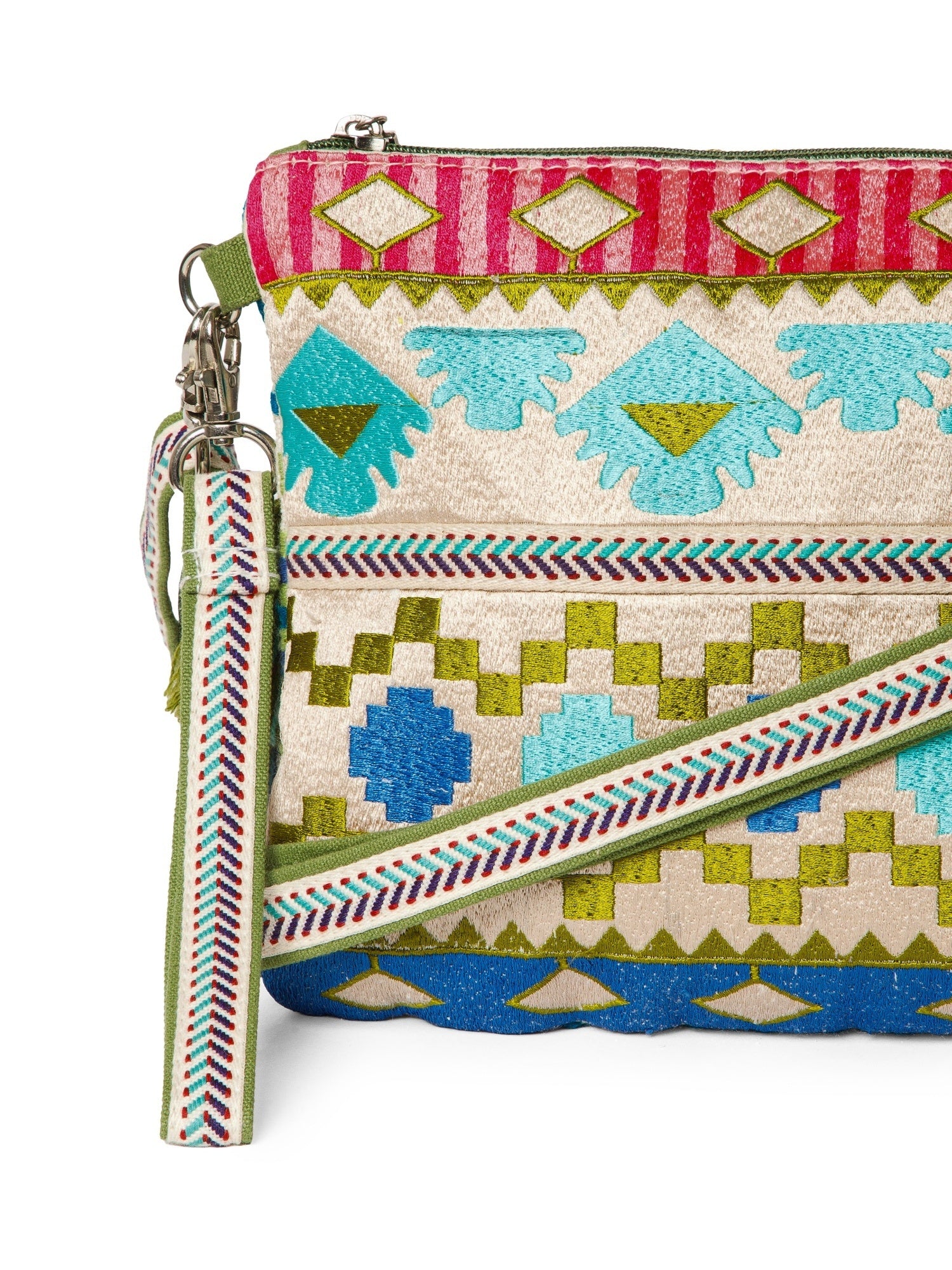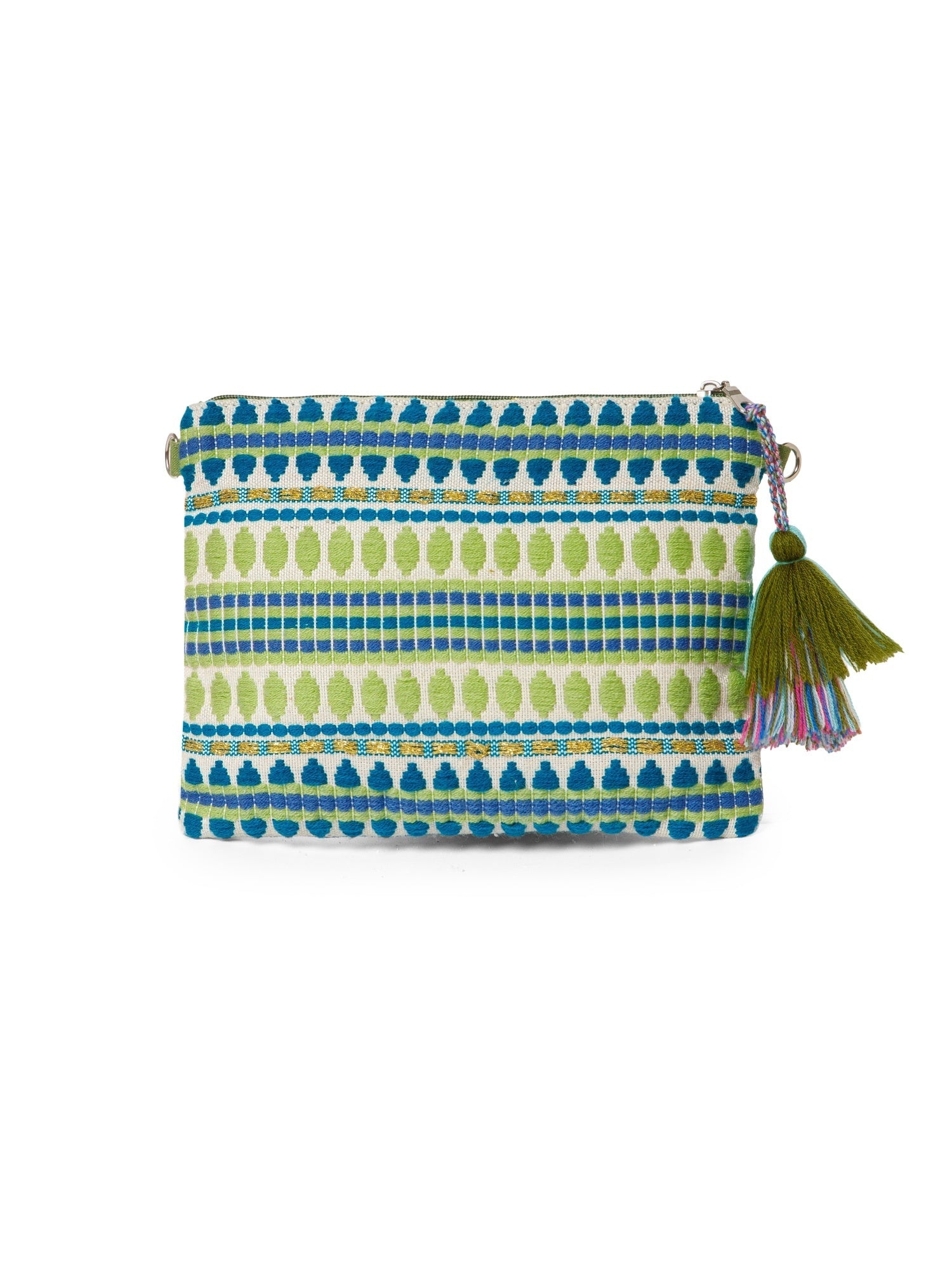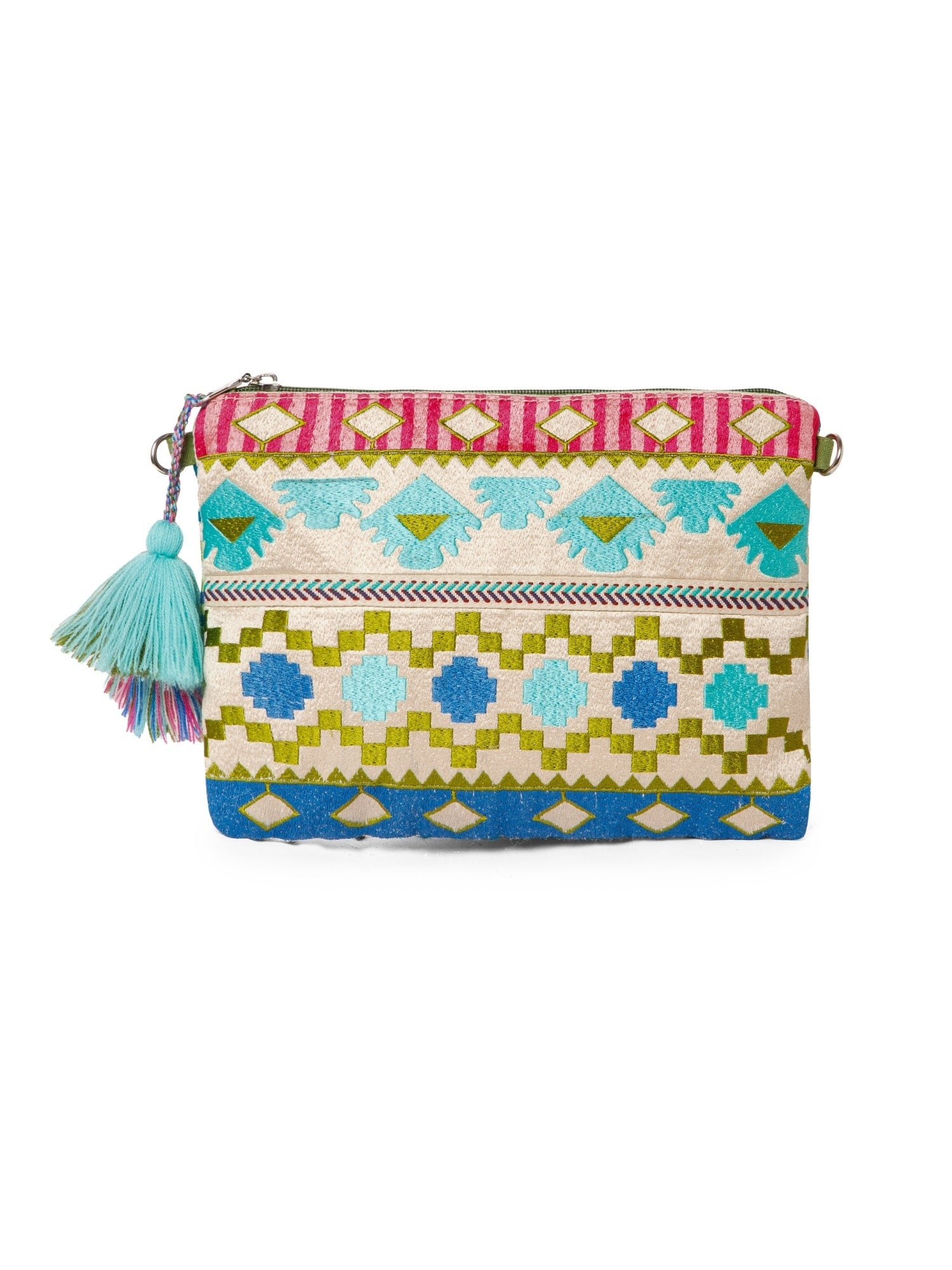 This Anekaant Sling Bag from the Tribal Collection is crafted in a vibrant mix of mint turquoise, olive green, beige gold, and deep royal blue, accented with a green strap and multicolored tassels. Showcasing ethnic motifs in a geometric, tribal-inspired woven design with diamond and traditional shapes, its detailed embroidery lends a rich artisanal appeal. Measuring 29 x 22 x 2 cm (L x H x W), this bag includes a main compartment secured with a zipper closure, one inner zip pocket for valuables, and one inner slip pocket for essentials. Designed with an adjustable, detachable sling strap and a detachable wrist loop, it offers versatile carrying options for both casual outings and festive occasions.