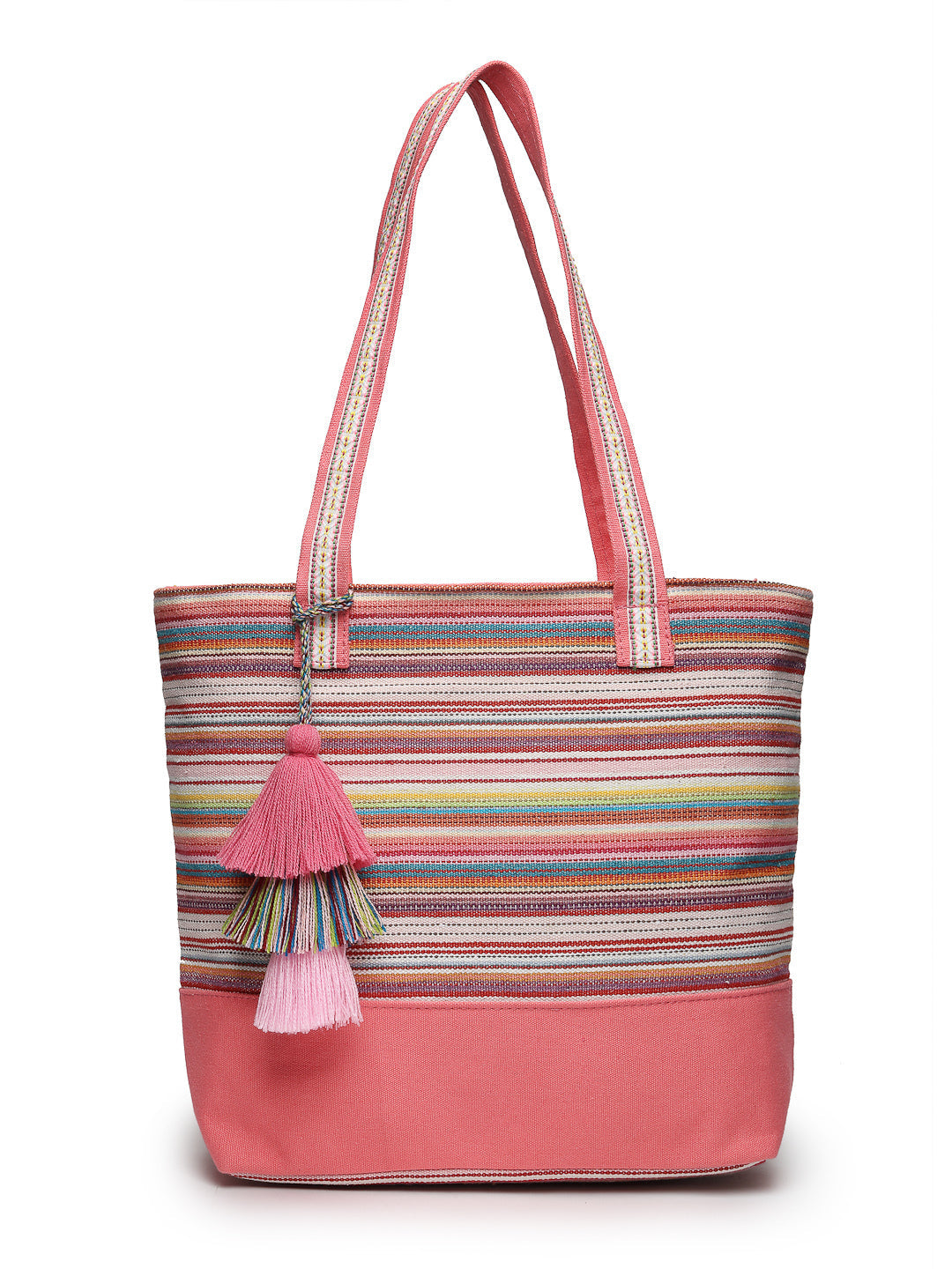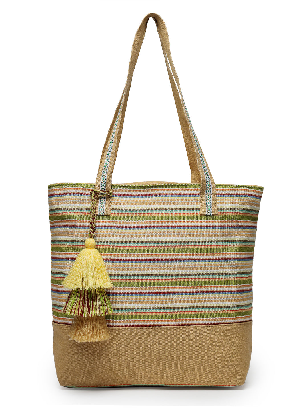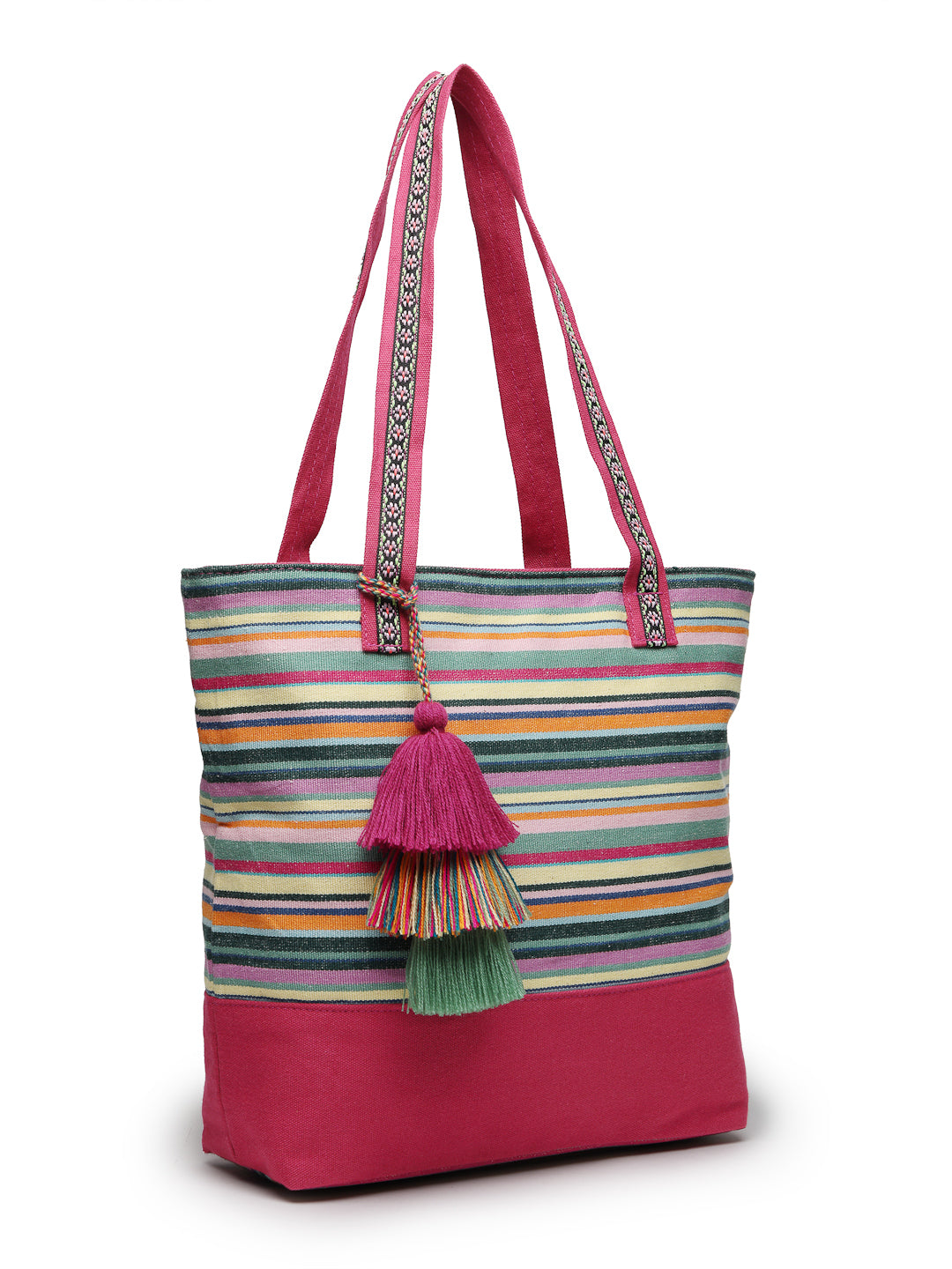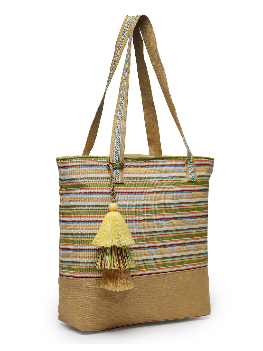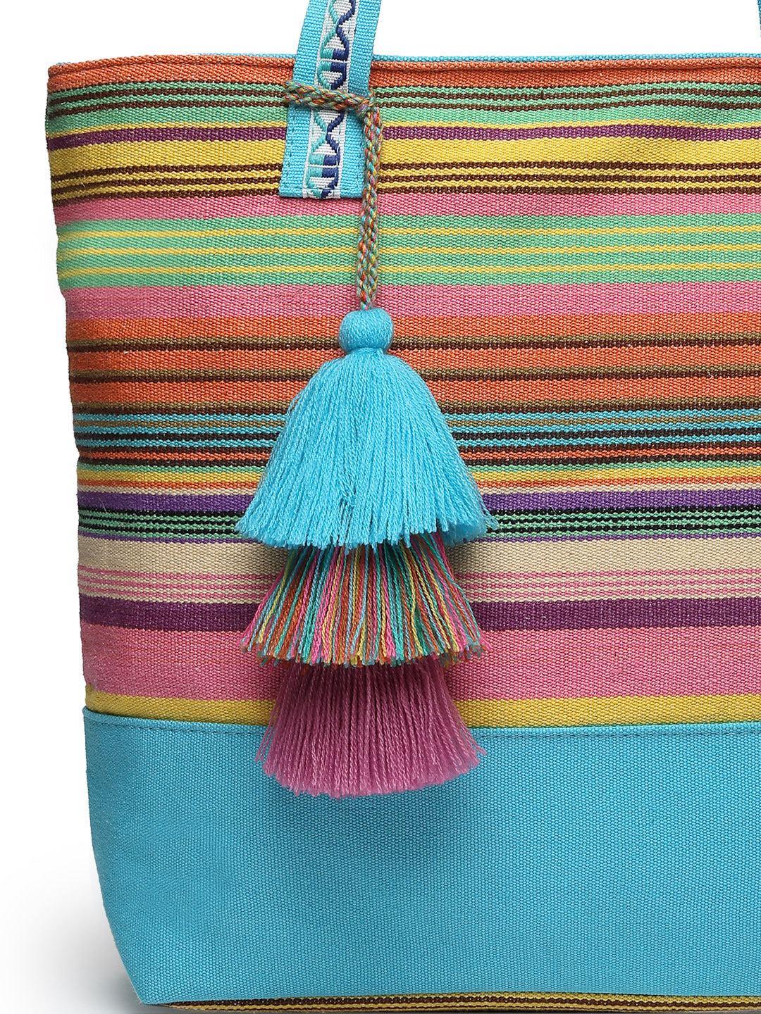 Tote Bag from Our latest Eco- friendly collection - a stylish and versatile accessory that is perfect for adding a pop of color to your outfit. It is Crafted from high-quality cotton canvas which fearures a Striped jacuqard design decorated with tassels. It has one main compartment secured with a zip closure. It has one zip pocket and a mobile patch pocket inside and a zip pocket on the outside which provides ample space to keep your essentials organized. The two convenient handles make it easy to carry around all day.