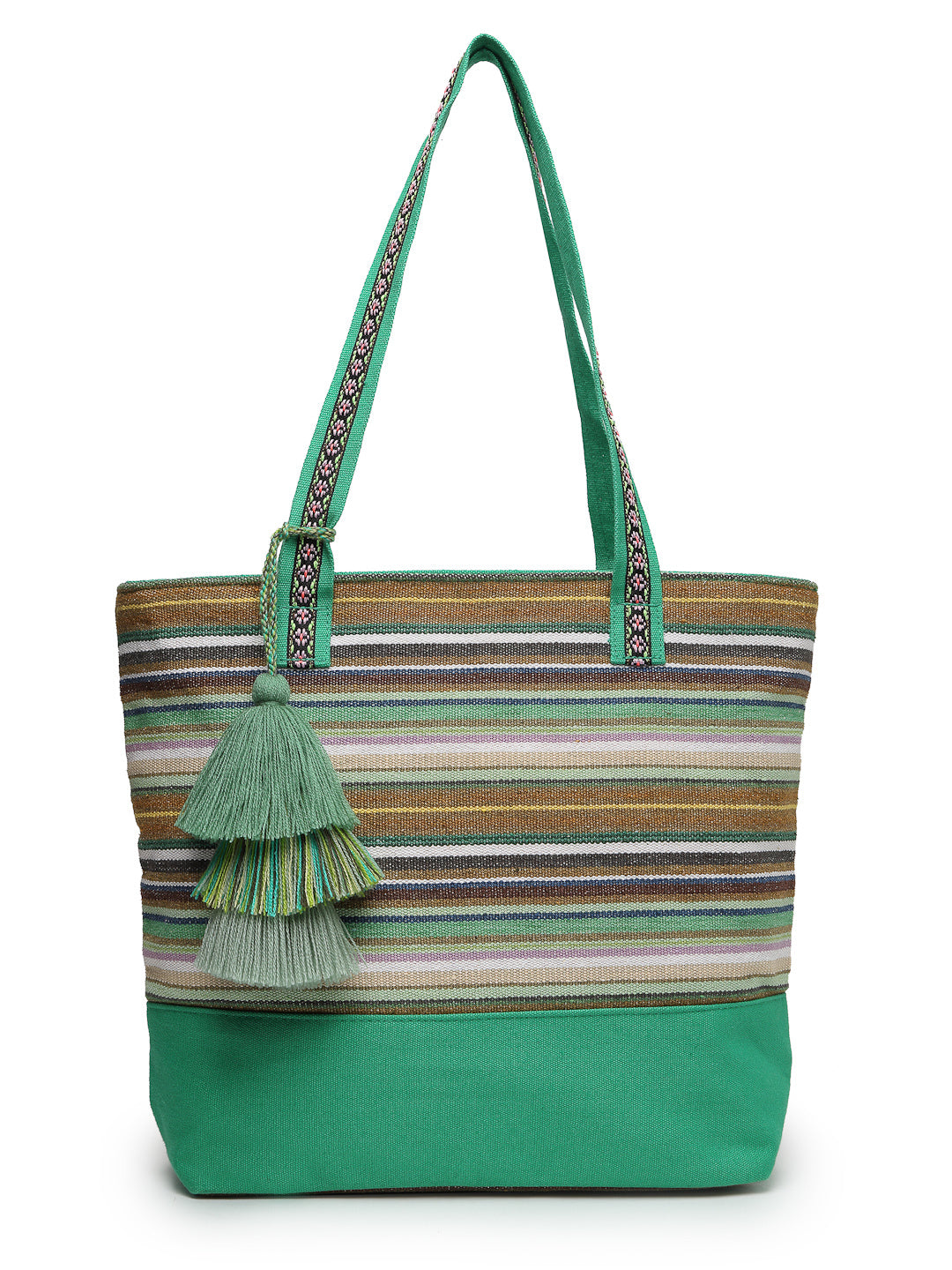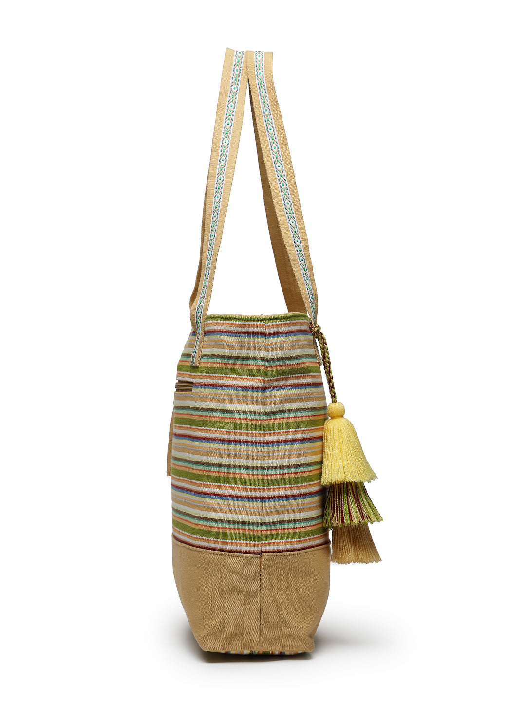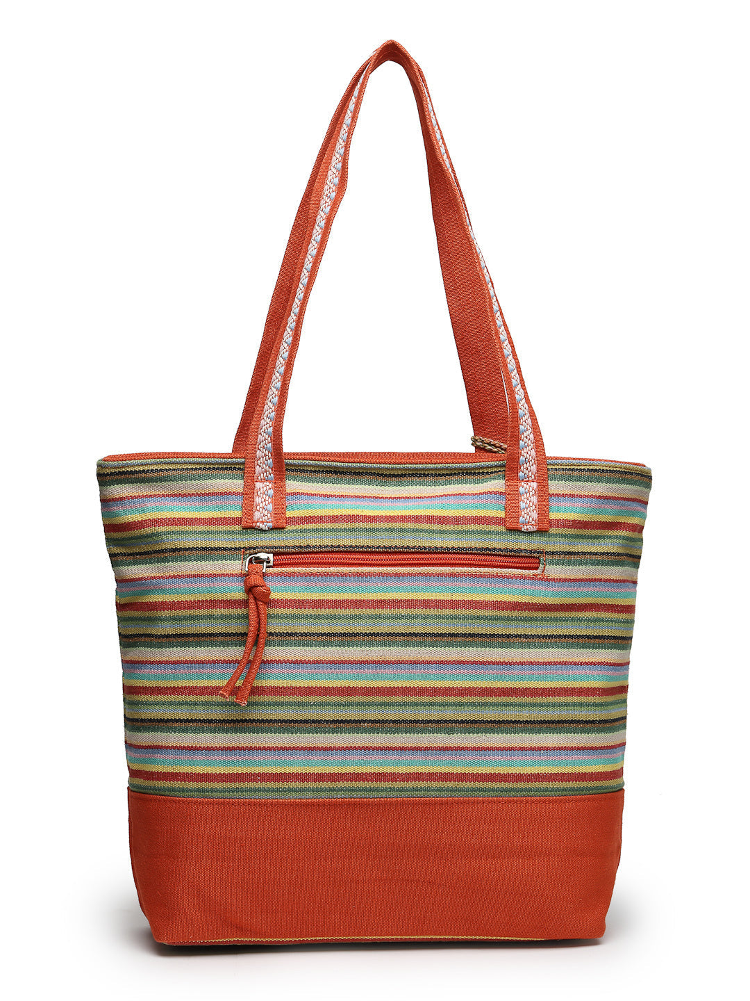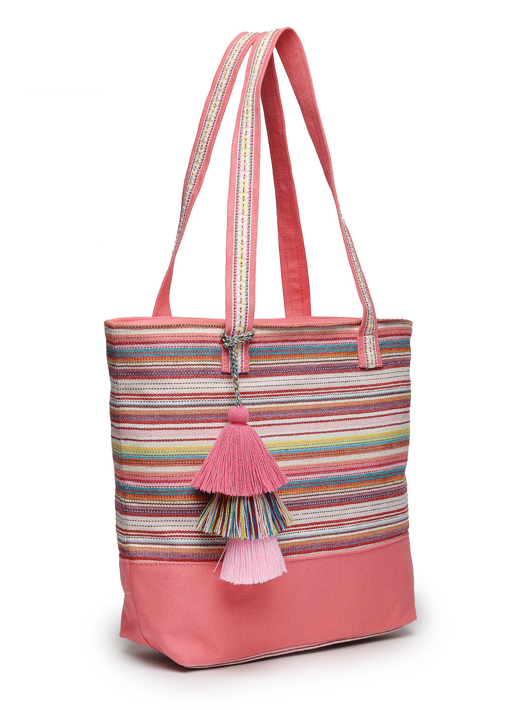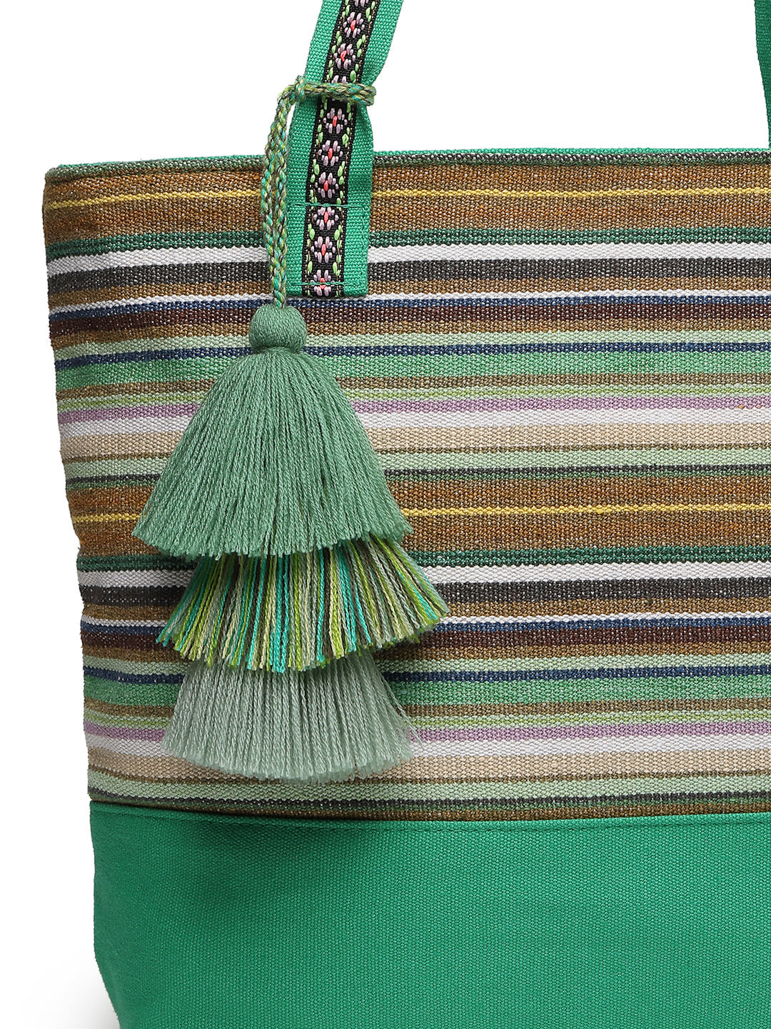 Tote Bag from Our latest Eco- friendly collection - a stylish and versatile accessory that is perfect for adding a pop of color to your outfit. It is Crafted from high-quality cotton canvas which fearures a Striped jacuqard design decorated with tassels. It has one main compartment secured with a zip closure. It has one zip pocket and a mobile patch pocket inside and a zip pocket on the outside which provides ample space to keep your essentials organized. The two convenient handles make it easy to carry around all day.
