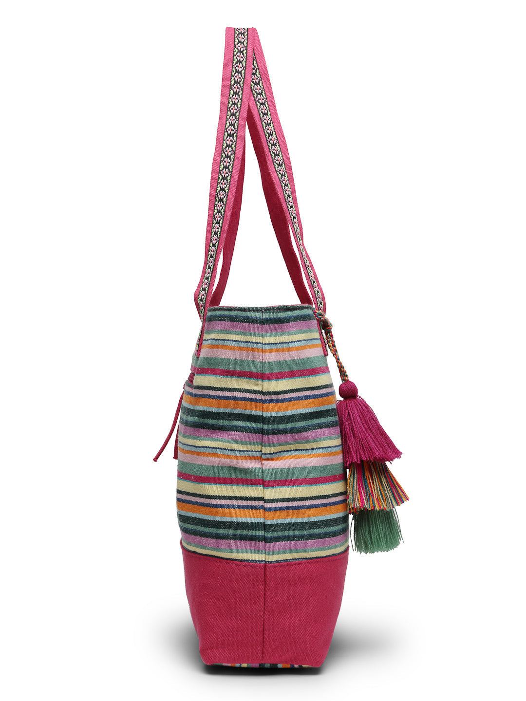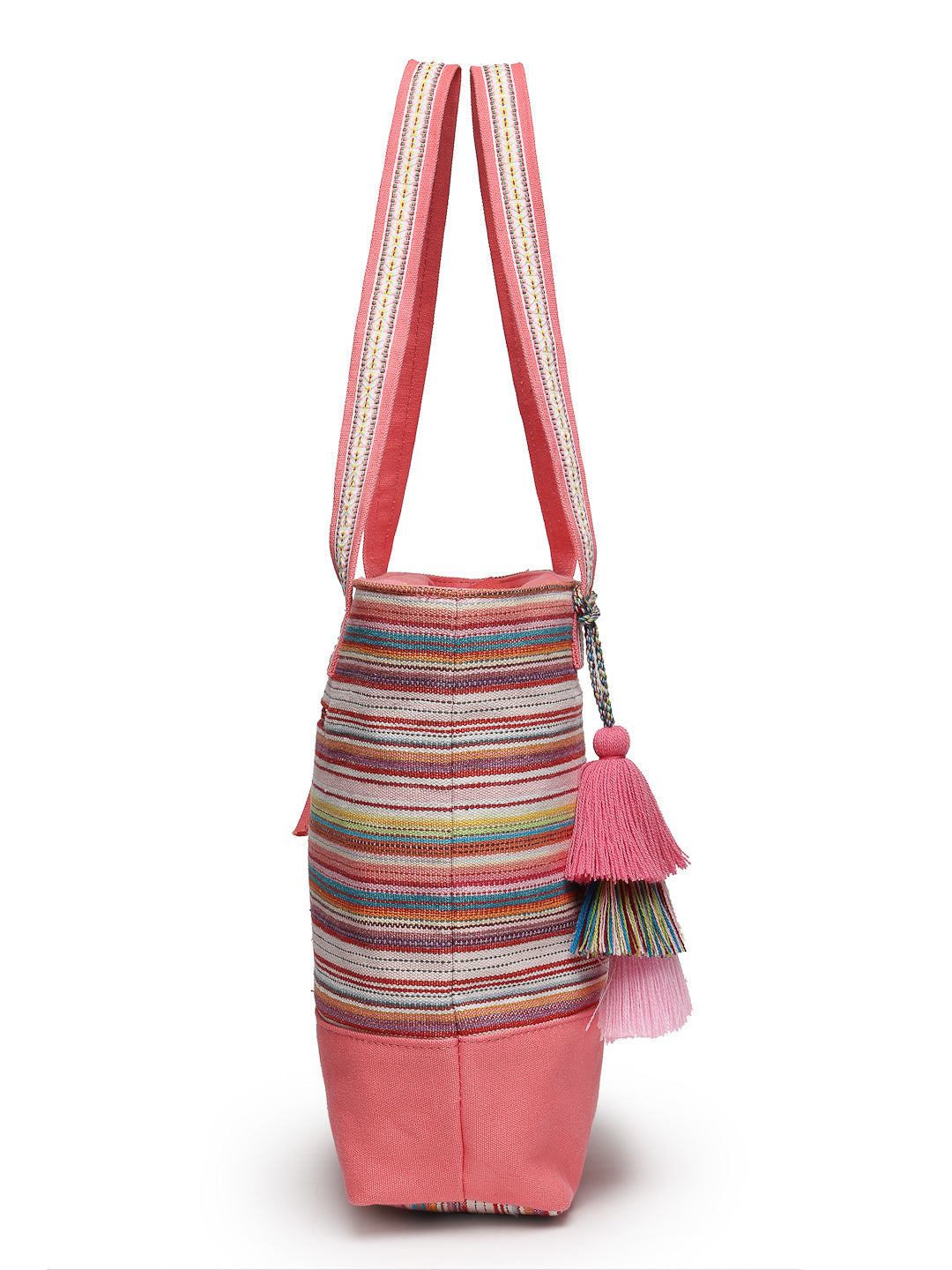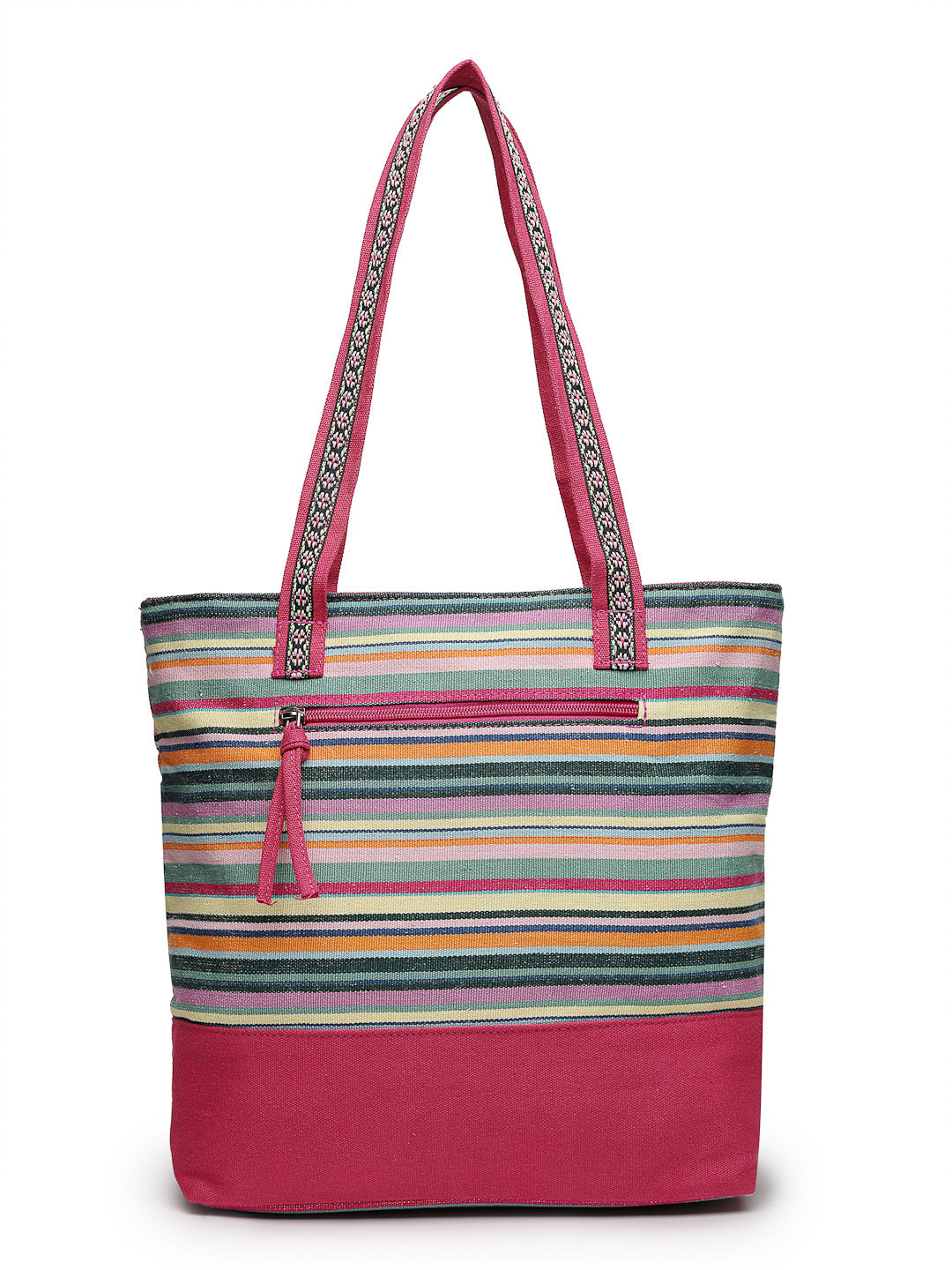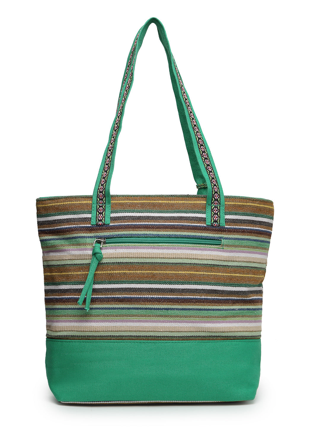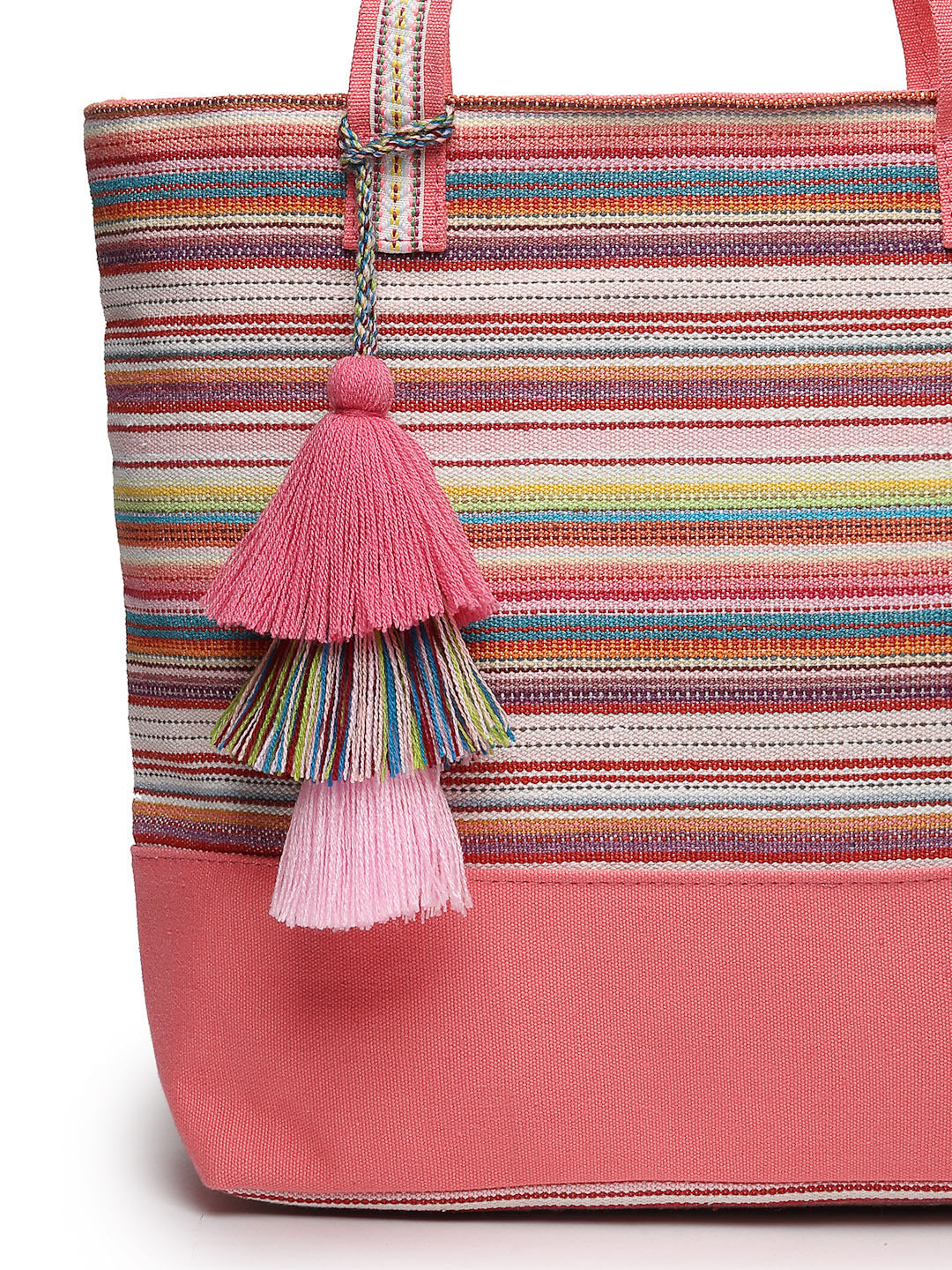 Tote Bag from Our latest Eco- friendly collection - a stylish and versatile accessory that is perfect for adding a pop of color to your outfit. It is Crafted from high-quality cotton canvas which fearures a Striped jacuqard design decorated with tassels. It has one main compartment secured with a zip closure. It has one zip pocket and a mobile patch pocket inside and a zip pocket on the outside which provides ample space to keep your essentials organized. The two convenient handles make it easy to carry around all day.