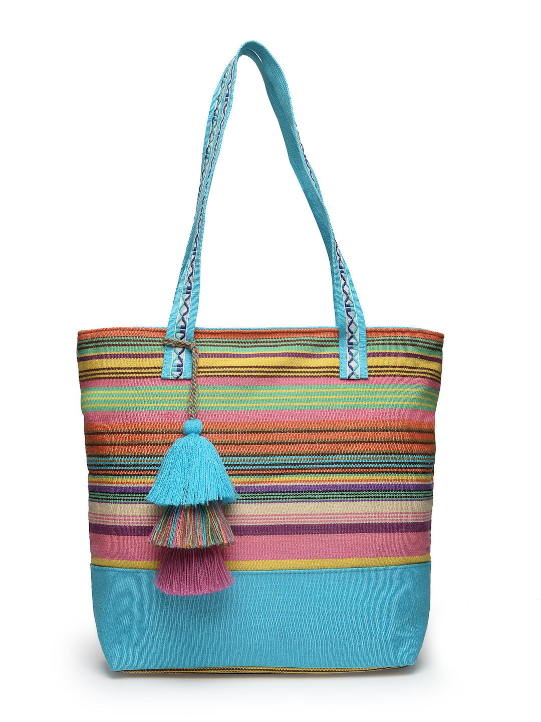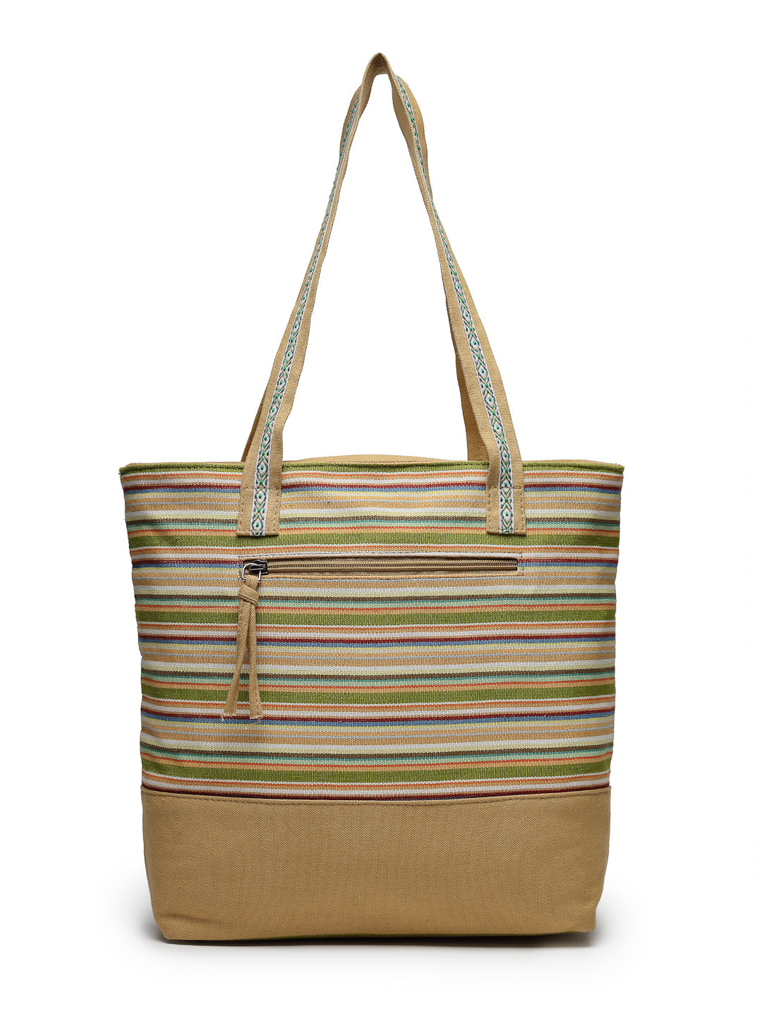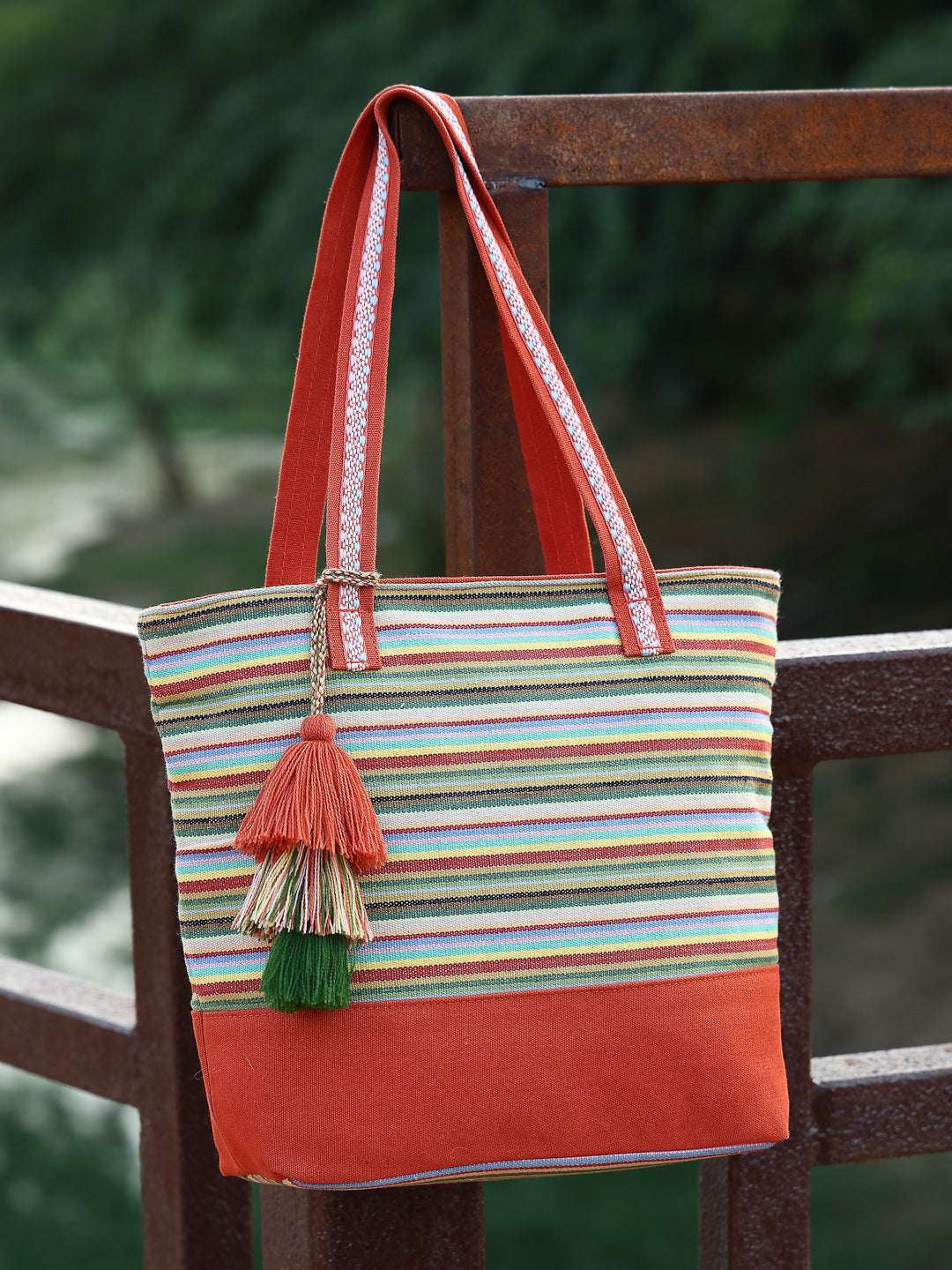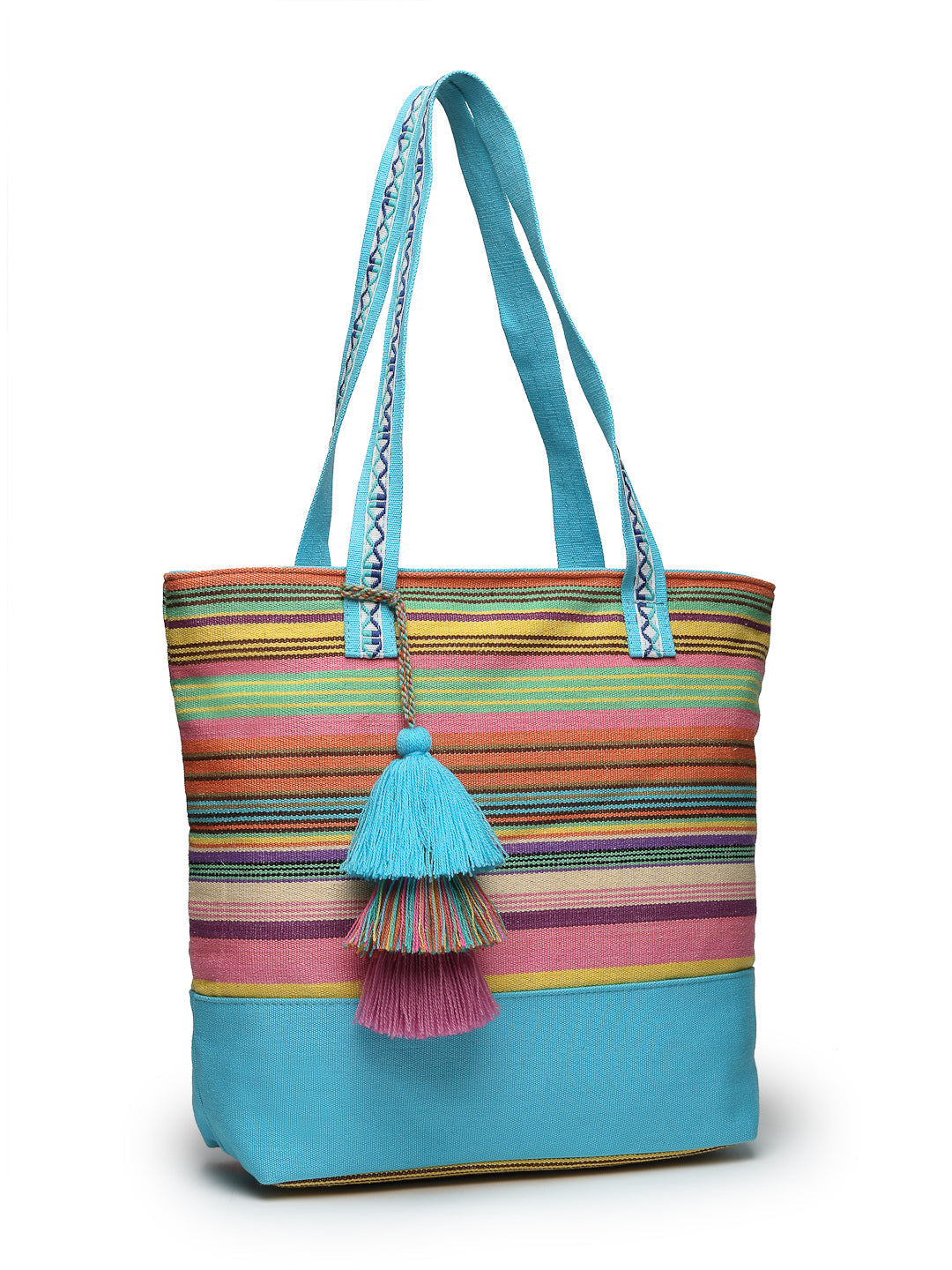 Tote Bag from Our latest Eco- friendly collection - a stylish and versatile accessory that is perfect for adding a pop of color to your outfit. It is Crafted from high-quality cotton canvas which fearures a Striped jacuqard design decorated with tassels. It has one main compartment secured with a zip closure. It has one zip pocket and a mobile patch pocket inside and a zip pocket on the outside which provides ample space to keep your essentials organized. The two convenient handles make it easy to carry around all day.