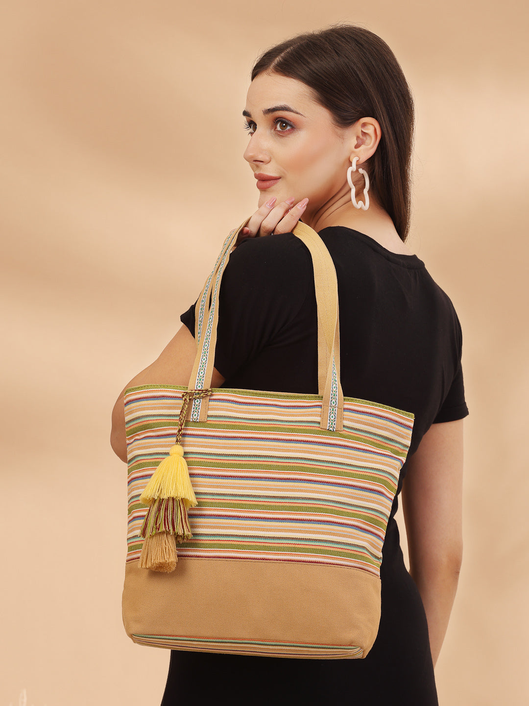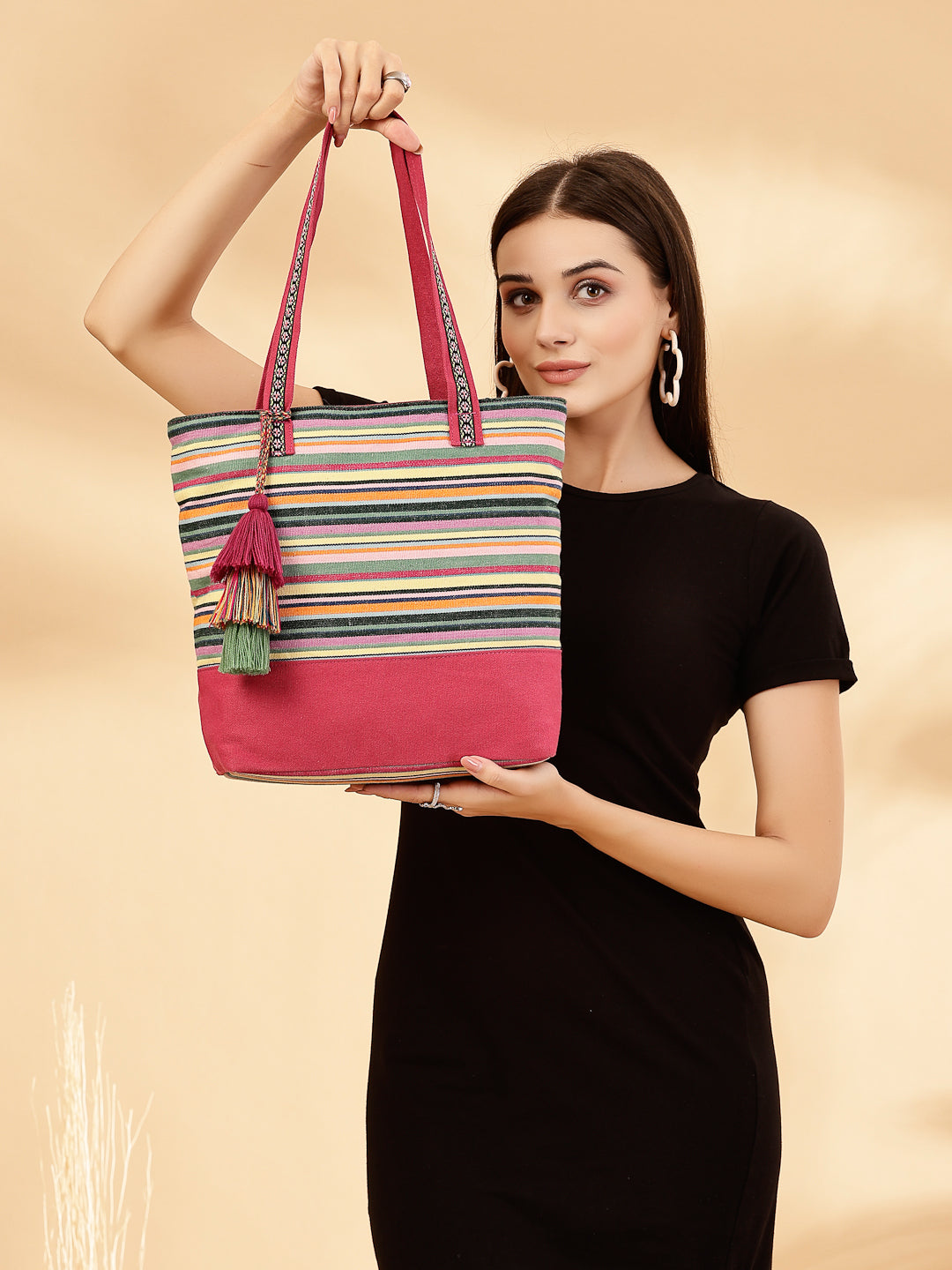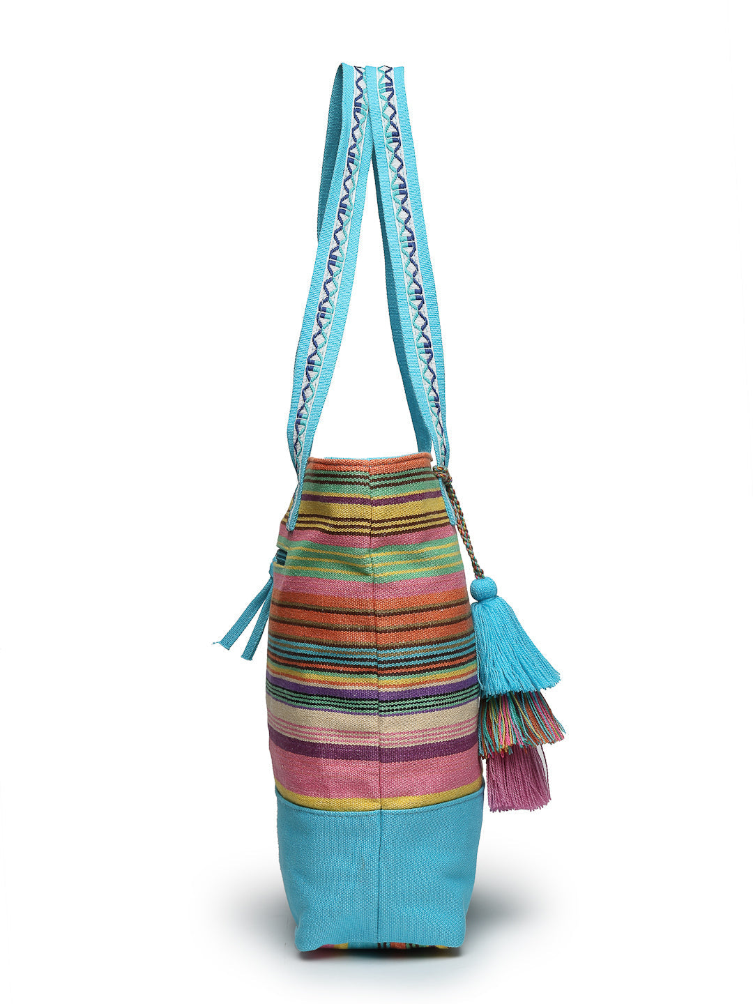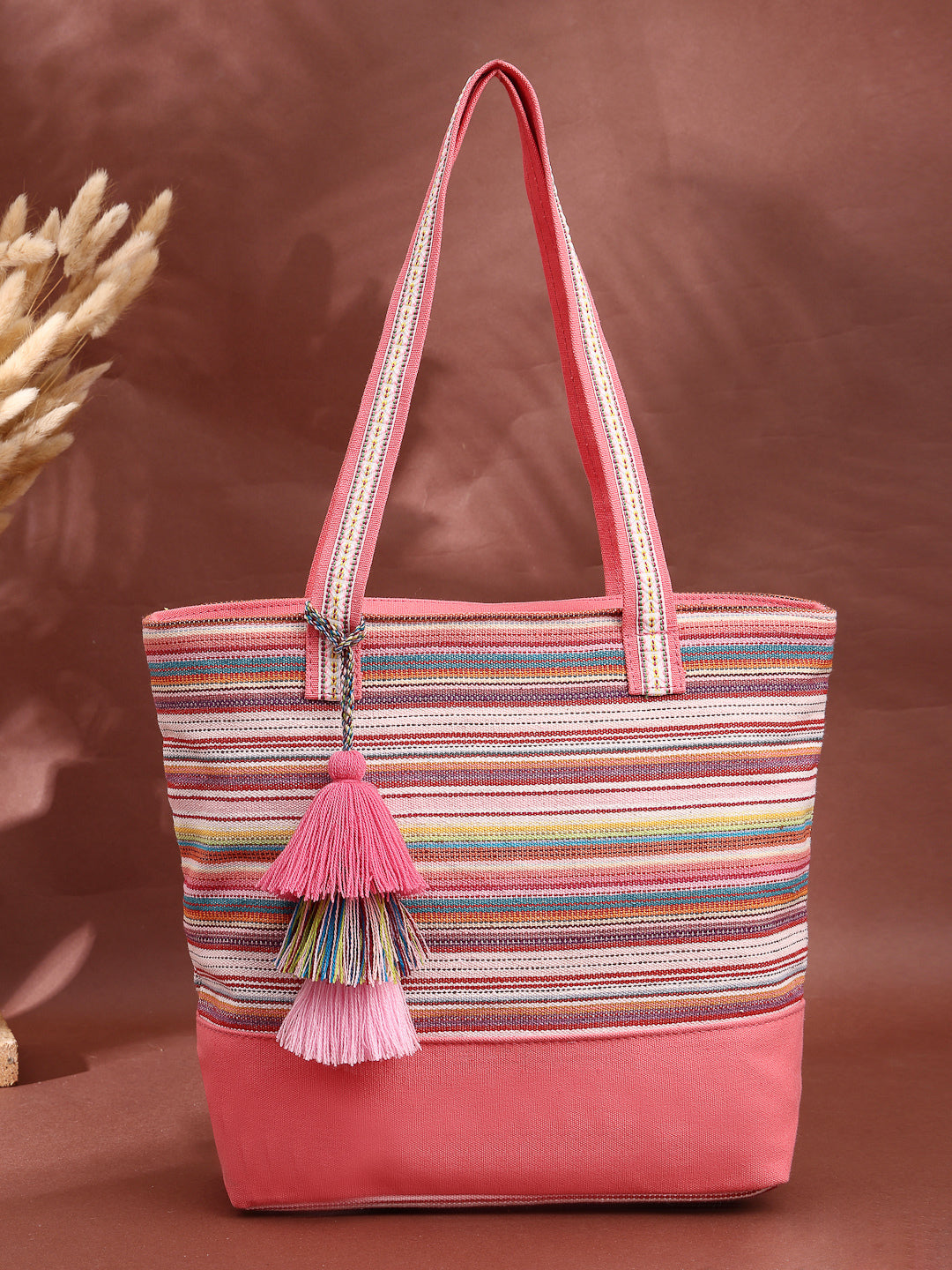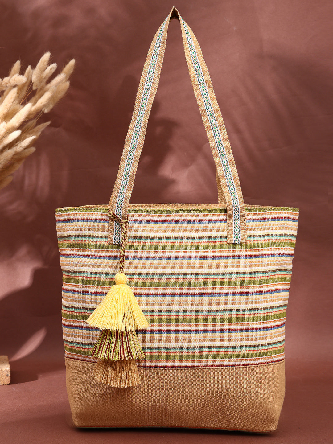 Tote Bag from Our latest Eco- friendly collection - a stylish and versatile accessory that is perfect for adding a pop of color to your outfit. It is Crafted from high-quality cotton canvas which fearures a Striped jacuqard design decorated with tassels. It has one main compartment secured with a zip closure. It has one zip pocket and a mobile patch pocket inside and a zip pocket on the outside which provides ample space to keep your essentials organized. The two convenient handles make it easy to carry around all day.
