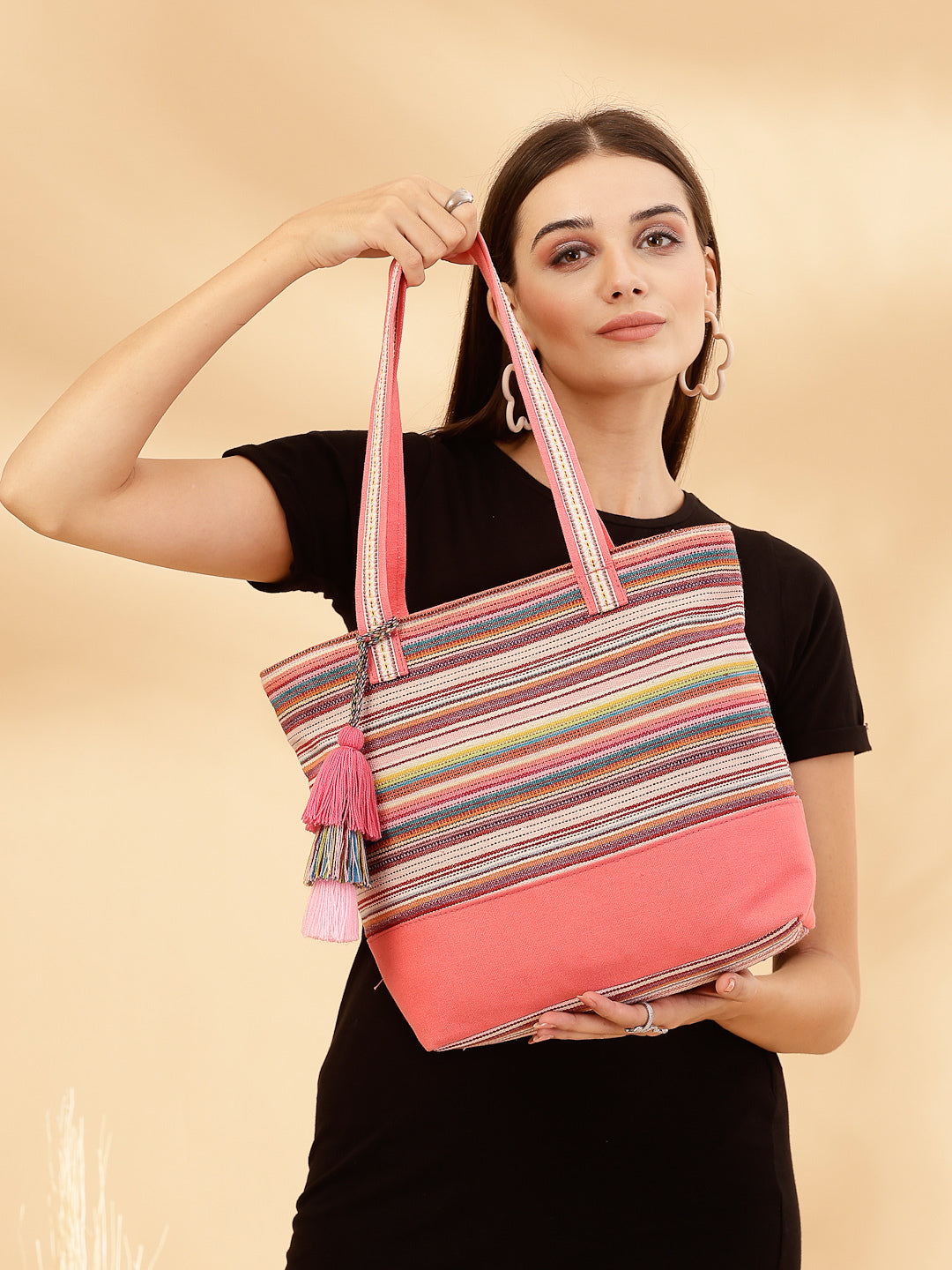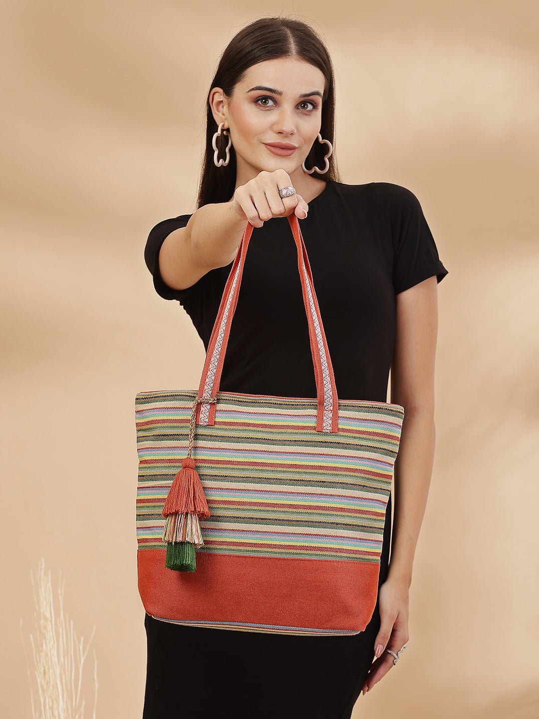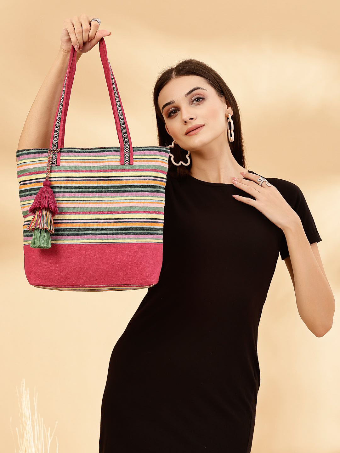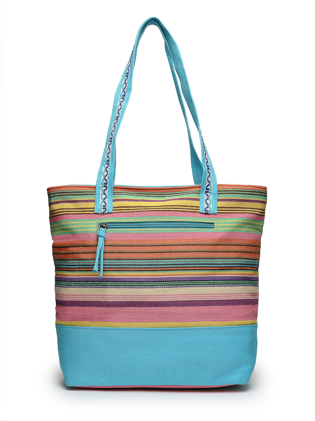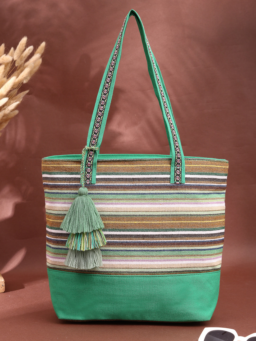 Tote Bag from Our latest Eco- friendly collection - a stylish and versatile accessory that is perfect for adding a pop of color to your outfit. It is Crafted from high-quality cotton canvas which fearures a Striped jacuqard design decorated with tassels. It has one main compartment secured with a zip closure. It has one zip pocket and a mobile patch pocket inside and a zip pocket on the outside which provides ample space to keep your essentials organized. The two convenient handles make it easy to carry around all day.