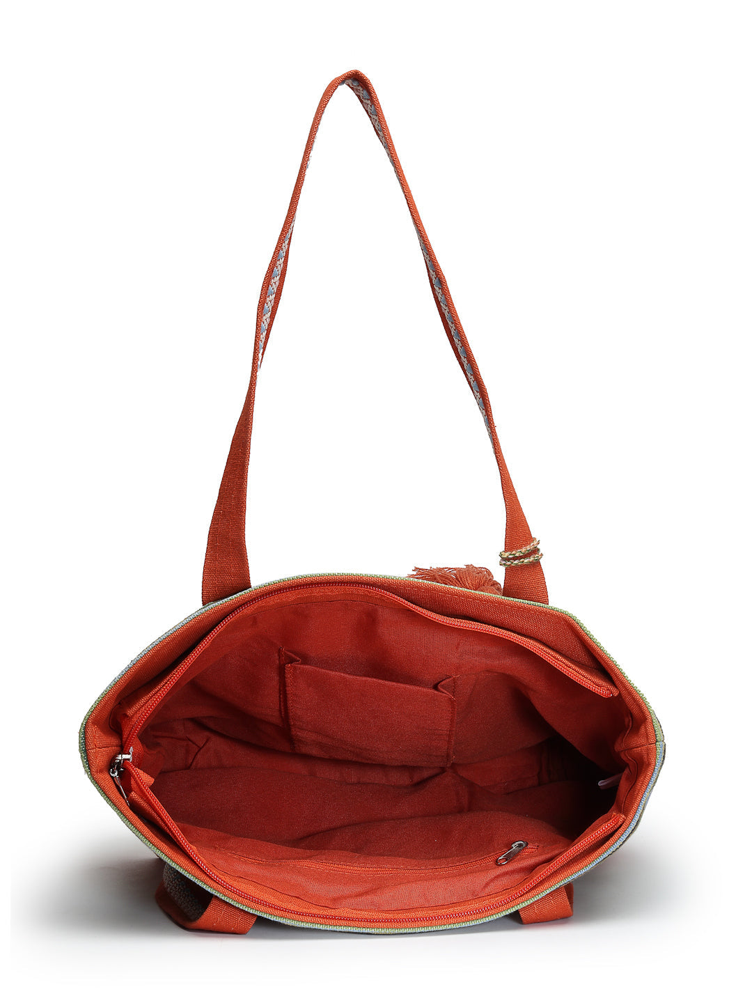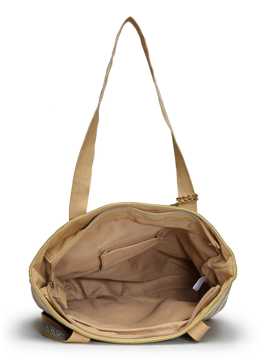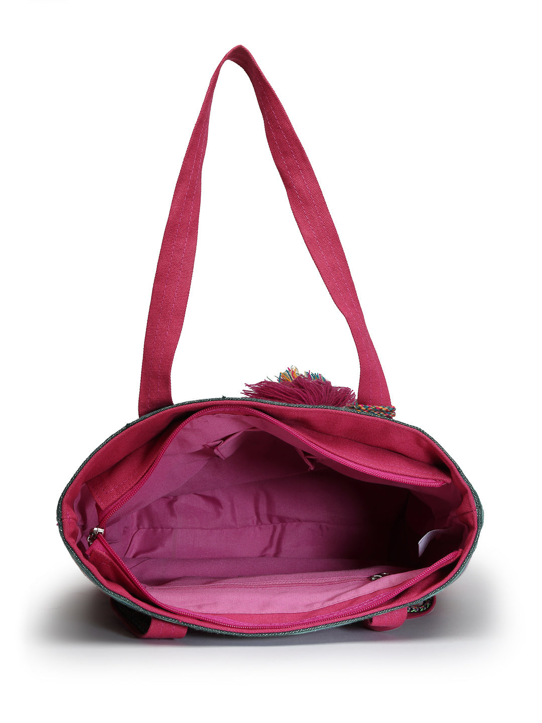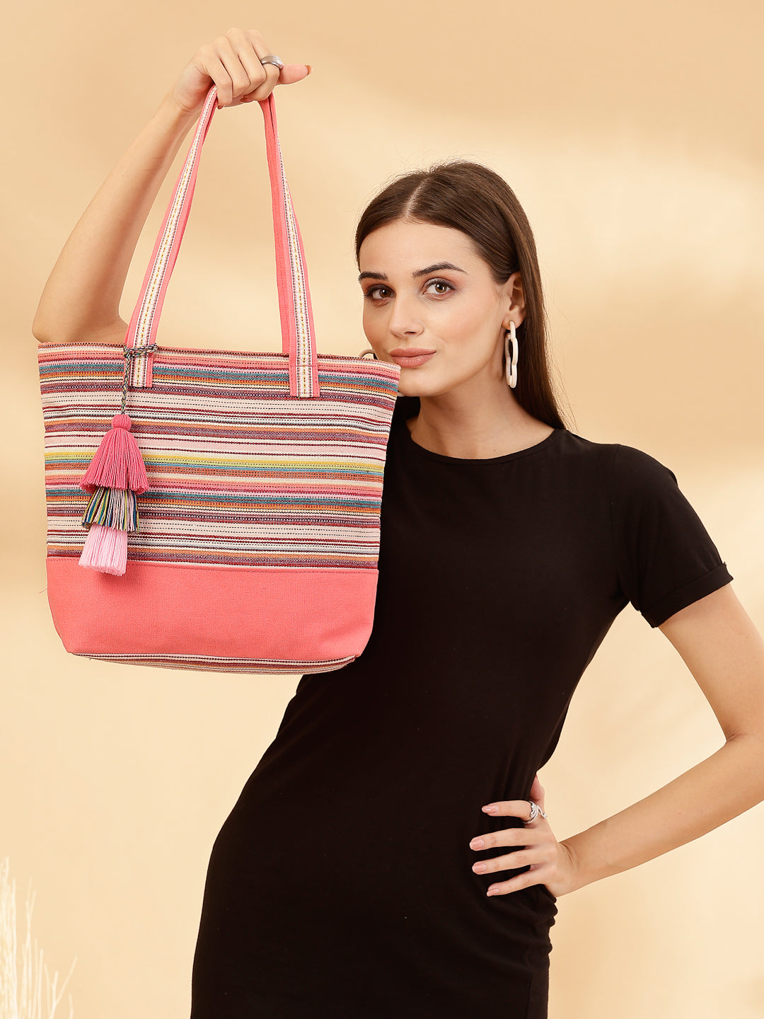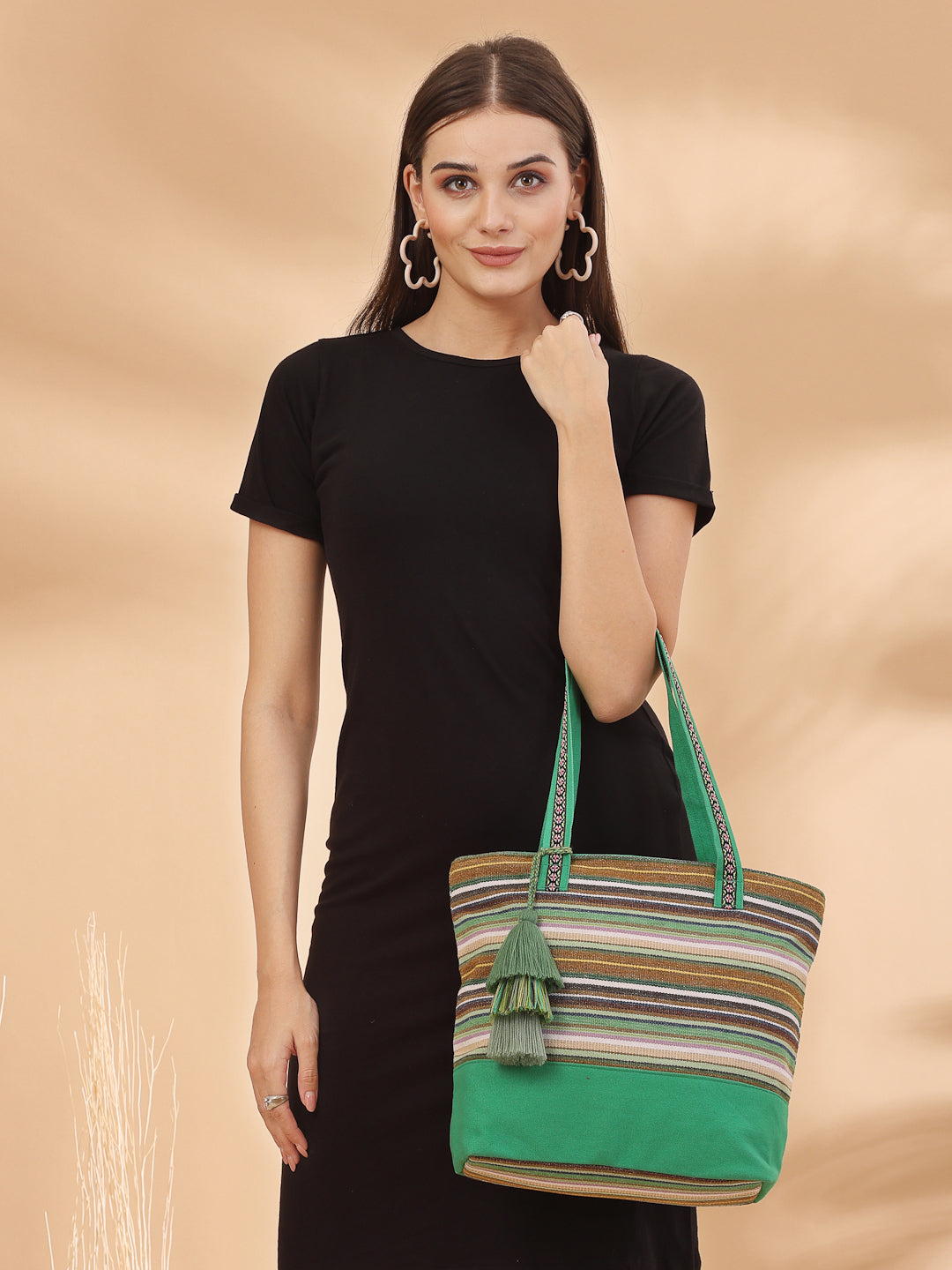 Tote Bag from Our latest Eco- friendly collection - a stylish and versatile accessory that is perfect for adding a pop of color to your outfit. It is Crafted from high-quality cotton canvas which fearures a Striped jacuqard design decorated with tassels. It has one main compartment secured with a zip closure. It has one zip pocket and a mobile patch pocket inside and a zip pocket on the outside which provides ample space to keep your essentials organized. The two convenient handles make it easy to carry around all day.