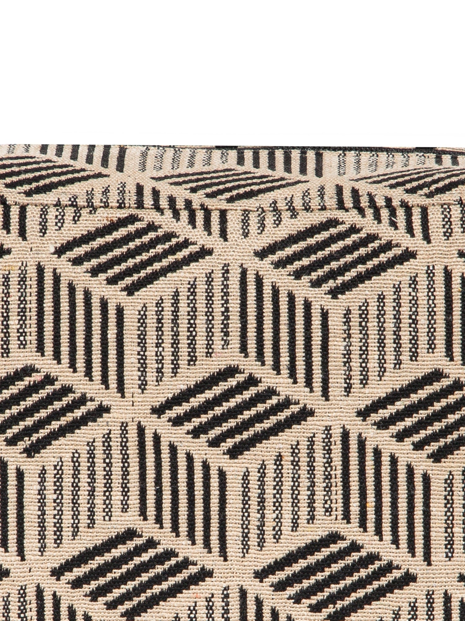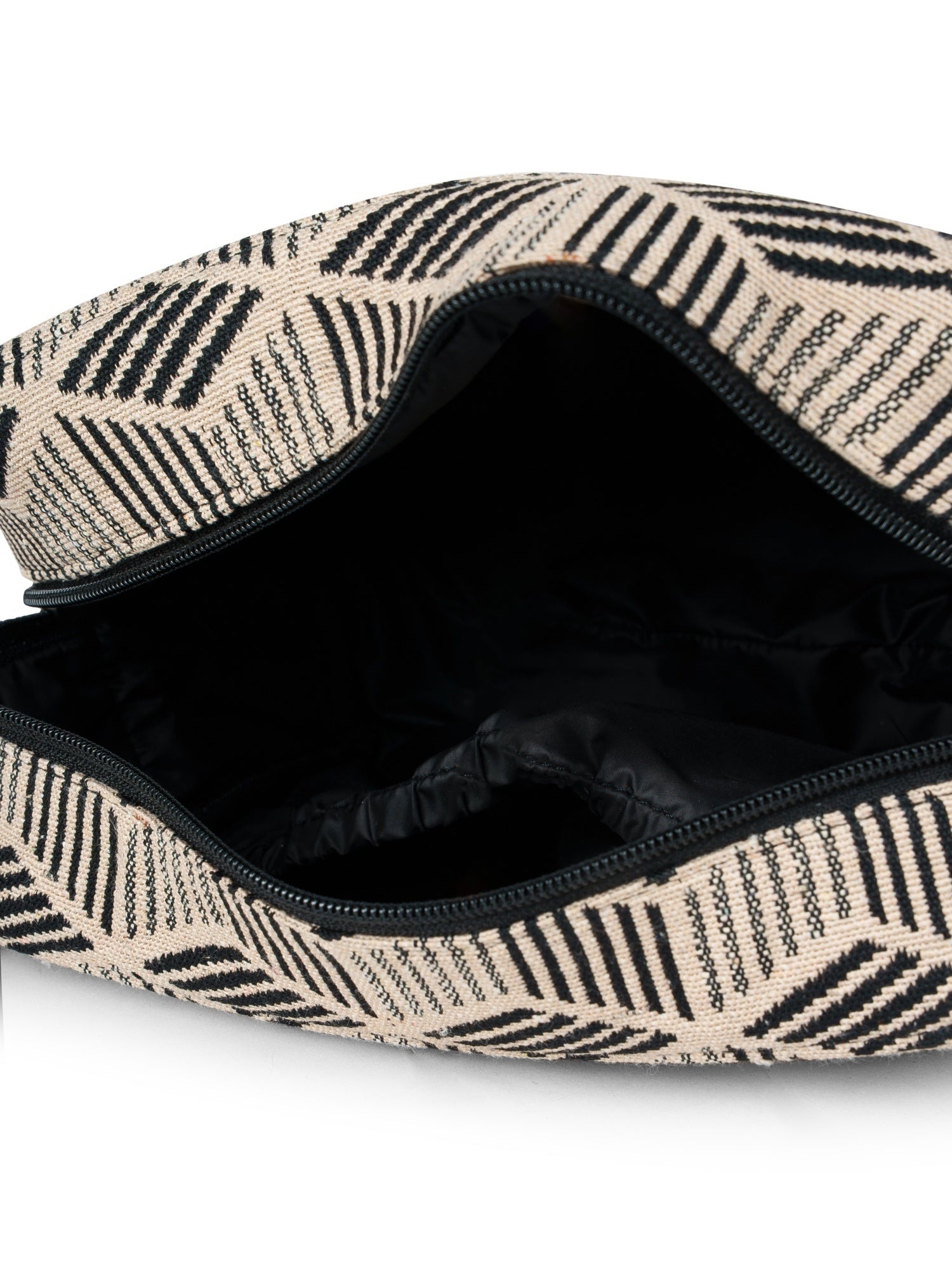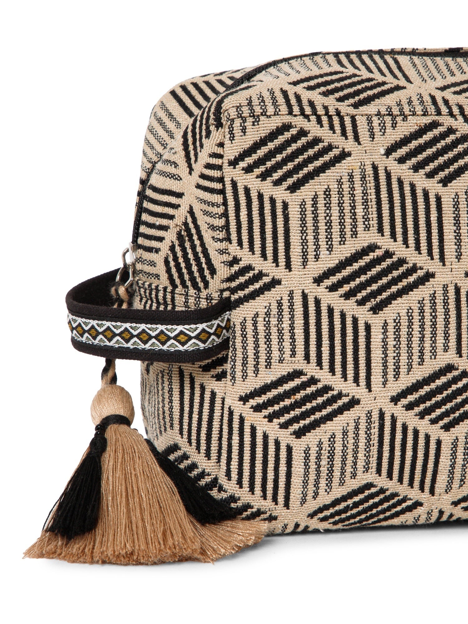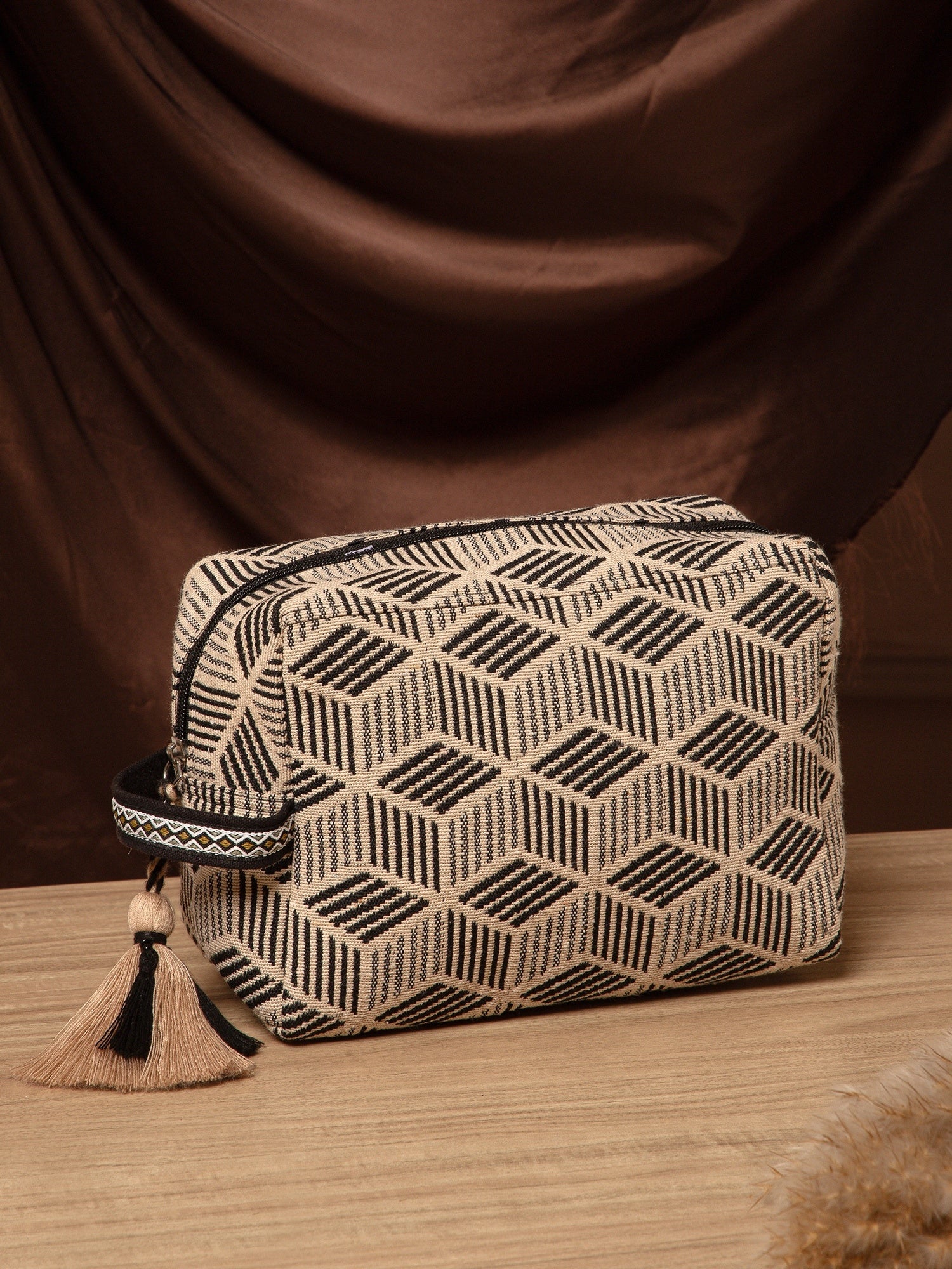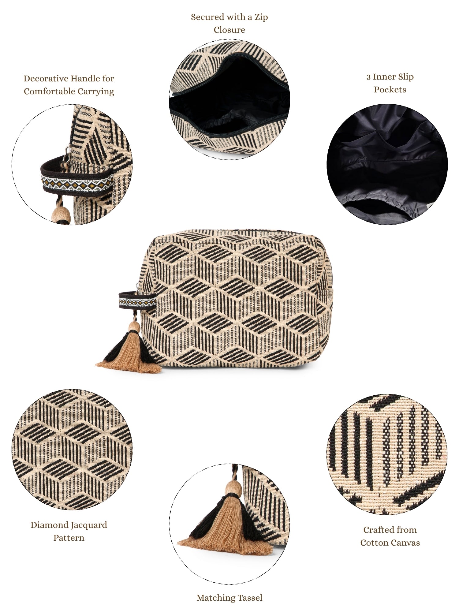 This Anekaant Travel Accessory Bag from the Tribal Collection is designed in Beige & Black, crafted from premium Cotton Canvas with a durable polyester lining. The intricate Diamond Jacquard pattern lends it a refined, artisanal appeal. It offers one main compartment with a secure zip closure, an inner mobile pocket for easy phone access, and two patch pockets for storing AirPods, medicines, keys, and other essentials. Accented with matching tassels and a decorative handle, this bag combines style with functionality. Dimensions (L x H x W): 22 x 16 x 10 cm.