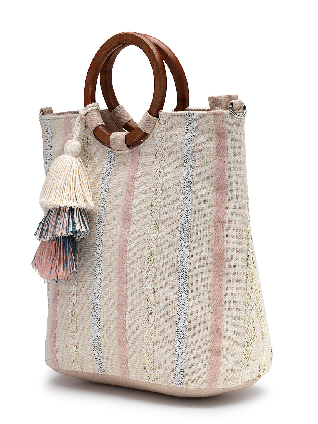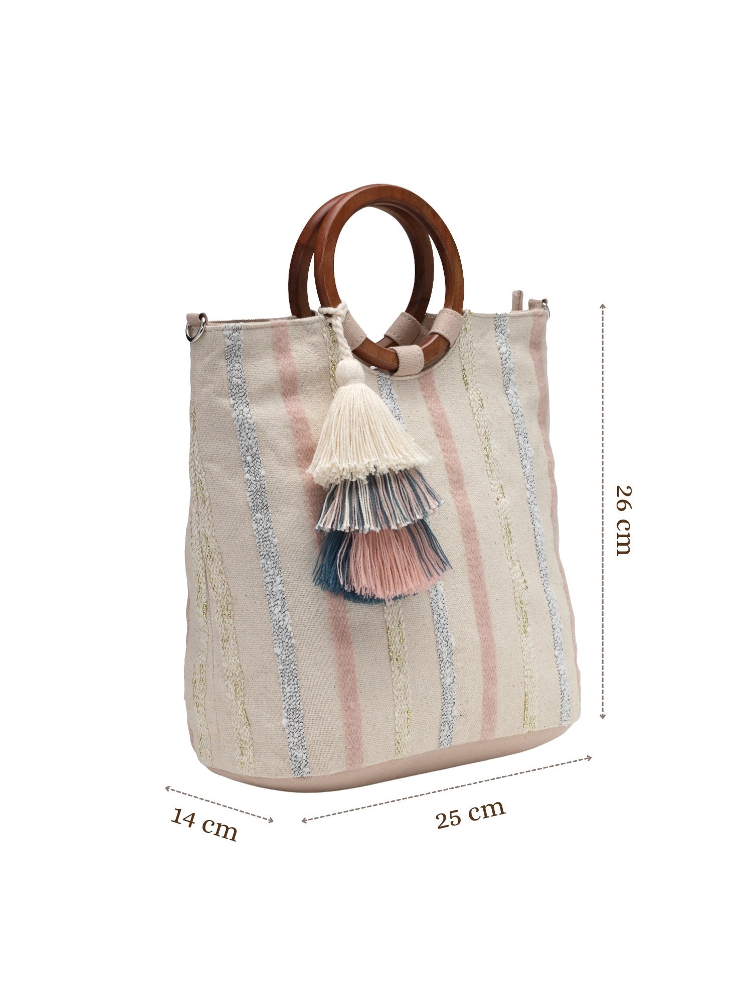 This Anekaant Sling Bag from the Hue Collection is crafted in cotton acrylic jacquard with a beige base accented by pastel pink and blue vertical stripes. Designed with a single compartment secured by a zipper closure, it features a vertical striped weave enriched with a playful multicolor tiered tassel for a boho-chic appeal. The interior includes one slip pocket and one zip pocket to keep essentials organized and secure. Finished with dual wooden handles and a detachable embroidered sling strap that can be adjusted for comfort, this bag blends style with practicality. Dimensions (L x H x W): 25 x 26 x 14 cm.