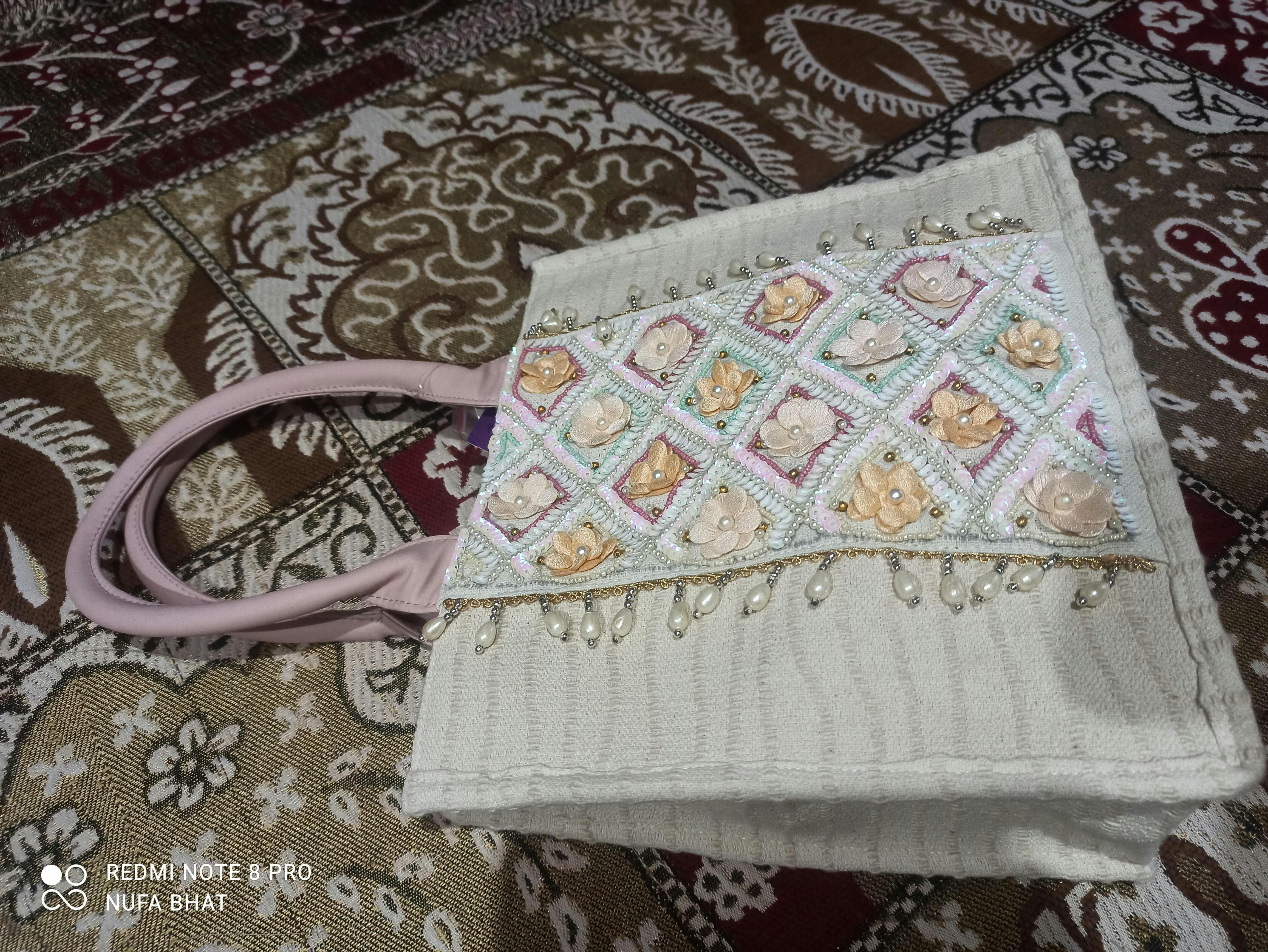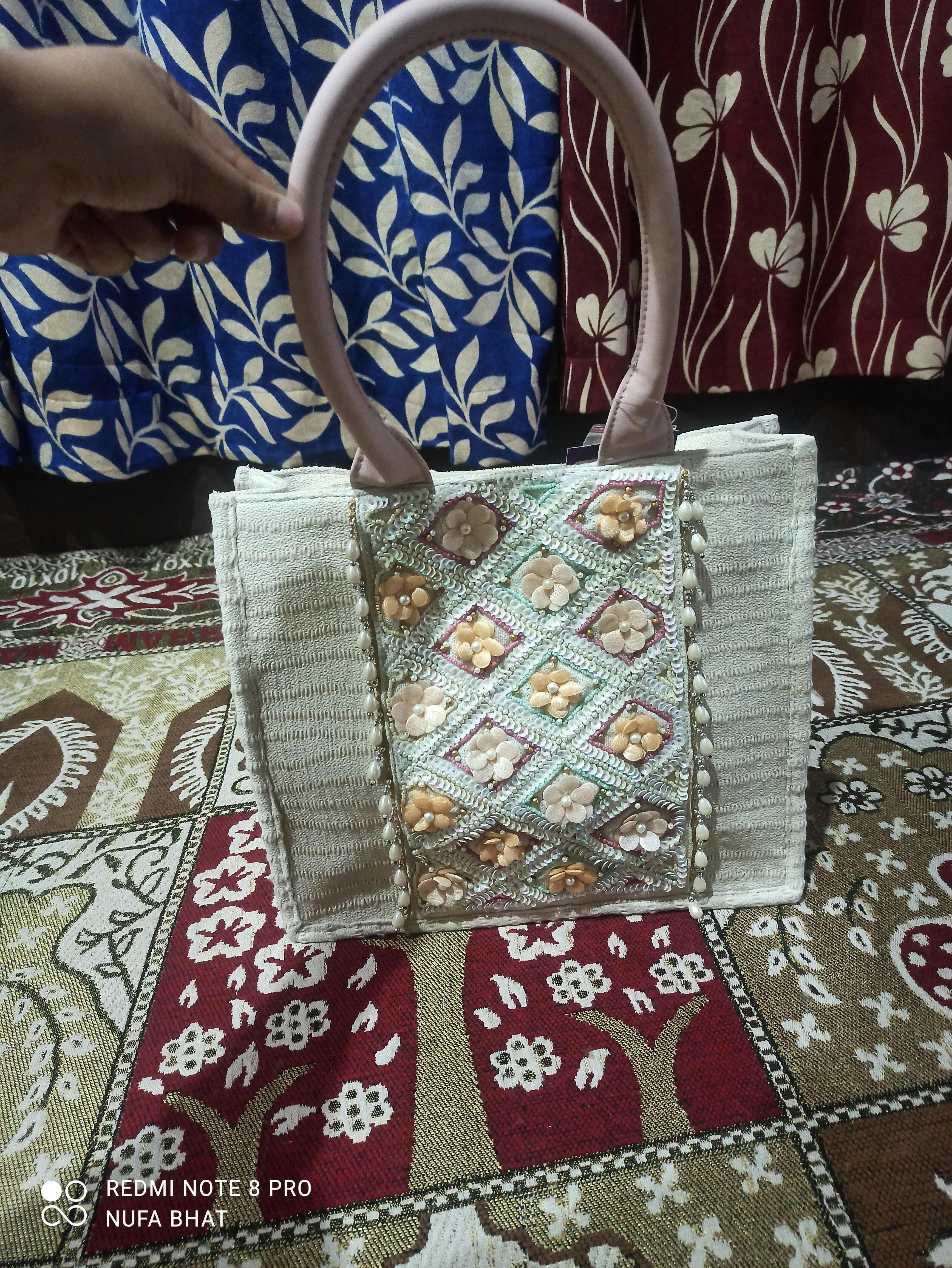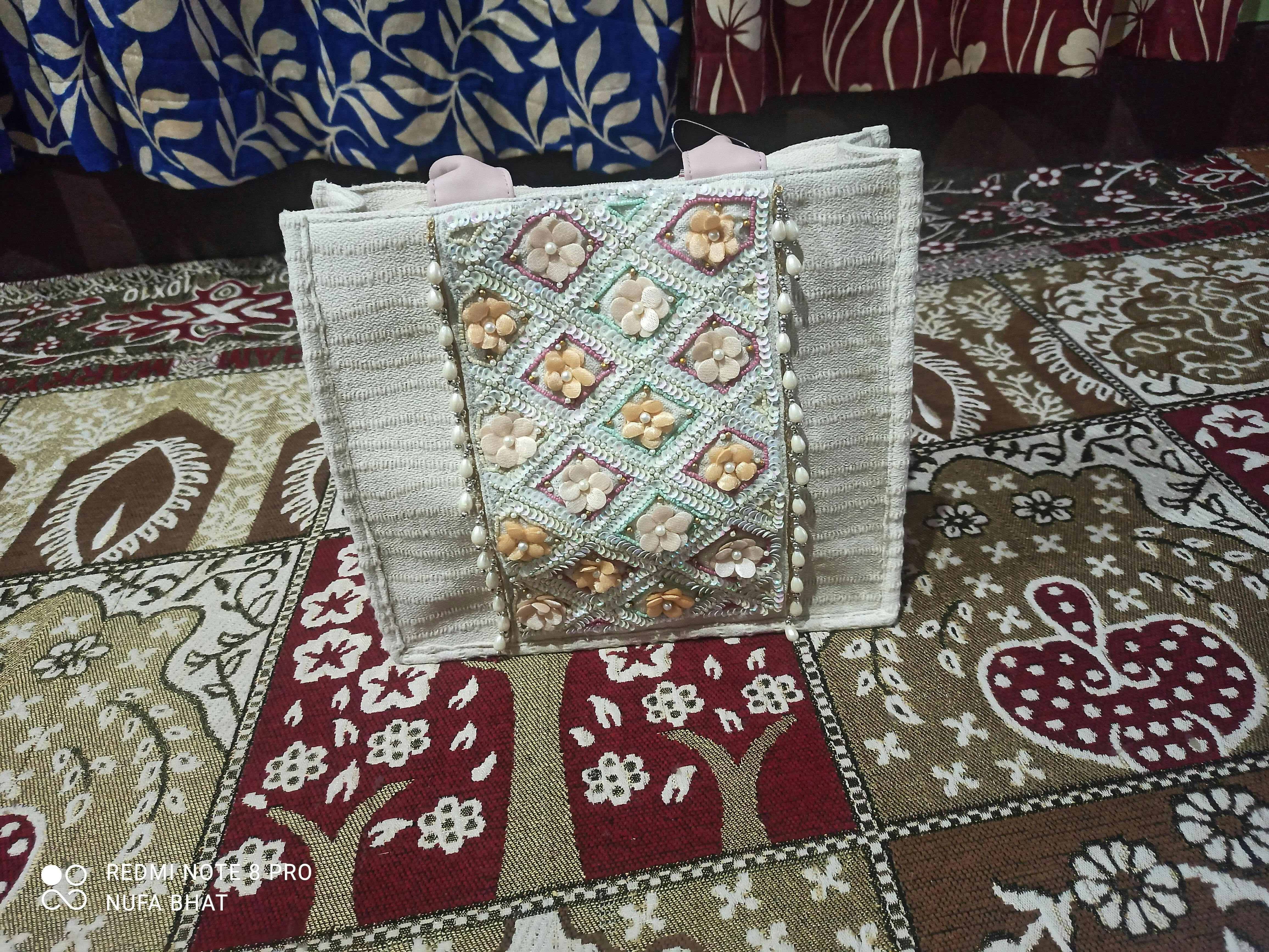 Handheld Bag from Kooky Collection. Crafted with Handloom Cotton Canvas fabric, this Handheld Bag features a Floral Embellished Pattern decorated with Tassels. It has 1 main compartment secured with a Zip closure. It includes 1 Inner Zip Pocket & 1 Mobile Pocket. The Two Handles make it convenient to carry around all day. Dimensions (LxHxW) : 33 x 28 x 13 cm