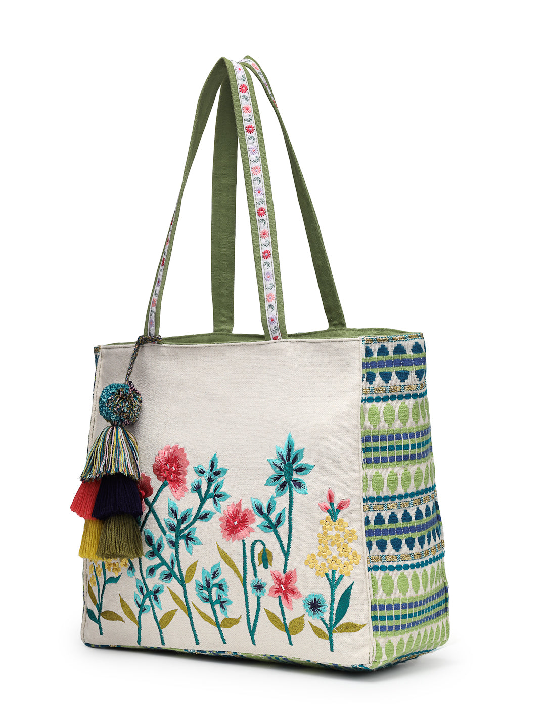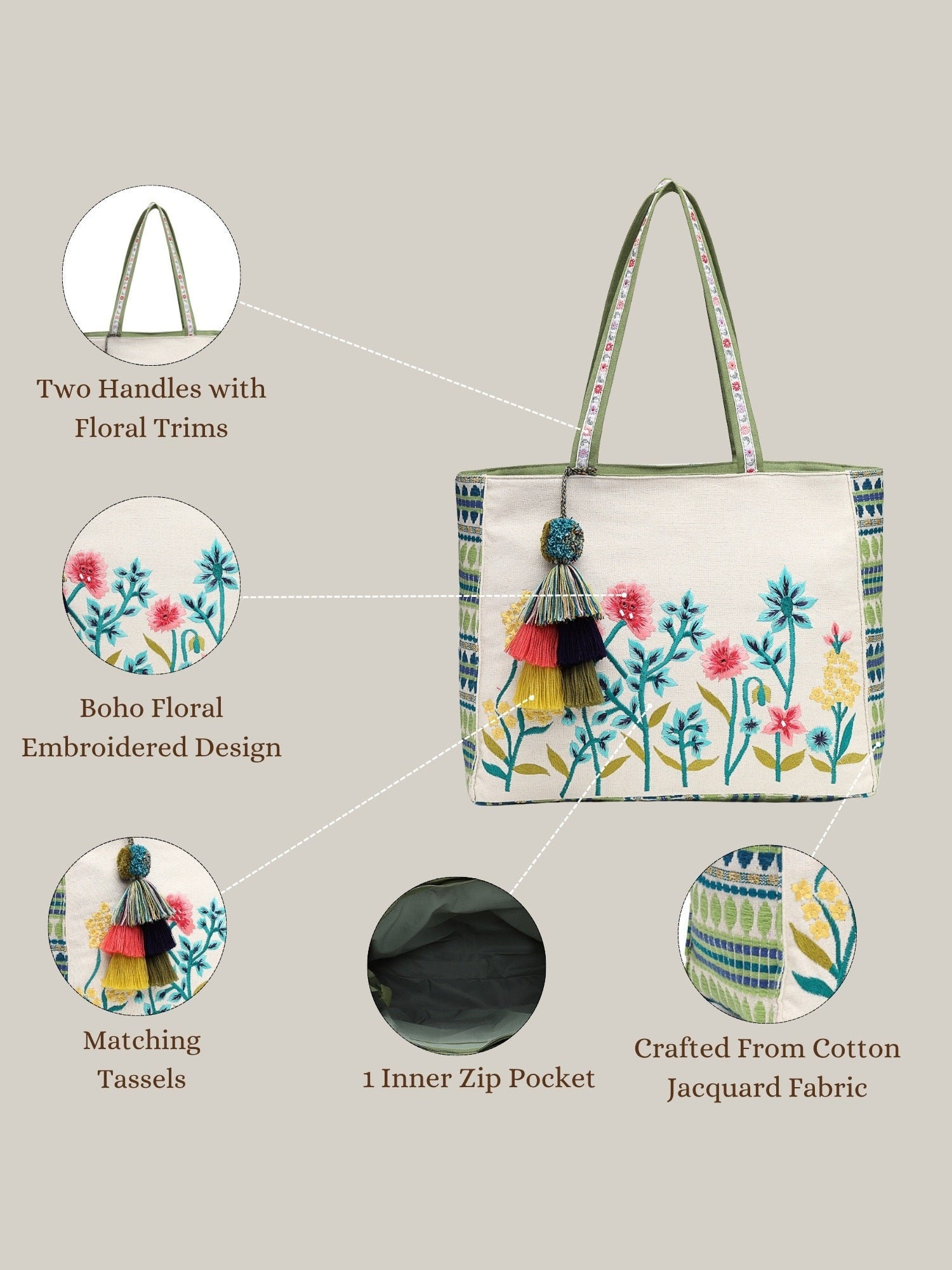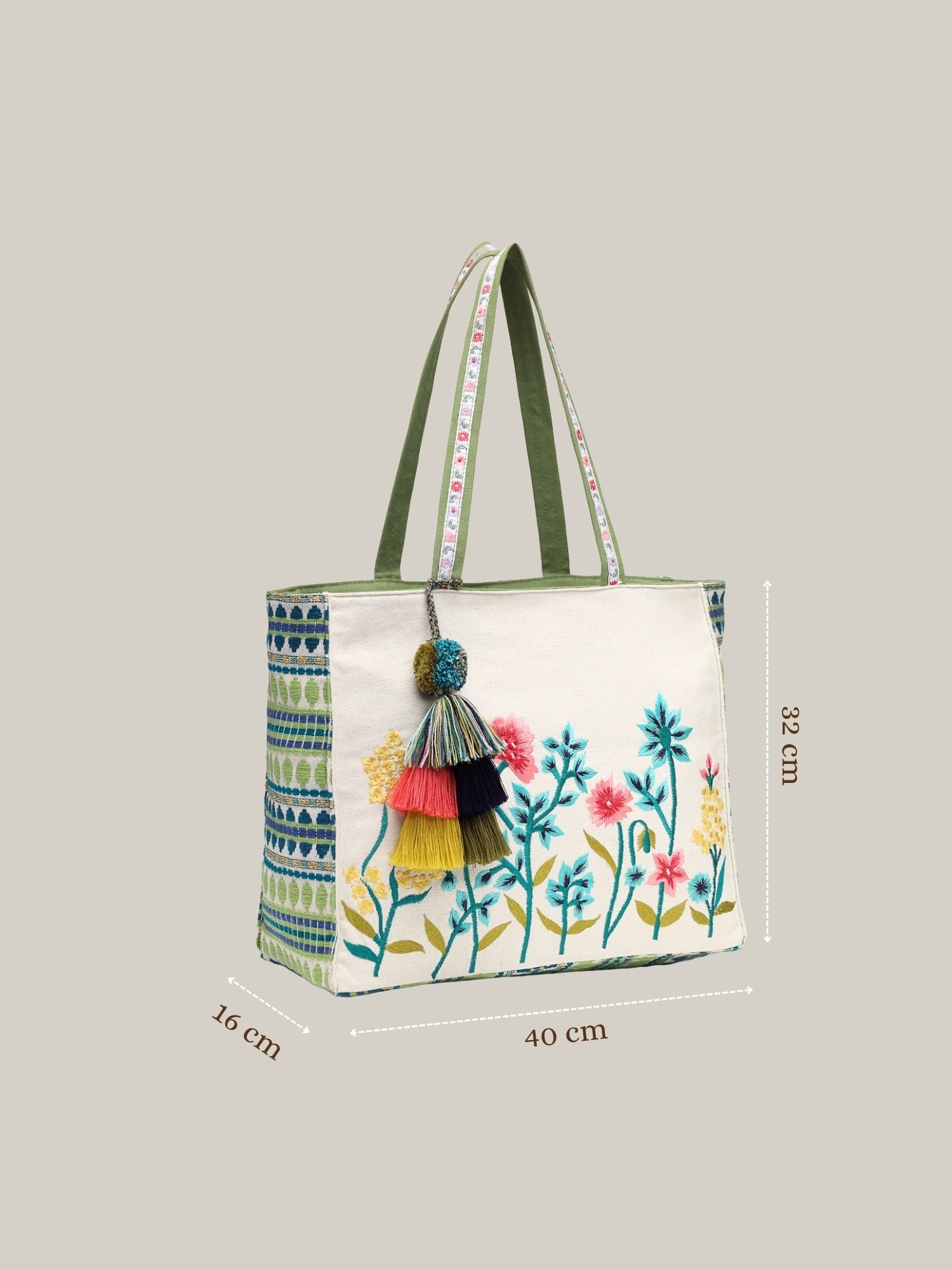 This Anekaant Tote Bag from the Kooky Collection is crafted from handloom cotton jacquard and canvas in a beige base, highlighted with multicolor embroidery in teal, pink, yellow, and green. Designed with a spacious main compartment secured by a zipper closure, it features green handles with floral trims and a tassel charm in neon pink, mustard, teal, and navy. The front displays intricate floral work, while the sides showcase geometric woven accents for a vibrant bohemian appeal. Inside, a secure zip pocket keeps valuables safe. Dimensions (L x H x W): 40 x 32 x 16 cm.