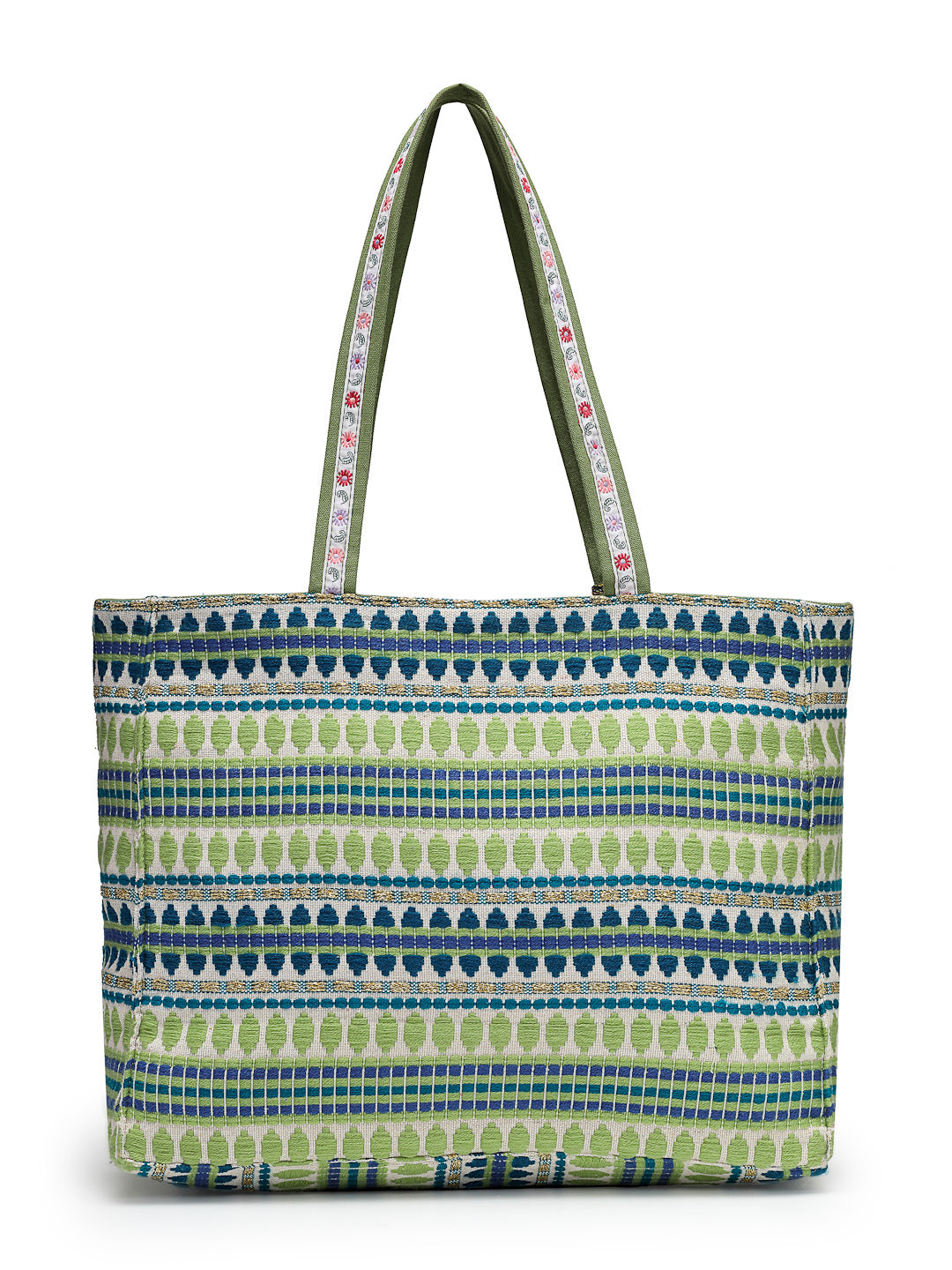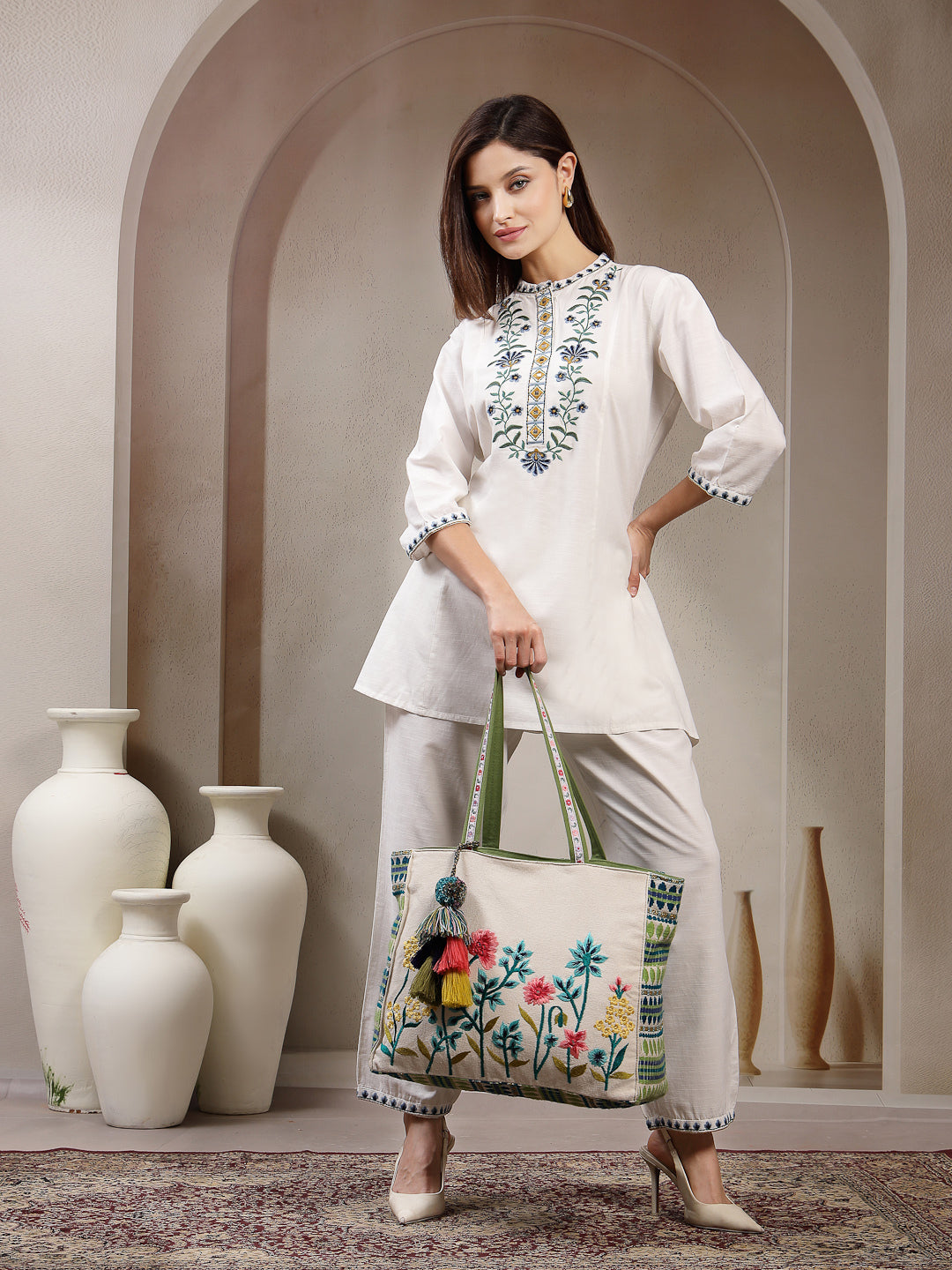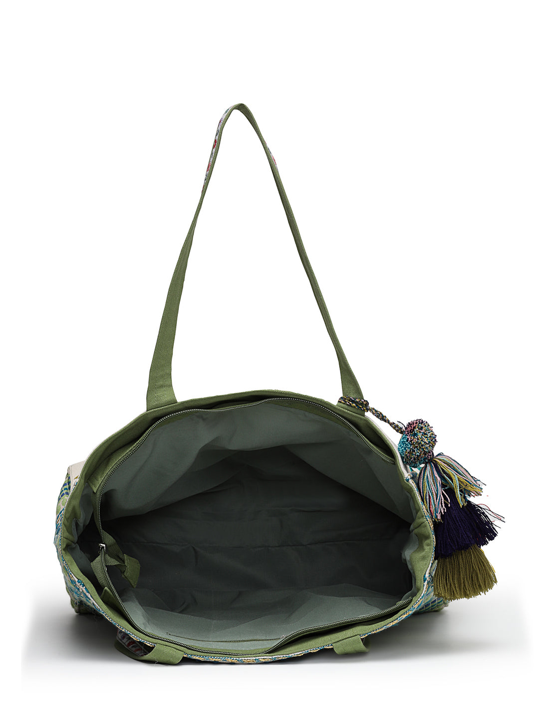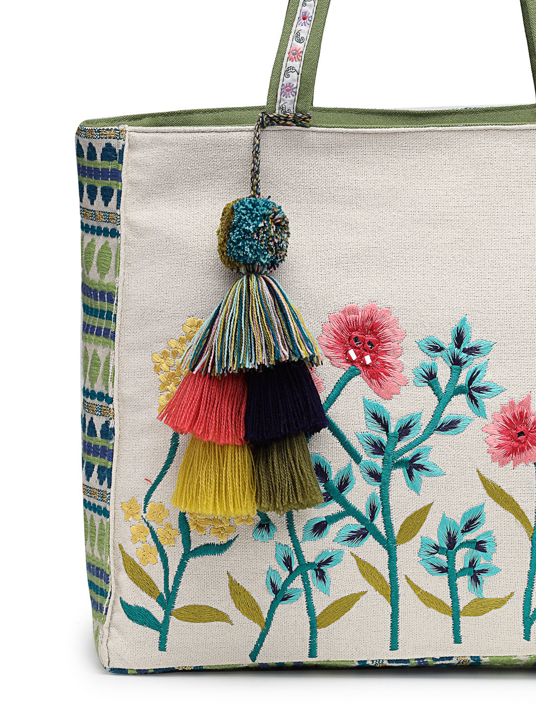 This Anekaant Tote Bag from the Kooky Collection is crafted from handloom cotton jacquard and canvas in a beige base, highlighted with multicolor embroidery in teal, pink, yellow, and green. Designed with a spacious main compartment secured by a zipper closure, it features green handles with floral trims and a tassel charm in neon pink, mustard, teal, and navy. The front displays intricate floral work, while the sides showcase geometric woven accents for a vibrant bohemian appeal. Inside, a secure zip pocket keeps valuables safe. Dimensions (L x H x W): 40 x 32 x 16 cm.