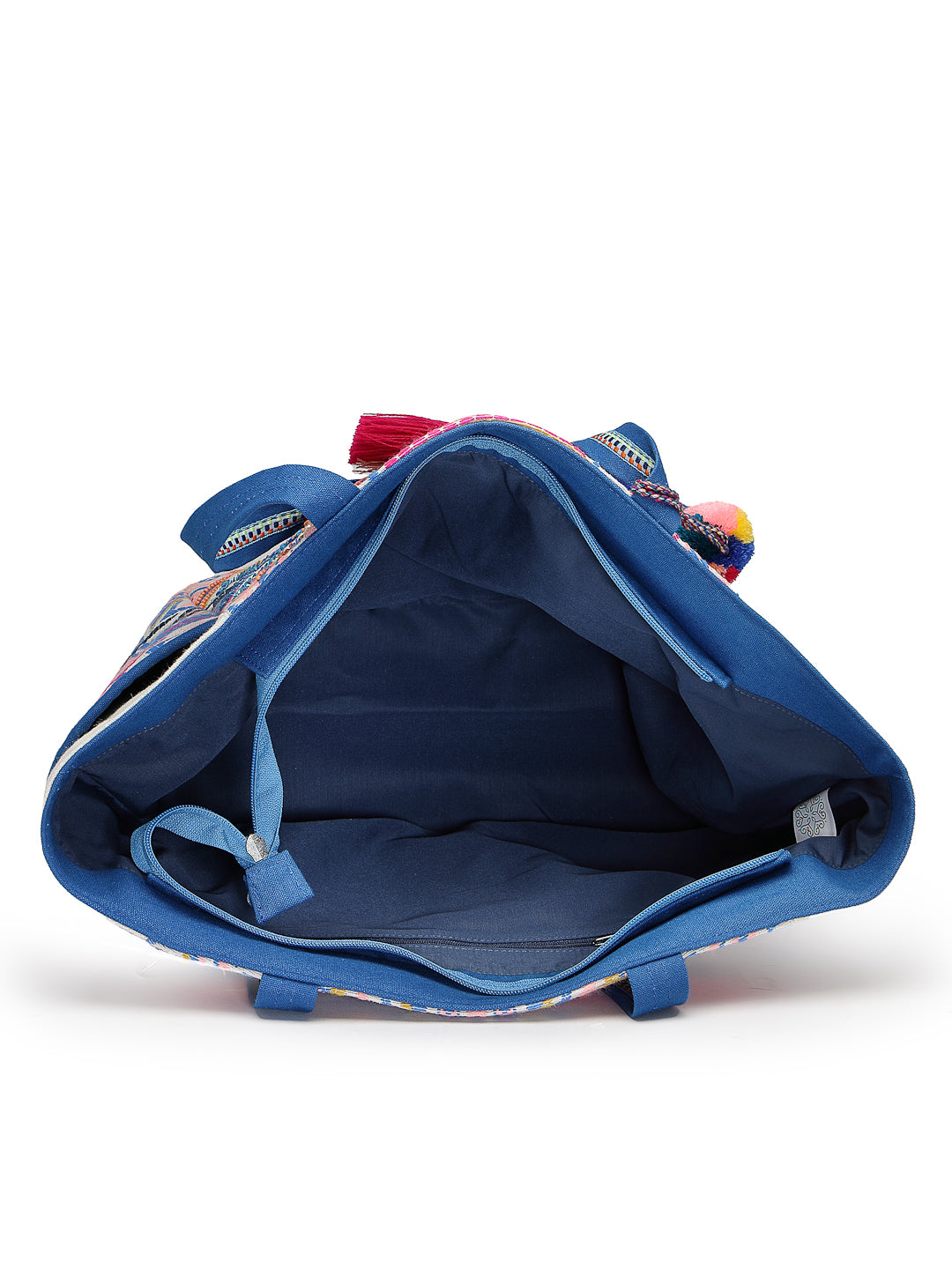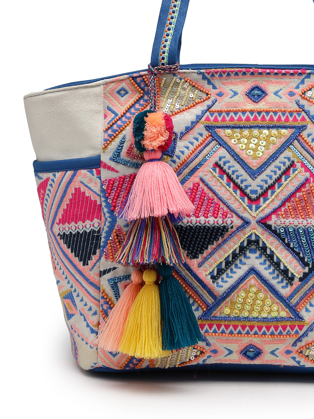 This Anekaant tote bag from the Kooky collection features one spacious main compartment secured with a zip closure for everyday convenience. Designed with a natural base accented by vibrant multicolour embroidery, it offers a playful yet artisanal appeal. Crafted from handloom cotton jacquard and finished with a durable polyester lining, the bag highlights an intricate geometric tribal pattern enhanced with woven motifs and bead–sequin detailing. It includes an inner zip pocket for valuables, an external zip pocket for quick access, dual side bottle holders, lace-trimmed shoulder handles for comfortable carrying, and a matching tassel accent for added character. Dimensions (L × H × W): 34 × 30 × 16 cm.