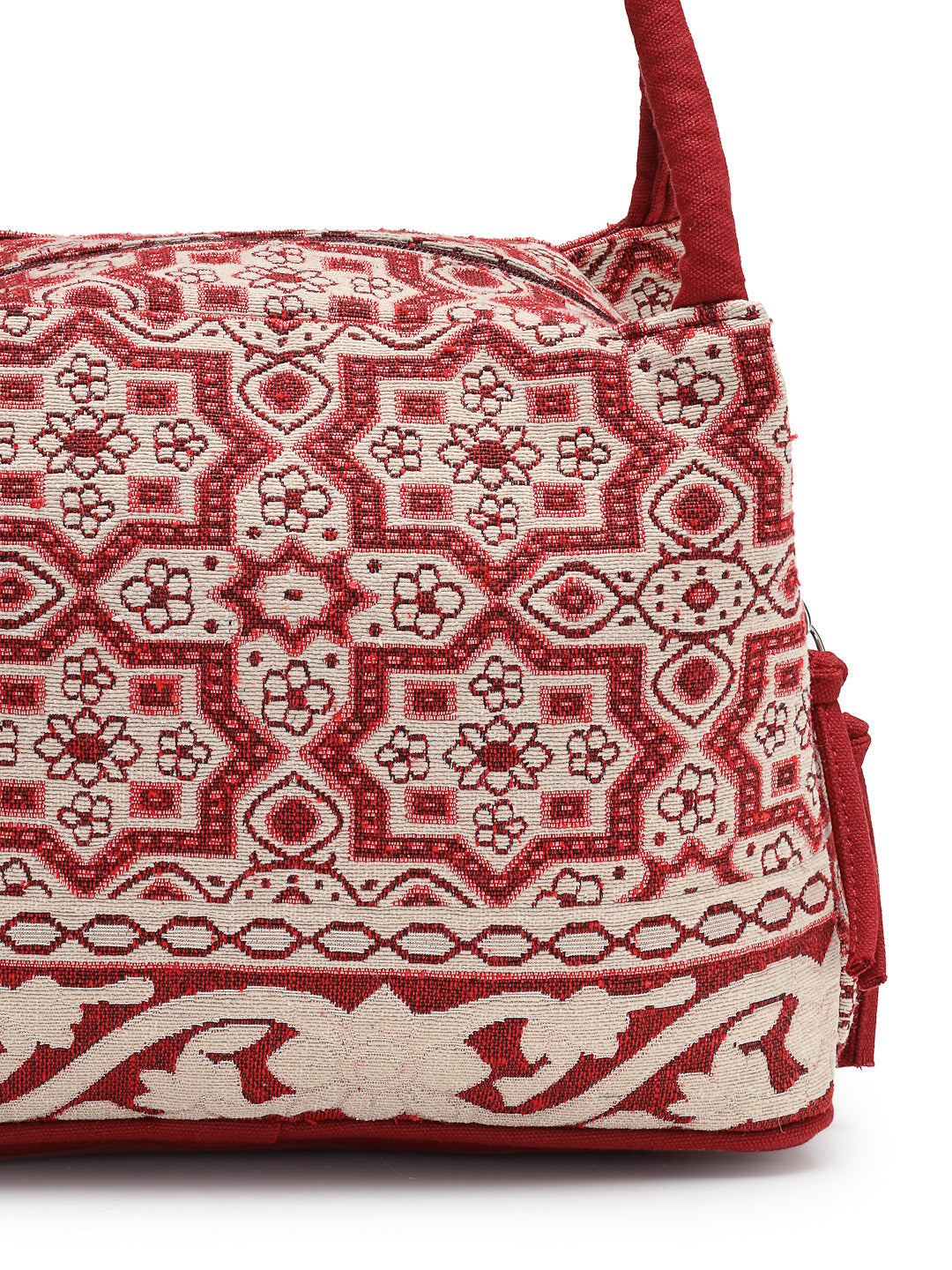 This Anekaant Handheld Bag from the Tribal Collection is crafted from cotton jacquard in a deep maroon and beige combination with contrasting handles. Featuring a single main compartment secured with a zipper closure, it showcases intricate geometric and floral motifs in a traditional jacquard weave, finished with a floral border along the base. The interior is designed with a secure zip pocket to keep valuables safe. Dimensions (L x H x W): 25 x 19 x 13 cm.
