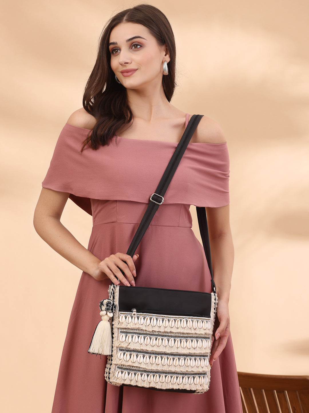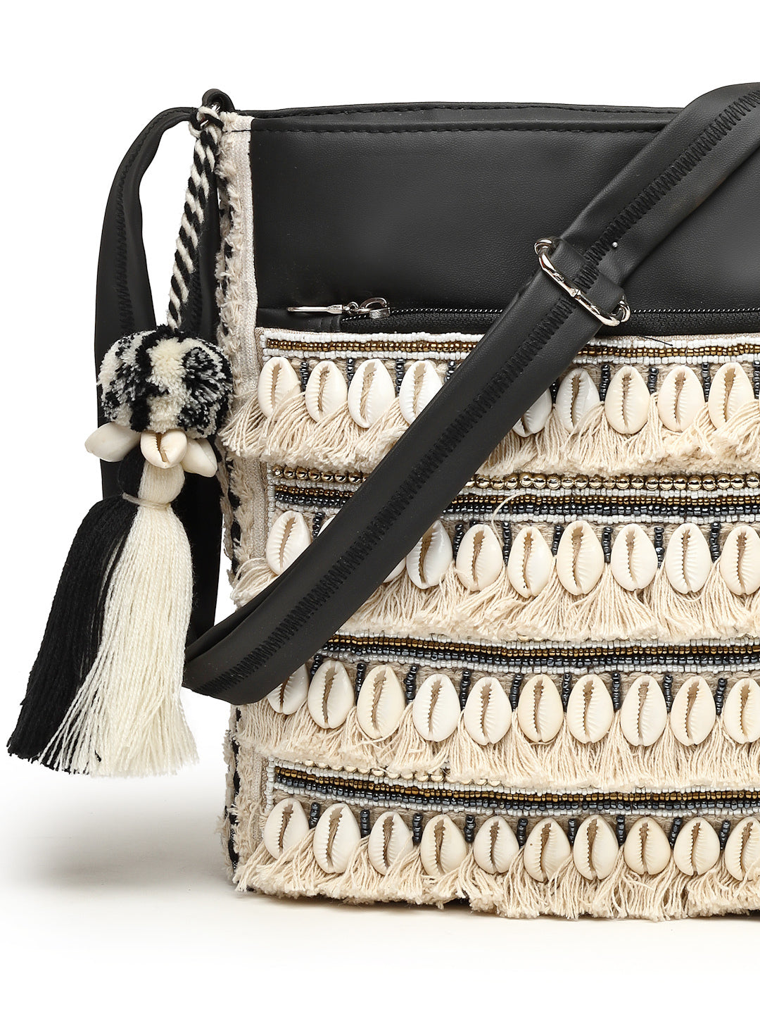 Sling Bag from 's Boho Collection. Crafted with Cotton Jacquard & PU fabric, this Sling Bag features a Seashell Embellished Pattern decorated with Tassels. It has 1 main compartment secured with a Zip closure. It includes 1 Inner Zip Pocket & Mobile Pocket, 1 External Zip Pocket. The Adjustable Sling Strap makes it convenient to carry the bag comfortably. Dimensions (LxHxW) : 25 x 25 x 6 cm