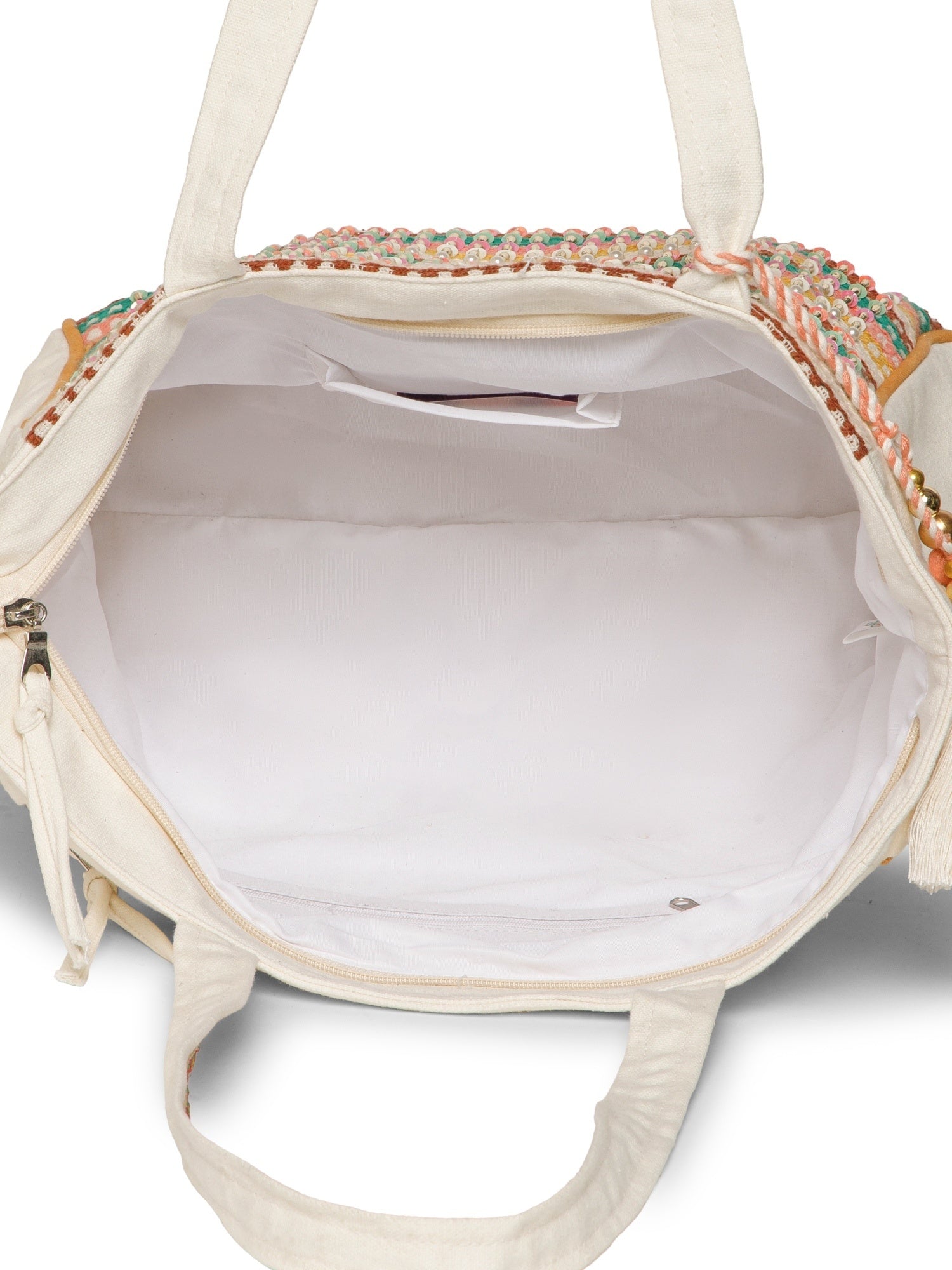 This Anekaant Tote Bag from the Folklore Edit Collection comes in an off-white base accented with shades of pink, gold, green, and bronze. Made from cotton canvas, it features an embellished front panel and strong woven handles. The design showcases horizontal stripes of sequins combined with teardrop beads, mirrors, and fine embroidery for a festive appeal. Measuring 32 x 31 x 13 cm (L x H x W), it offers an inner zip pocket, a slip pocket, a back zip pocket, and two handles for convenient carrying.