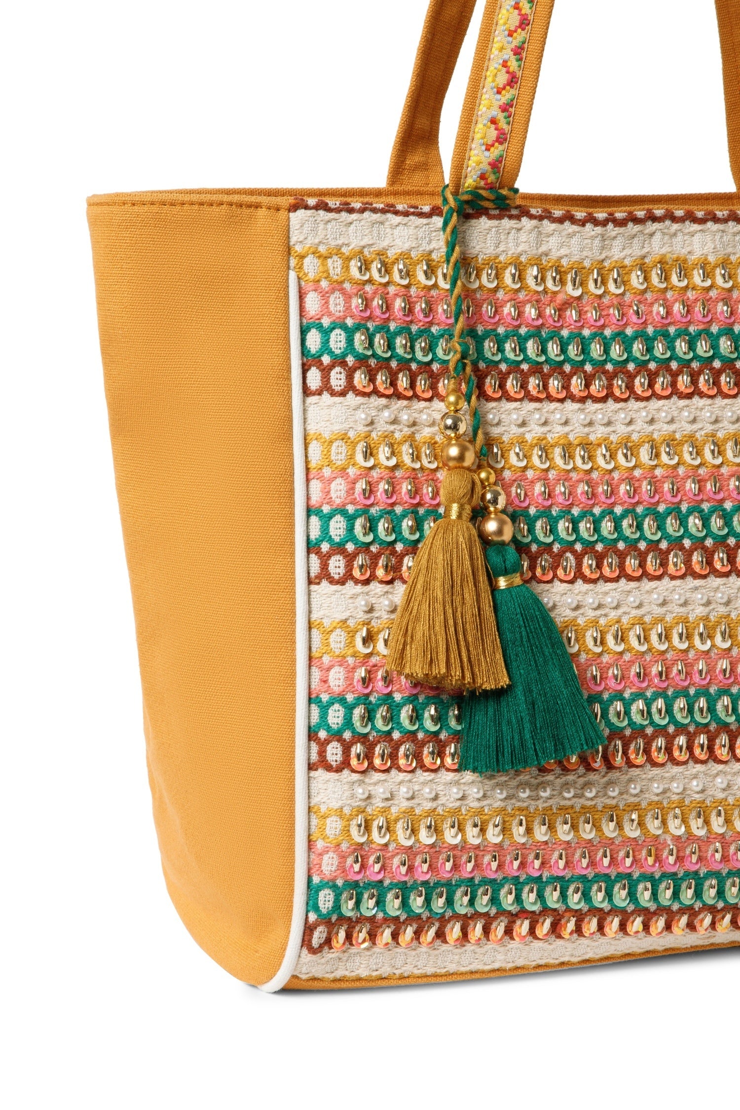 This Anekaant Tote Bag from the Folklore Edit Collection comes in mustard yellow with multicolor sequin accents in pink, green, white, and gold. Crafted from cotton canvas, it features an embellished front panel and sturdy woven handles. The design displays horizontal sequin stripes enhanced with teardrop beads, mirror work, and detailed embroidery for a festive appeal. Measuring 32 x 31 x 13 cm (L x H x W), it includes an inner zip pocket, a slip pocket, a back zip pocket, and two handles for convenient carrying.