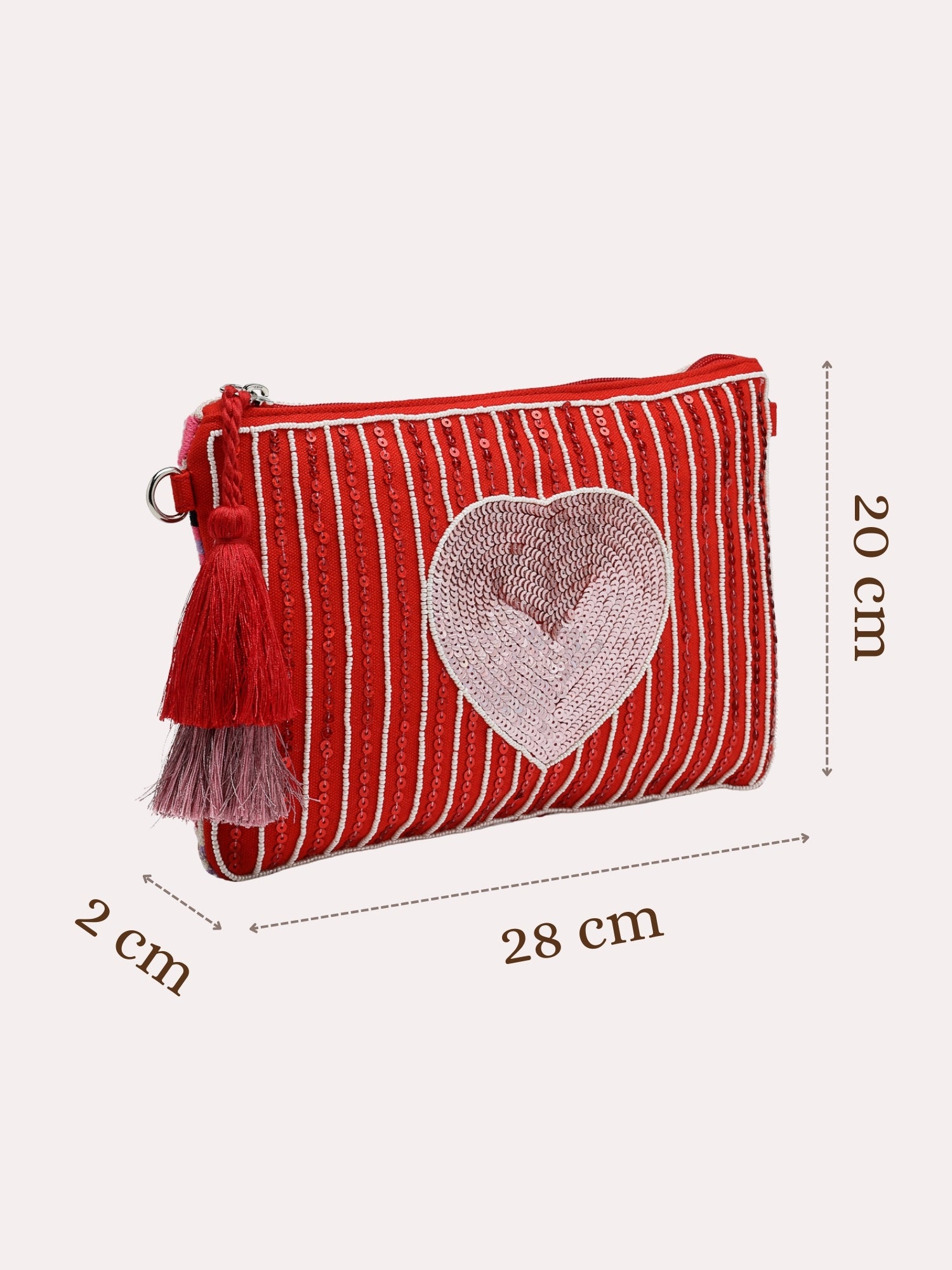 Sling Bag from Amour Collection. Crafted with Cotton Canvas & Jacquard fabric, this Sling Bag features a Heart Embellished Pattern decorated with Tassels. It has 1 main compartment secured with a Zipper closure. It includes 1 Inner Zip Pocket & 1 Mobile Pocket. Has an Adjustable & Detachable Sling Strap. Dimensions LxHxW : 28 x 20 x 2 cm. Part of our special Valentine's Collection.