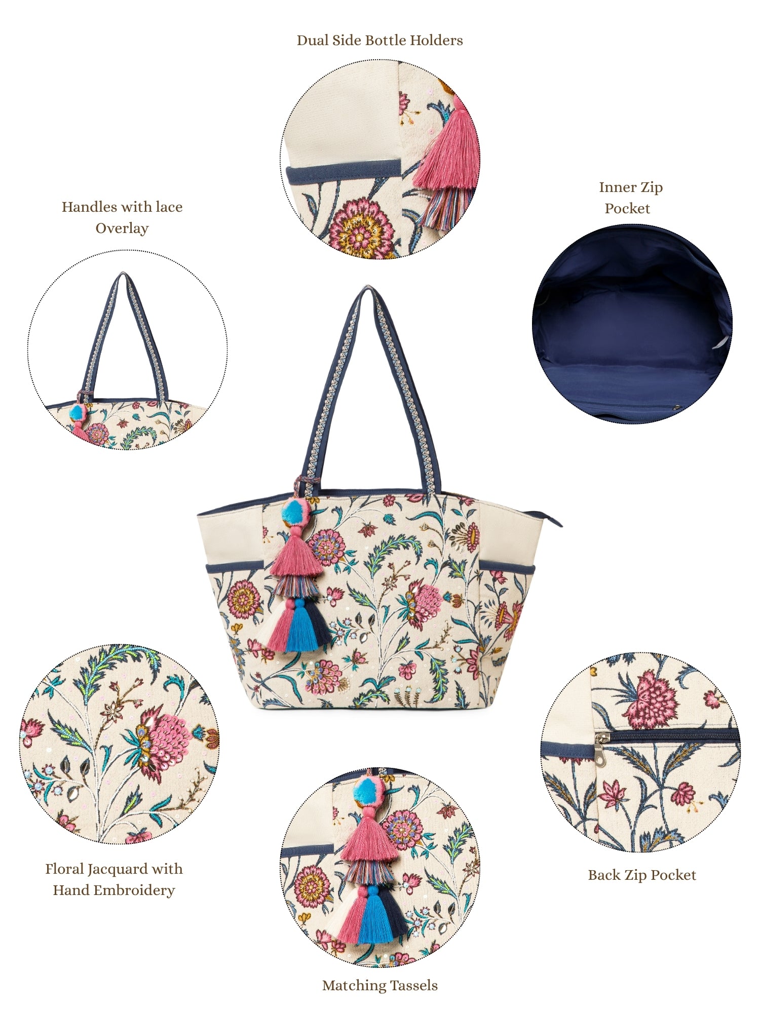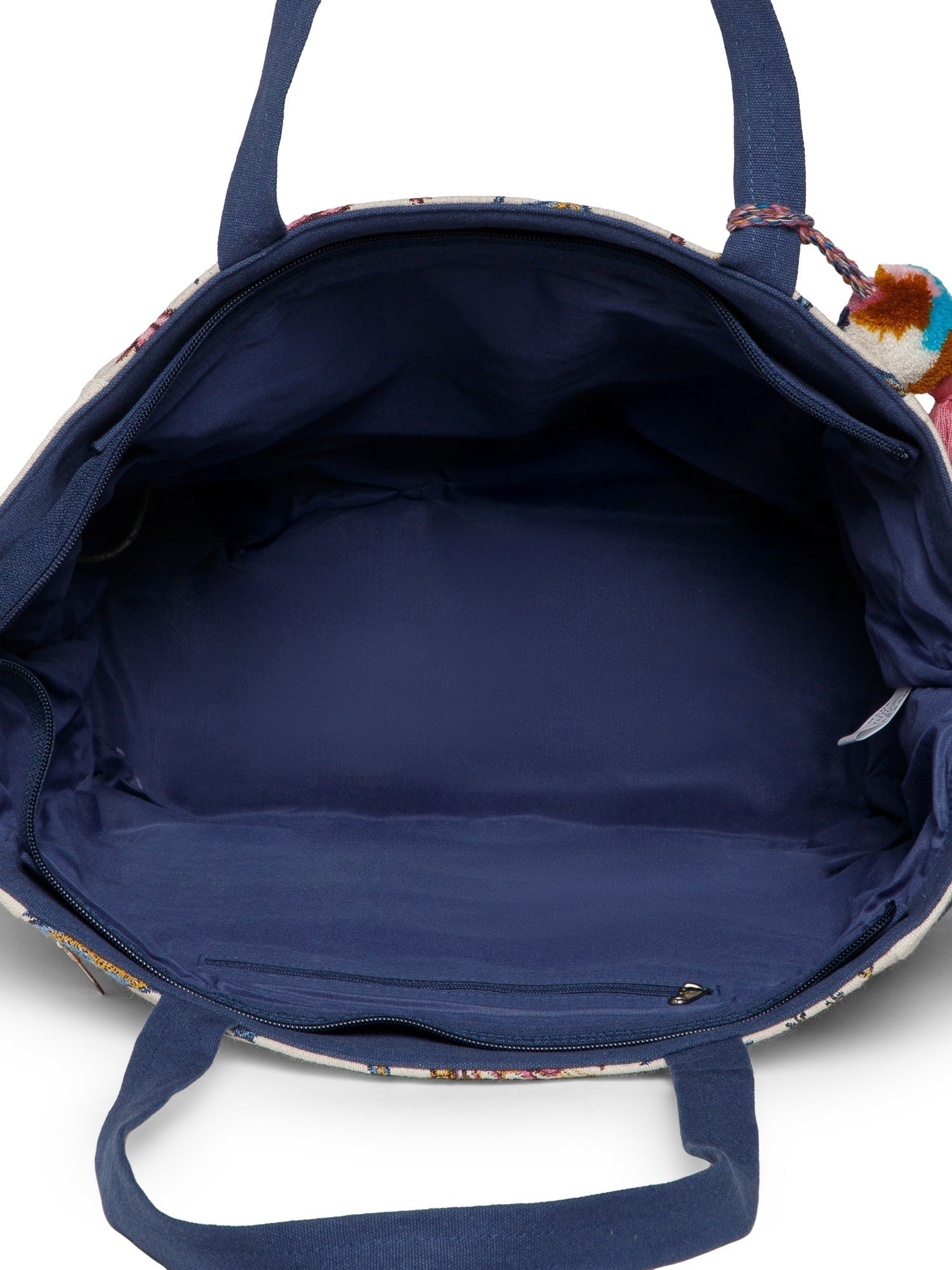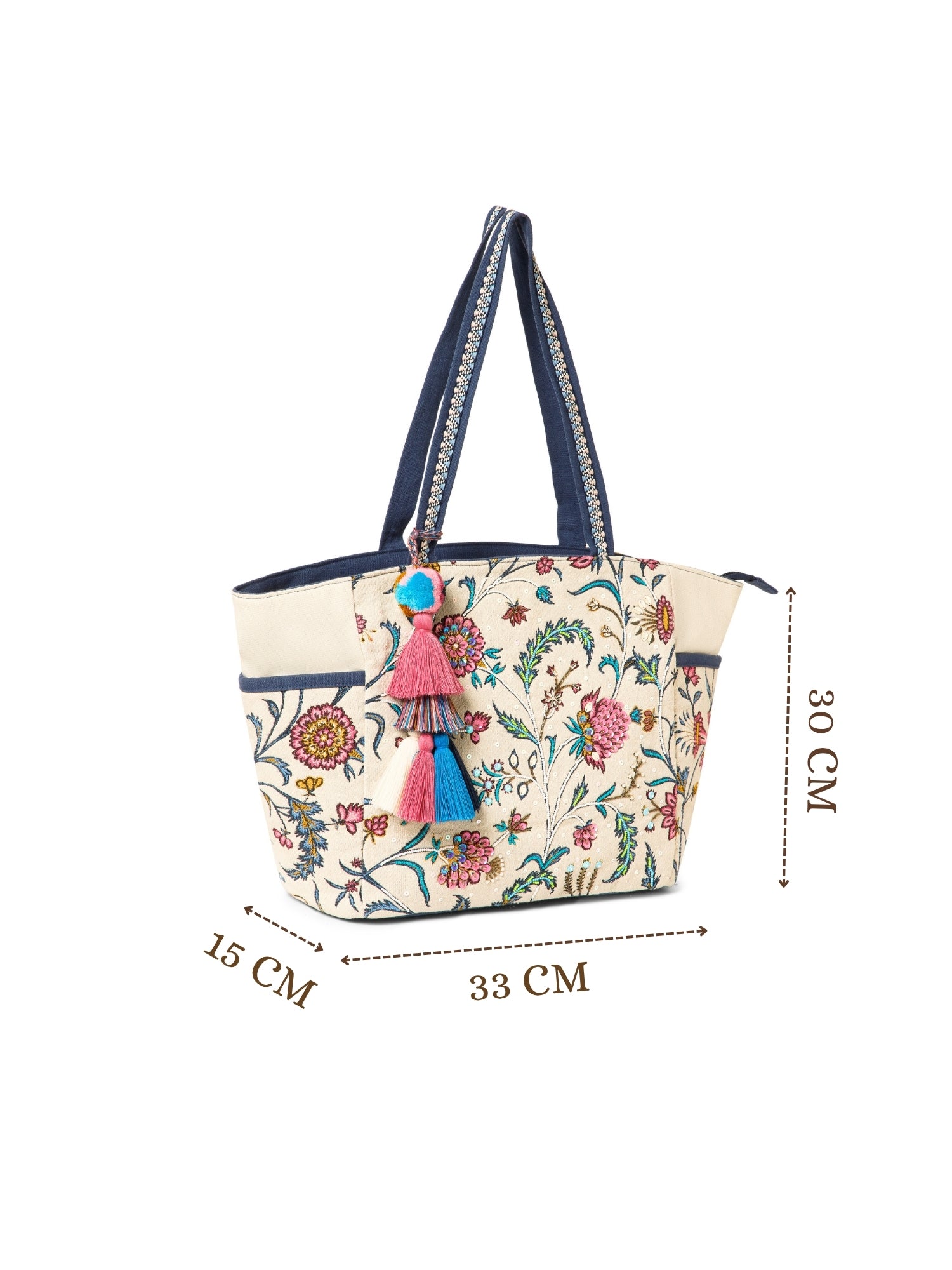 This Anekaant Tote Bag from the Petal Posh Collection features an ivory base adorned with multicolored floral embroidery, complemented by navy blue handles and contrast piping. Crafted from woven jacquard fabric with a sturdy cotton canvas base, it showcases floral thread embroidery enhanced with sequins, beads, and mirror embellishments for a festive touch. Measuring 33 x 30 x 15 cm (L x H x W), this tote includes a spacious main compartment with an inner zip pocket, a secure back zip pocket, and two handles finished with decorative woven lace trim for added style and durability.