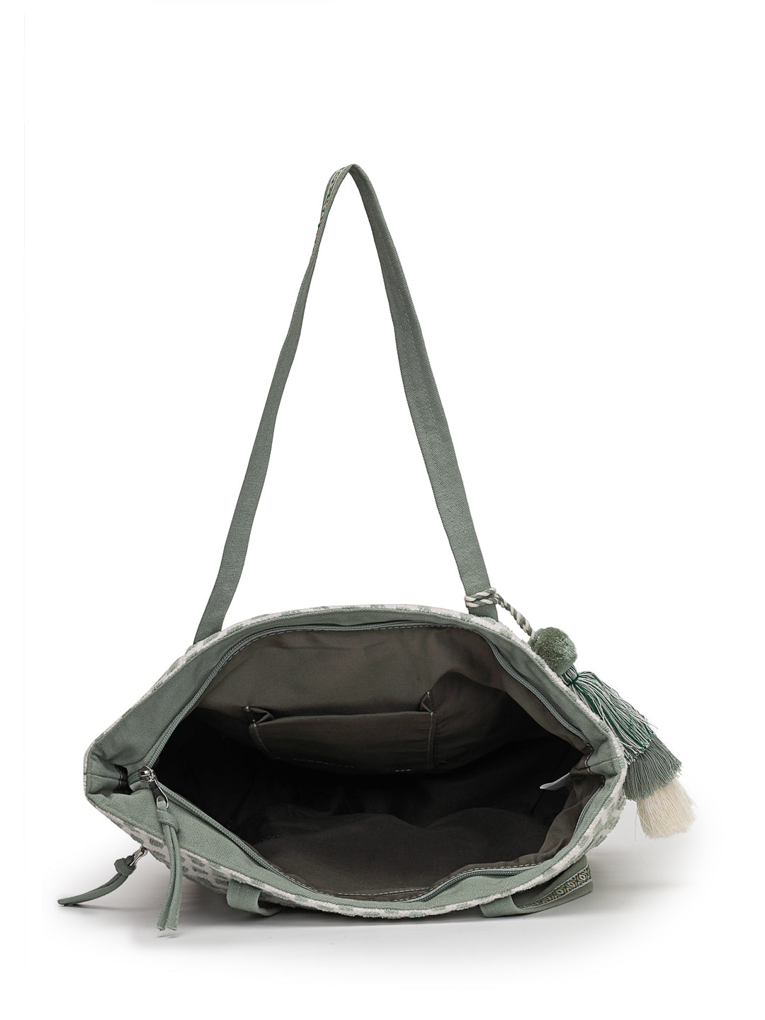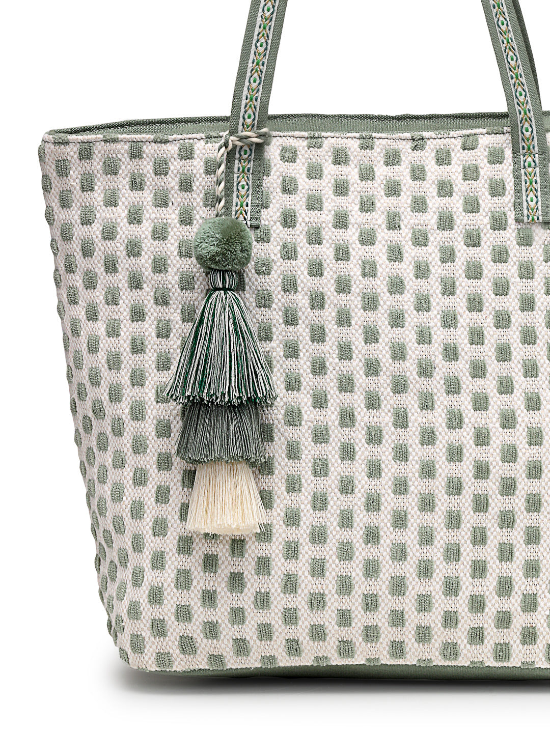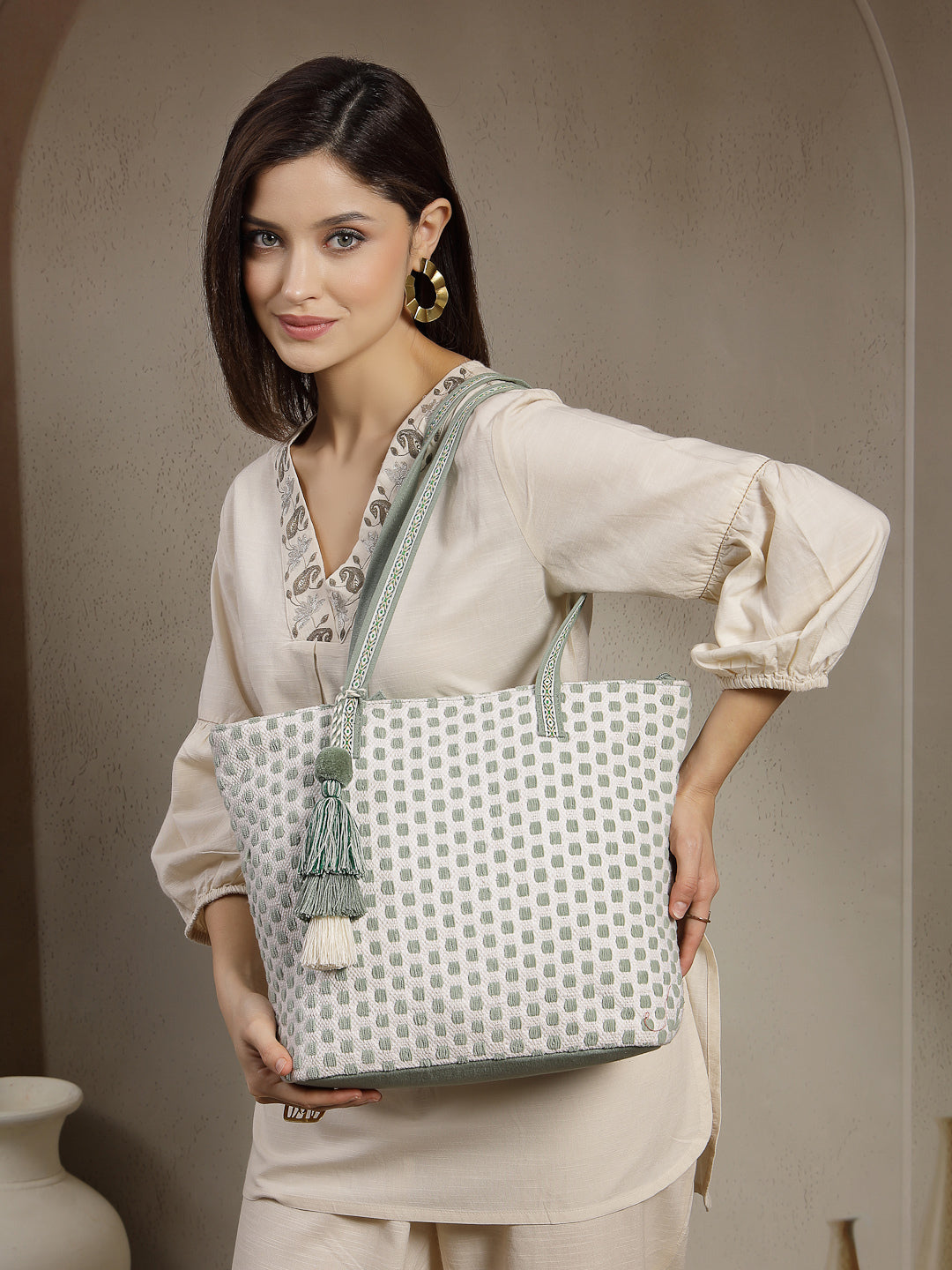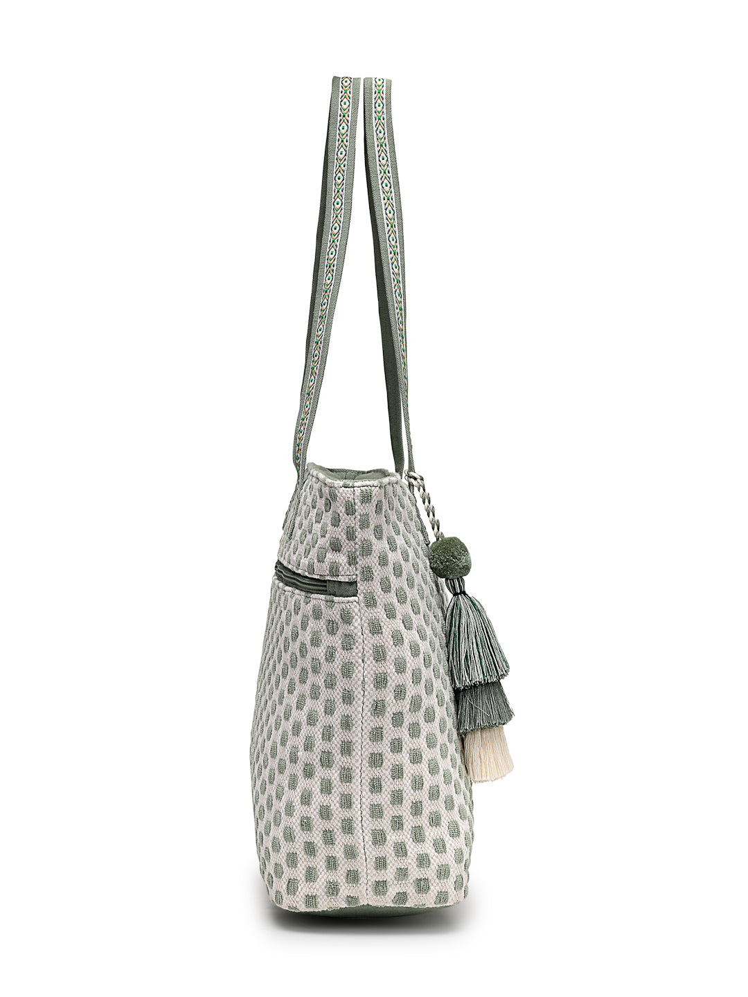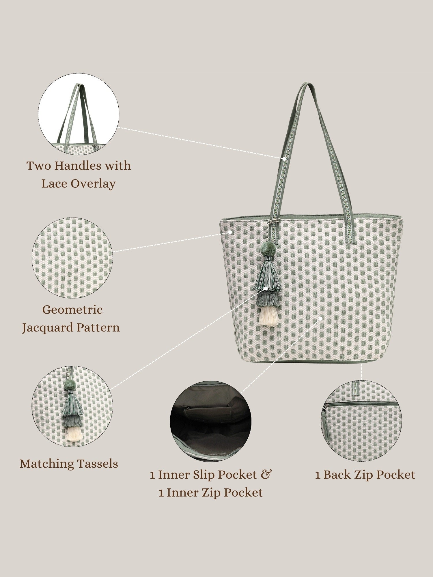 This Anekaant Tote Bag from the Earth Edit Collection is crafted from cotton acrylic jacquard in a soft sage green and off-white palette, offering a subtle and refreshing appeal. It is designed with a spacious main compartment secured by a zip closure and detailed with a geometric dotted jacquard weave for a contemporary touch. The interior provides one slip pocket and one zip pocket for valuables, while an external back zip pocket ensures quick access to essentials. Two lace-trimmed shoulder handles deliver comfortable carrying, and a matching tassel adds a refined finishing detail. Dimensions (L x H x W): 29 x 31 x 13 cm.