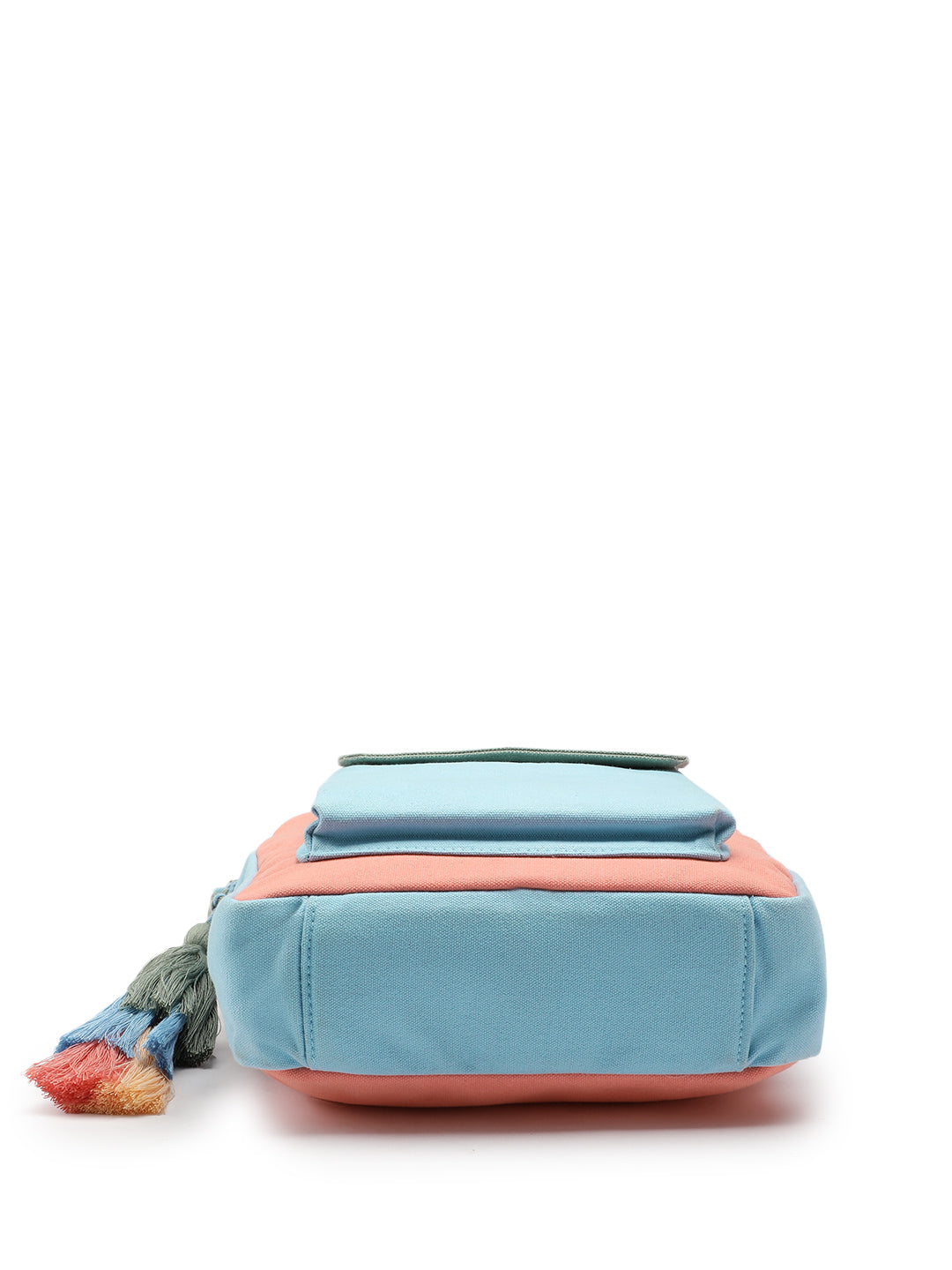 This Anekaant Colourblocked Sling Bag from the Hue Collection is a stylish everyday piece in a pastel color palette of Aqua Blue, Coral, Sage Green, and Cream. Crafted from durable cotton canvas with a soft polycotton lining, it features a vibrant tassel accent that adds a playful touch.It includes one main compartment with a secure zipper closure, a front flap pocket with magnetic button closure, a back slip pocket secured with Velcro, and an inner zip pocket for easy organization. The adjustable strap ensures comfort and versatility throughout the day.