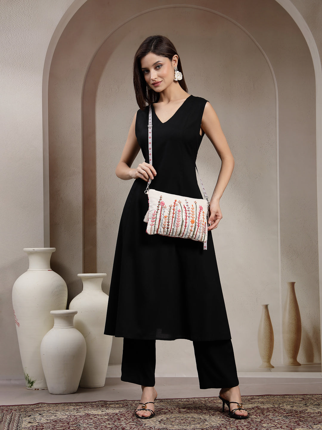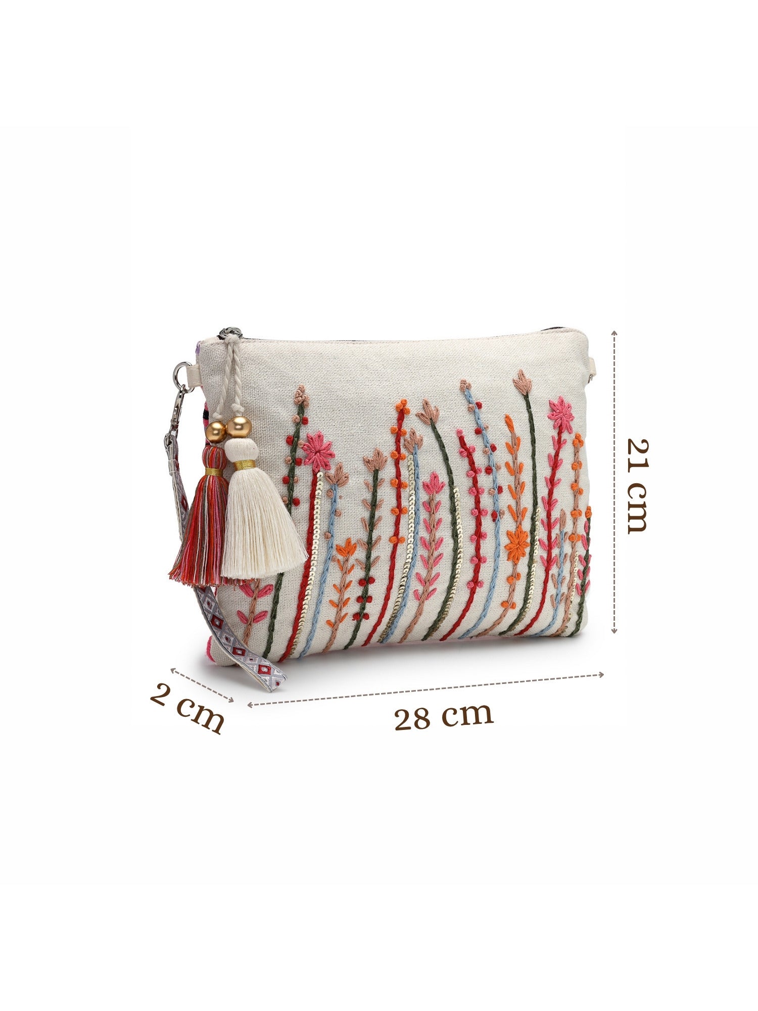 This Anekaant Sling Bag from the Thread Bloom Collection is crafted from cotton canvas and acrylic jacquard with a natural beige base, enriched by vibrant embroidery in shades of pink, orange, red, blue, and green. Designed with a single main compartment secured by a zip closure. The front showcases hand-embroidered floral and vine motifs with vertical stitched stems highlighted by sequins for a festive touch, while the back is detailed with horizontal geometric stripes in contrasting tones for a versatile dual-pattern appeal. Designed with an inner slip pocket and an inner zip pocket for valuables, it is completed with a detachable wrist loop and an adjustable detachable lace sling strap and finished with matching tassels, blending functionality with artisanal style. Dimensions (L x H x W): 28 x 21 x 2 cm.