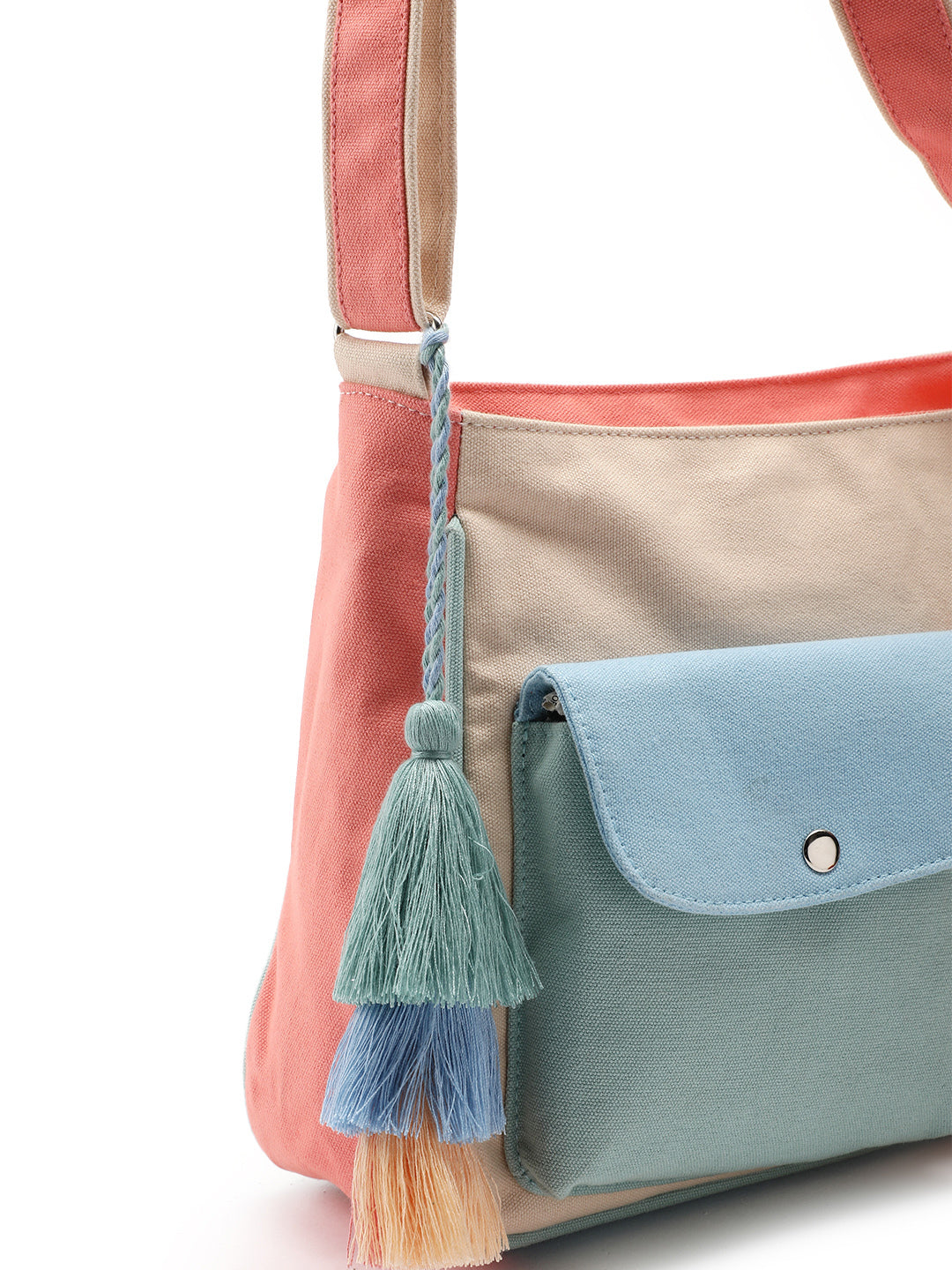 Anekaant Hue Pastel Multi Colourblocked Sling Bag is a vibrant and functional accessory from the Hue Collection, designed to brighten up your everyday look. Styled with one main compartment and a secure zipper closure, it features a pastel multi-shade colour palette combining Cream, Coral, Aqua Blue, and Mint Green for a playful yet chic appeal. Crafted from durable cotton canvas with a soft polycotton lining, this sling bag offers a stylish colourblocked design accented with a matching tassel for a lively finish. It includes a front flap pocket with magnetic button closure, two external zip pockets—one on the front and one on the back—and an inner zip pocket to keep your essentials neatly organized.Dimensions (L x H x W): 30 x 23 x 8 cm.