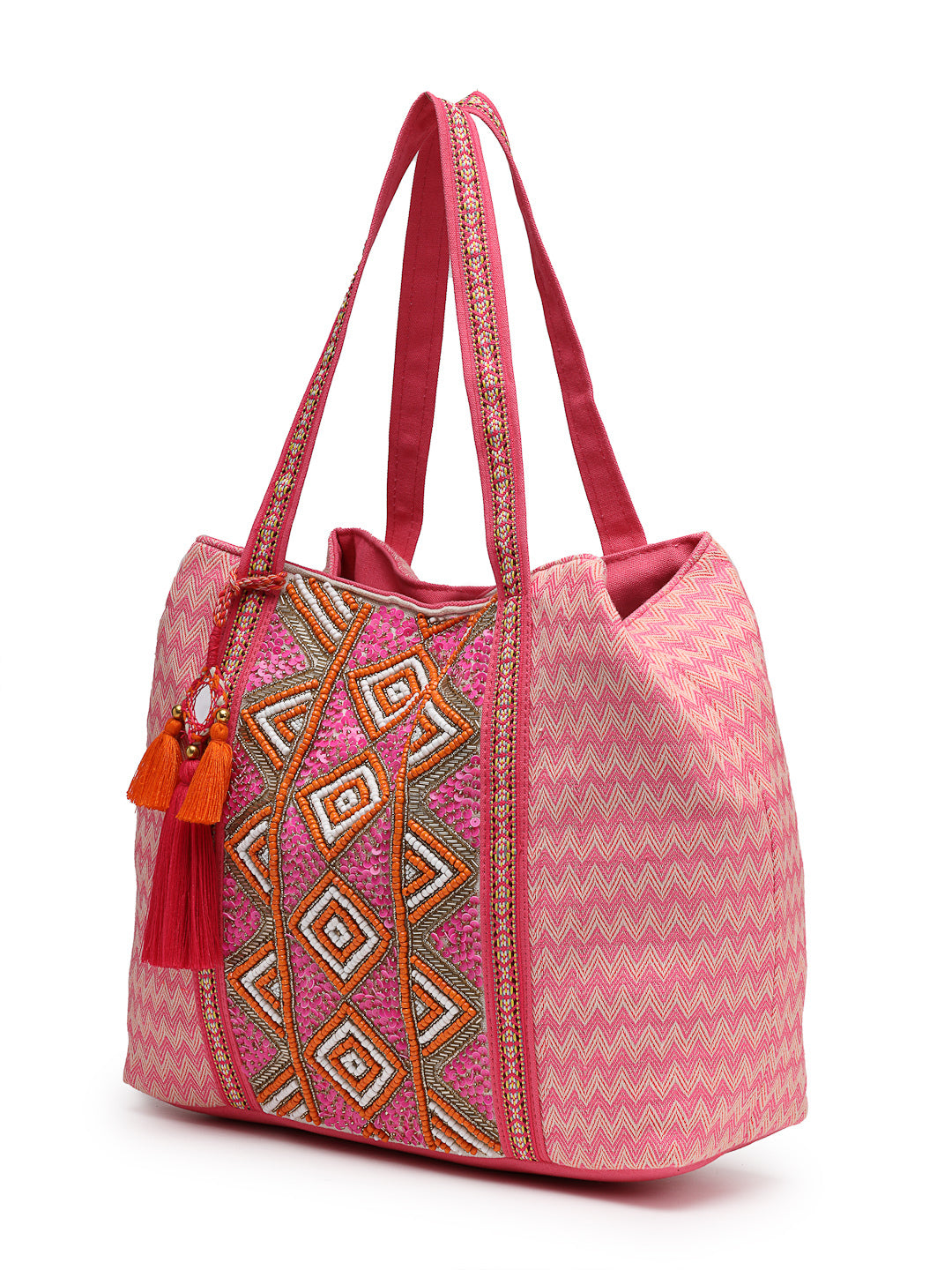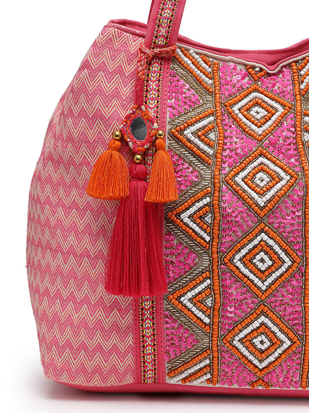 This Anekaant Hobo Bag from the Folklore Edit Collection is crafted from cotton jacquard with a bright pink base accented by orange, white, and gold. Designed with a roomy main compartment secured by a zip closure, the front panel features diamond motifs in bead embroidery highlighted with sequins for added sparkle. The sides and back display a contrasting chevron weave in pink and cream, creating a stylish finish. The interior includes one slip pocket and one zip pocket for essentials, complemented by lace-trimmed shoulder handles and a tassel accent. Dimensions (L x H x W): 36 x 31 x 12 cm.