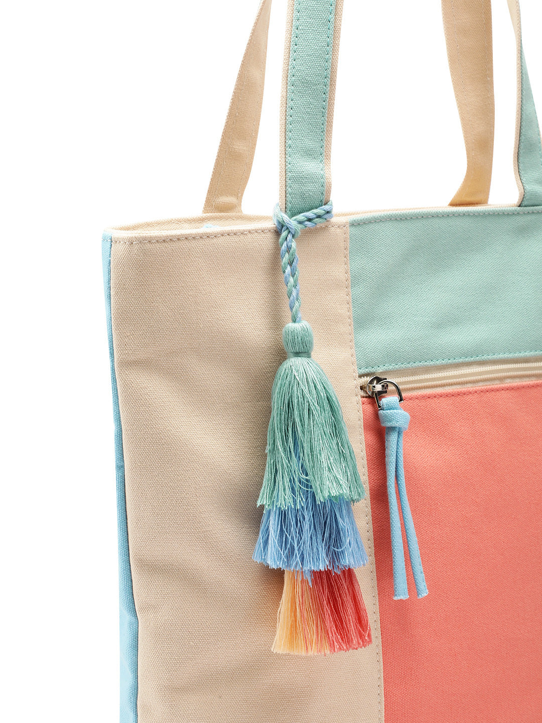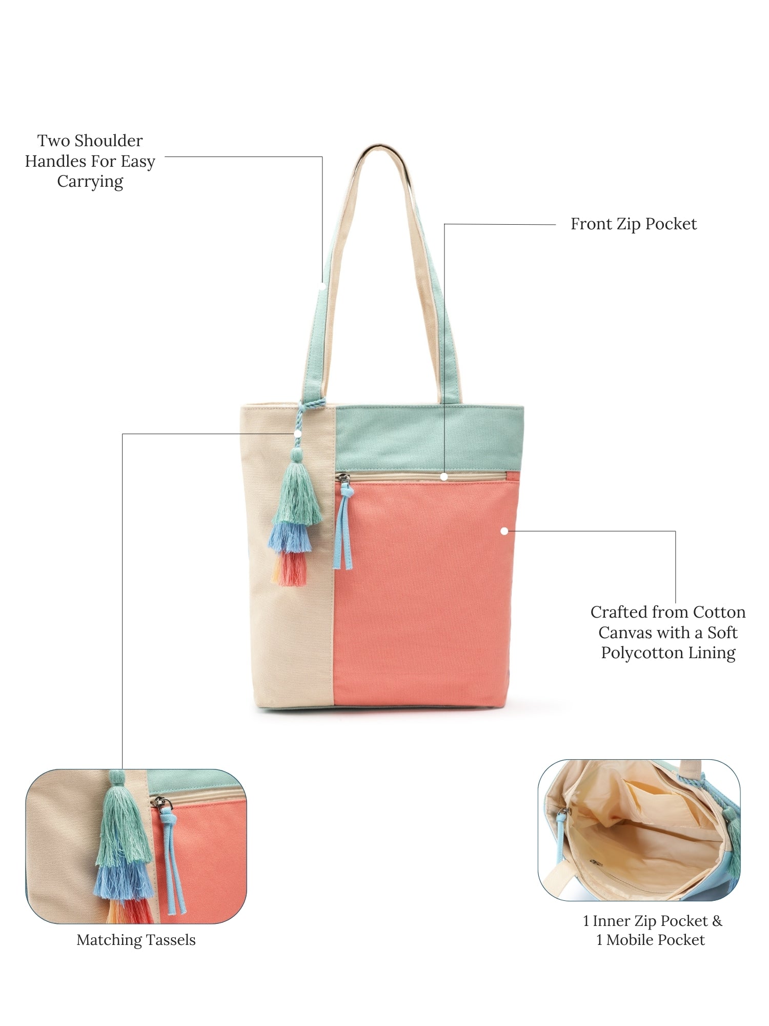 The Anekaant Pastel Multi Colourblocked Shoulder Bag from the Hue Collection combines everyday functionality with effortless style. Crafted from durable cotton canvas with a soft polycotton lining, it features one main compartment secured with a zip closure.The pastel palette—featuring Coral, Aqua Blue, Mint Green, and Cream—adds a fresh, modern touch, while the colourblocked design and tassel accent bring in a fun, fashion-forward flair. Thoughtfully designed, it includes one external zip pocket for quick access, one inner zip pocket for secure storage, and a mobile pocket to keep your essentials organized.Dimensions (L x H x W): 27 x 32 x 7 cm.