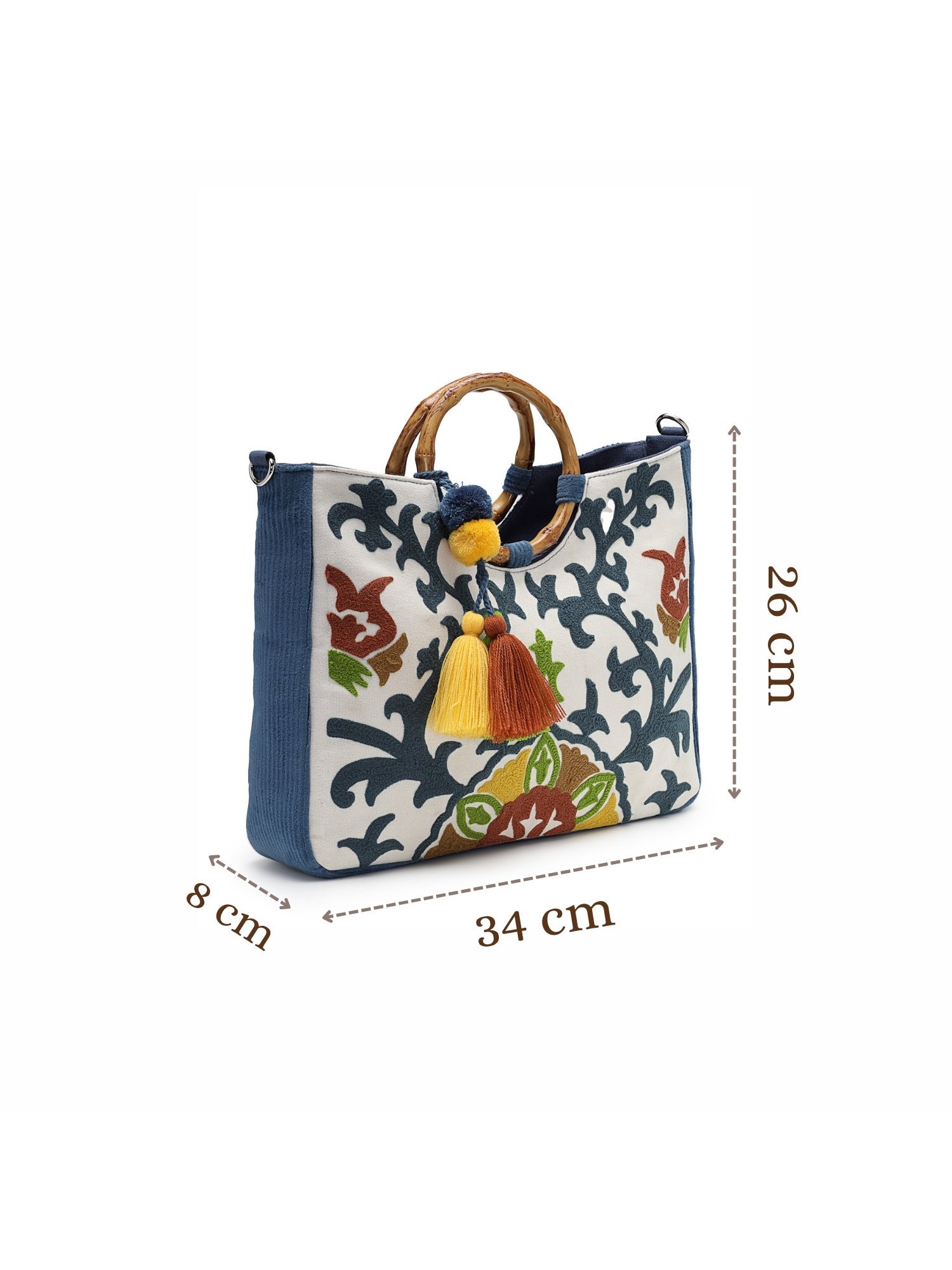 This Anekaant Handheld Bag from the Tribal Sutra Collection is crafted from cotton canvas and corduroy in a blue base, enriched with multicolored embroidery in mustard yellow, olive green, terracotta brown, white, and navy accents. The design showcases a bold floral and vine-inspired embroidered motif in contrasting shades, creating an artisanal boho-chic appeal. The interior features one slip pocket and one zip pocket to keep valuables secure, while dual wooden handles and a detachable embroidered adjustable sling strap ensure ease of carrying. A complementing tassel completes the look. Dimensions (L x H x W): 34 x 26 x 8 cm.