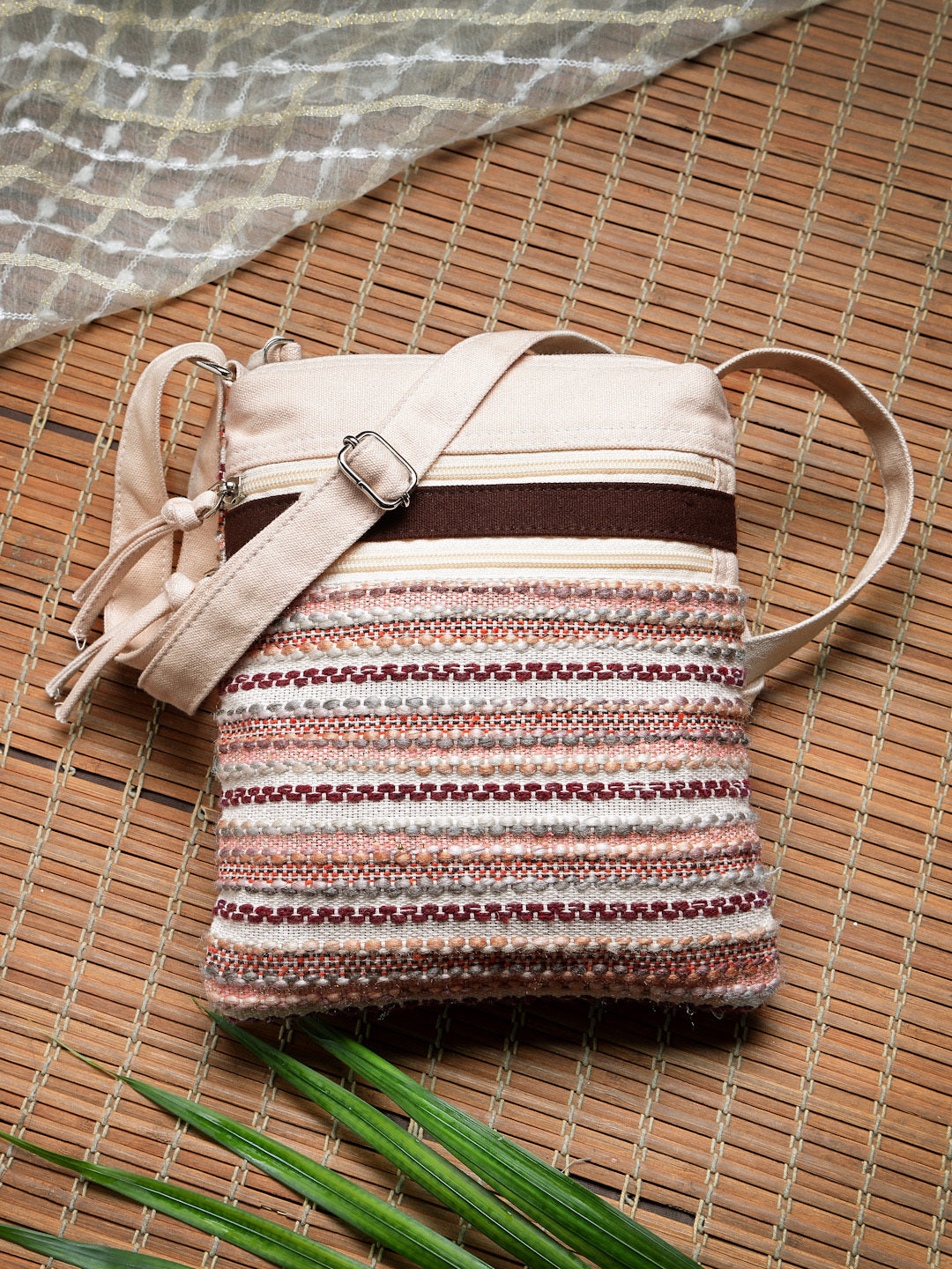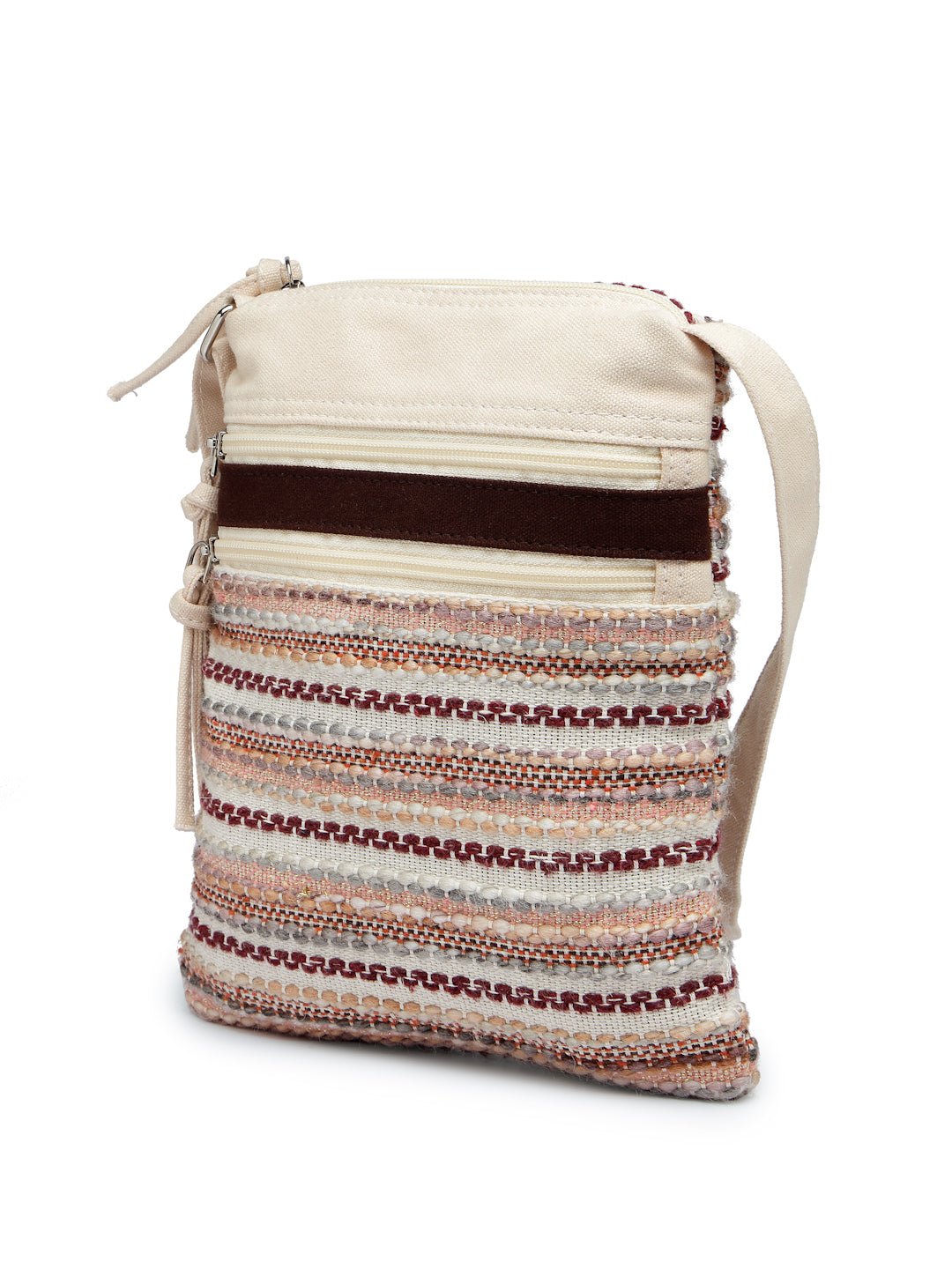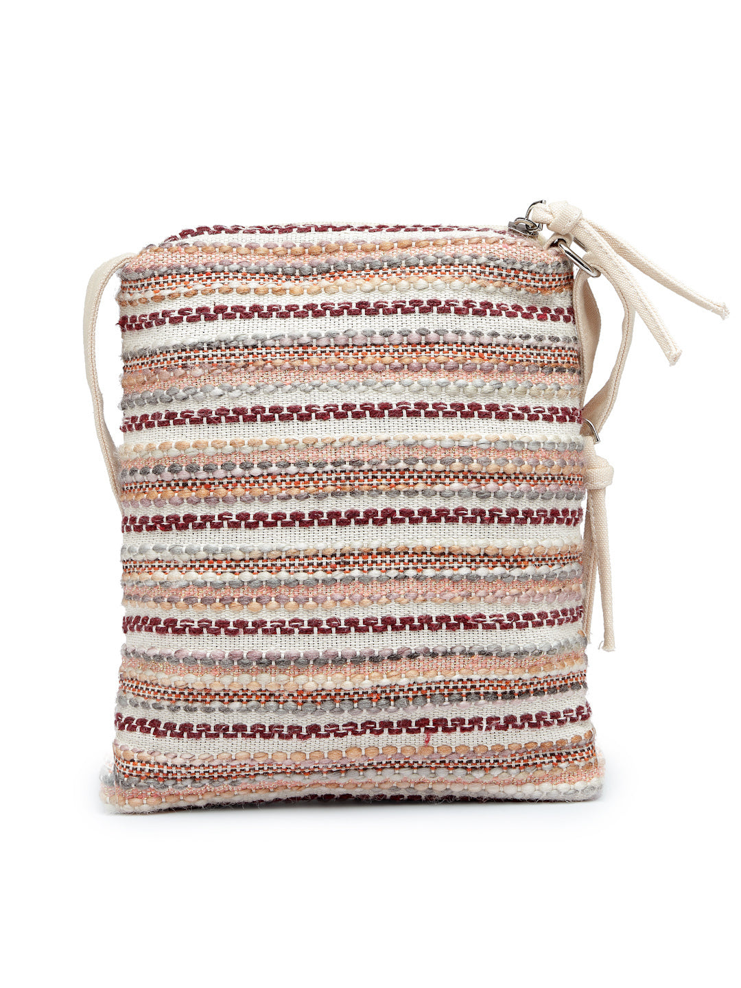 This Anekaant sling bag from the Lines & Loops collection features a main compartment secured with a zip closure for everyday convenience. Designed with a blush base accented by soft tones of peach, mauve, and ivory, it delivers a subtle yet contemporary look. Crafted from acrylic jacquard and canvas and finished with a durable polyester lining, the bag highlights a striped woven pattern enhanced with detailed threadwork in contrasting hues. It is finished with an inner slip pocket, dual front zip pockets for organised storage, and an adjustable strap for versatile styling. Dimensions (L × H × W): 20 × 24 × 2 cm.