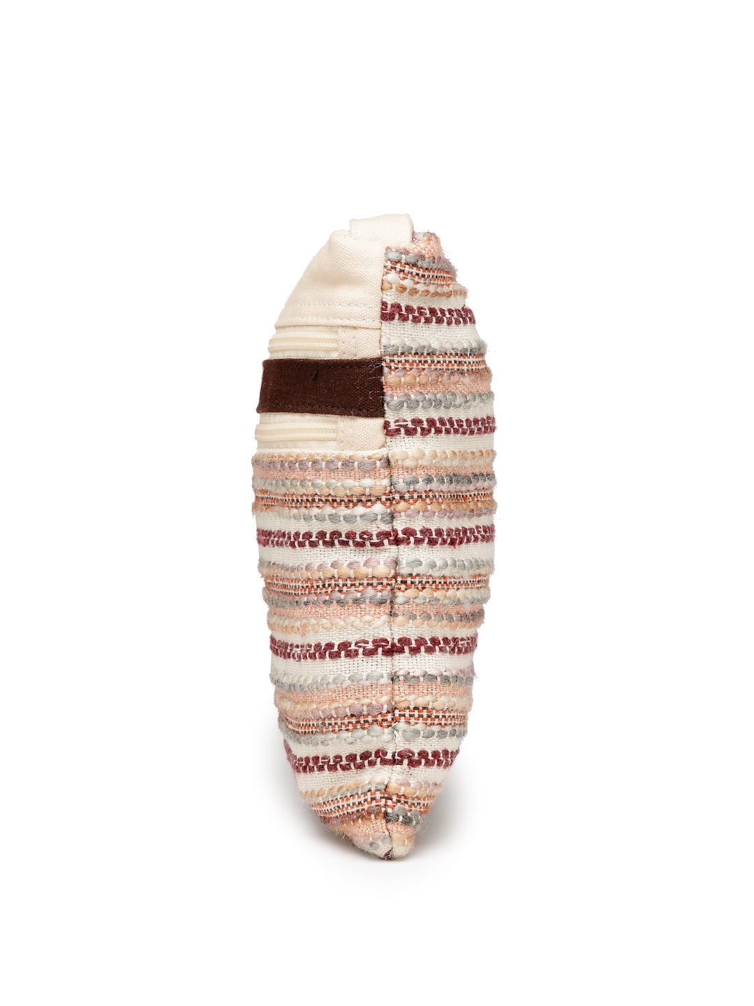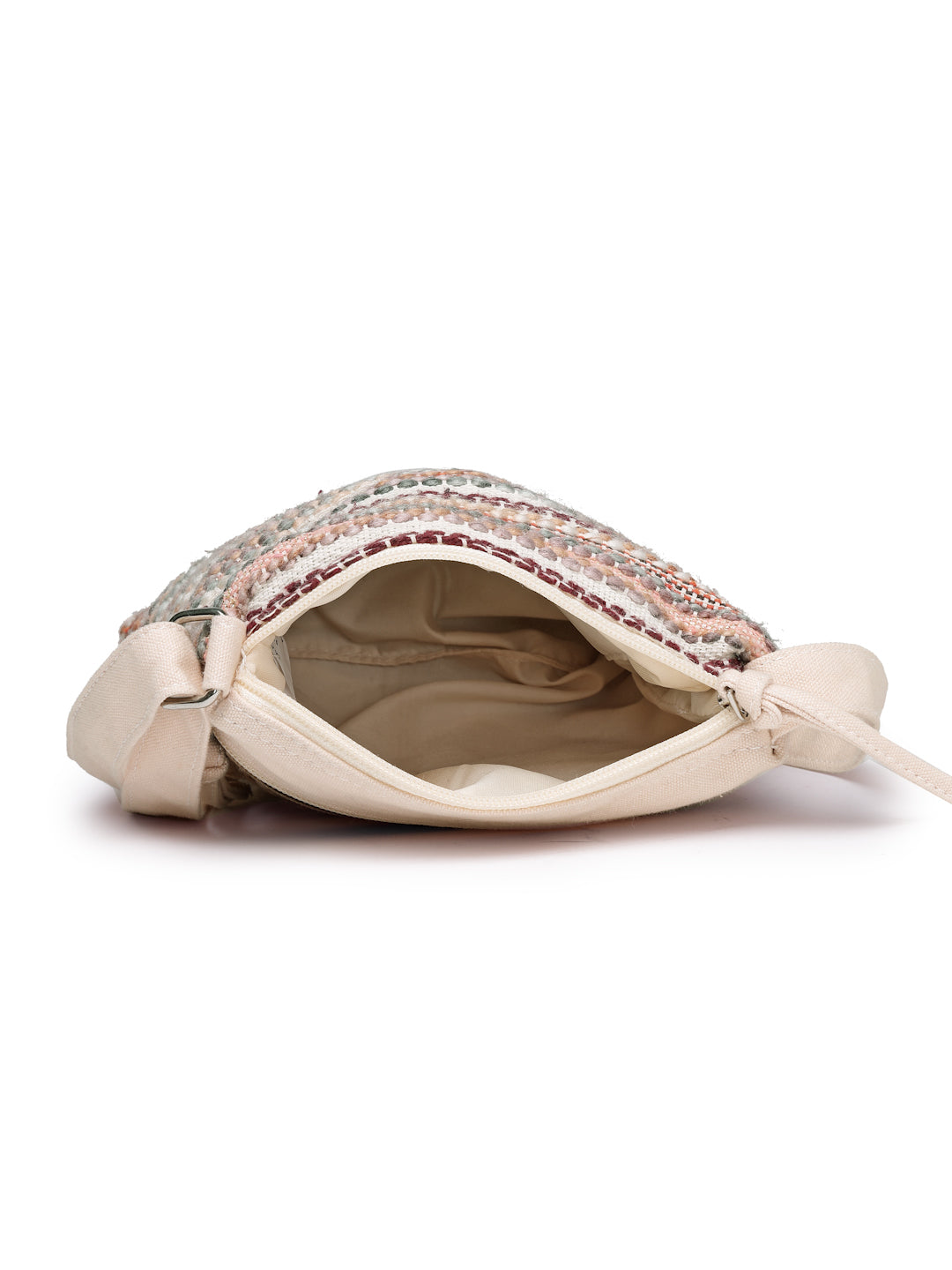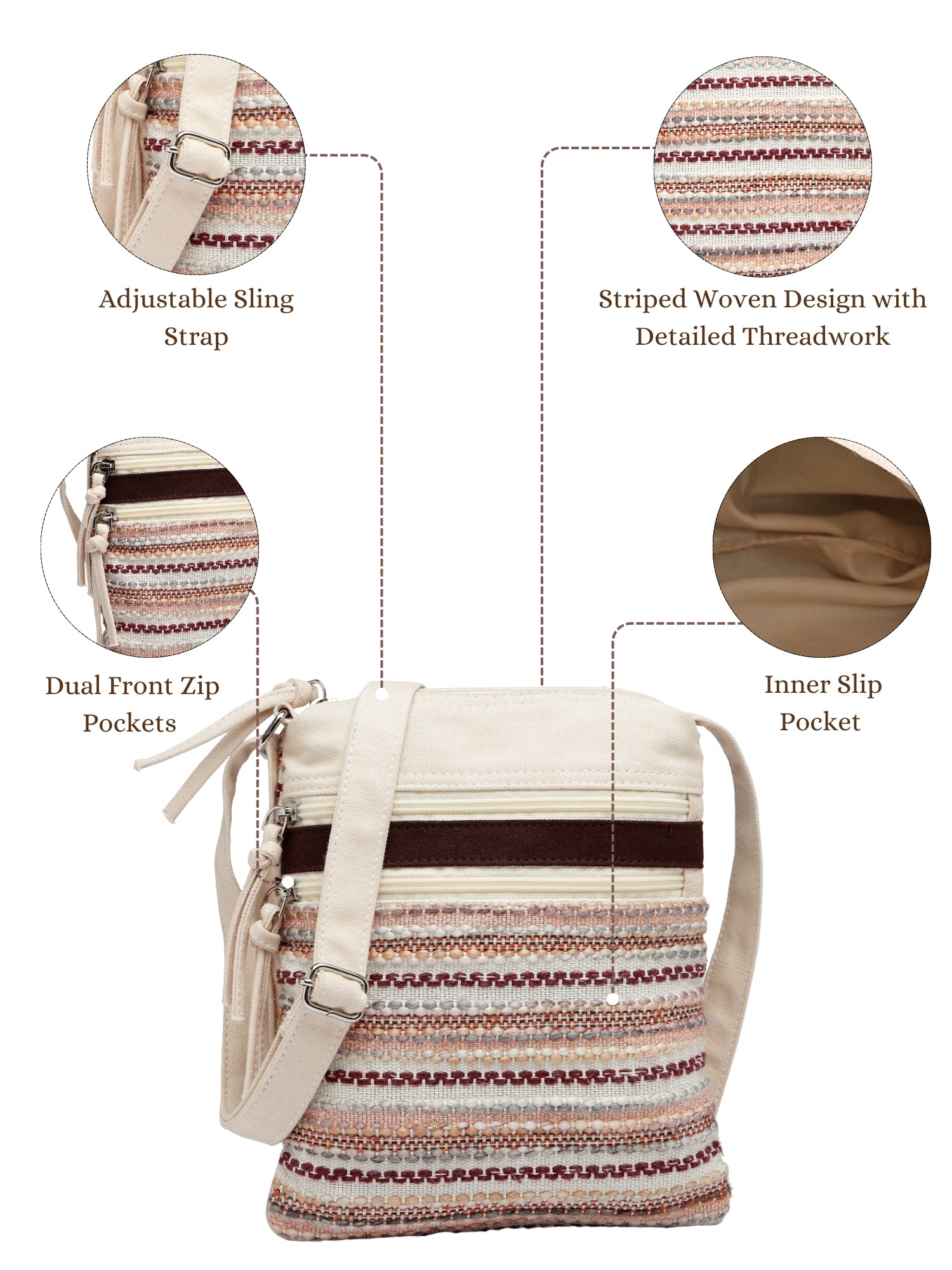 This Anekaant sling bag from the Lines & Loops collection features a main compartment secured with a zip closure for everyday convenience. Designed with a blush base accented by soft tones of peach, mauve, and ivory, it delivers a subtle yet contemporary look. Crafted from acrylic jacquard and canvas and finished with a durable polyester lining, the bag highlights a striped woven pattern enhanced with detailed threadwork in contrasting hues. It is finished with an inner slip pocket, dual front zip pockets for organised storage, and an adjustable strap for versatile styling. Dimensions (L × H × W): 20 × 24 × 2 cm.