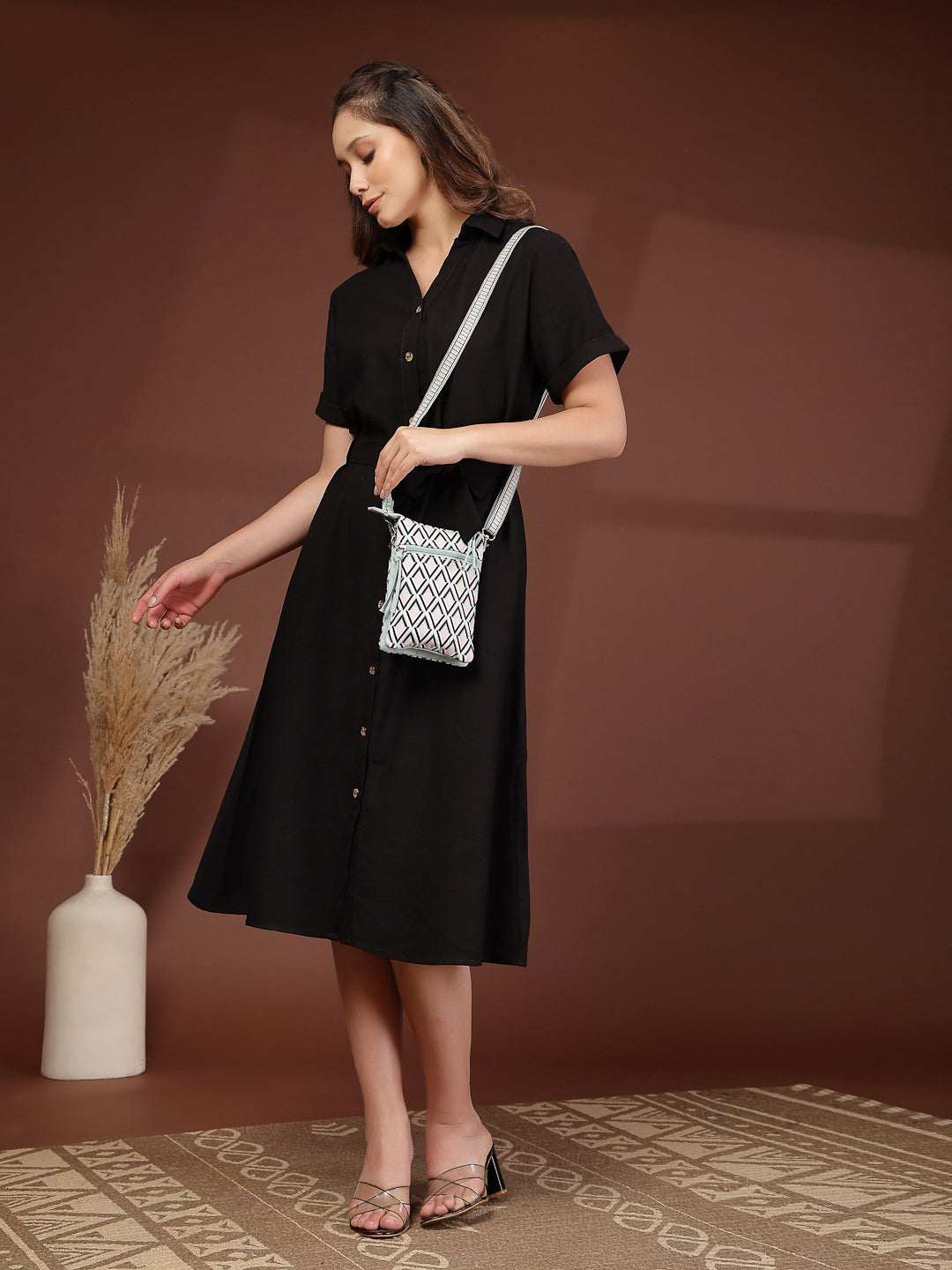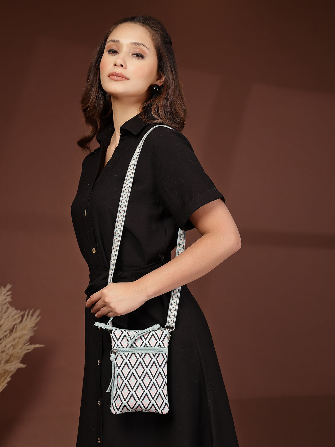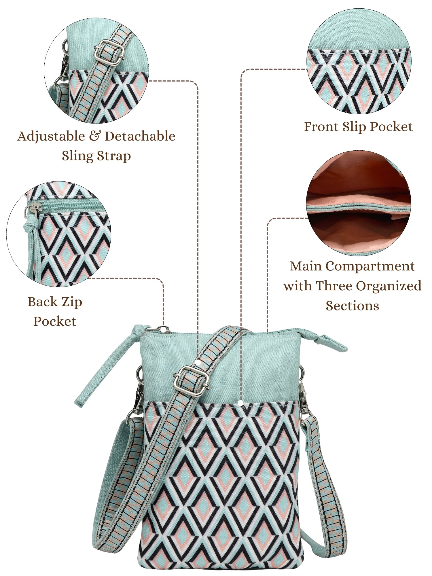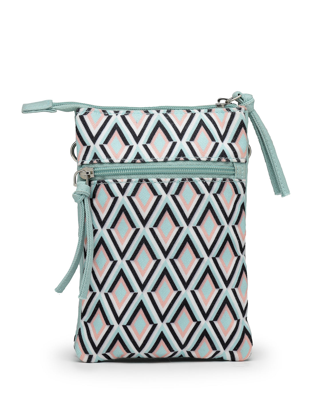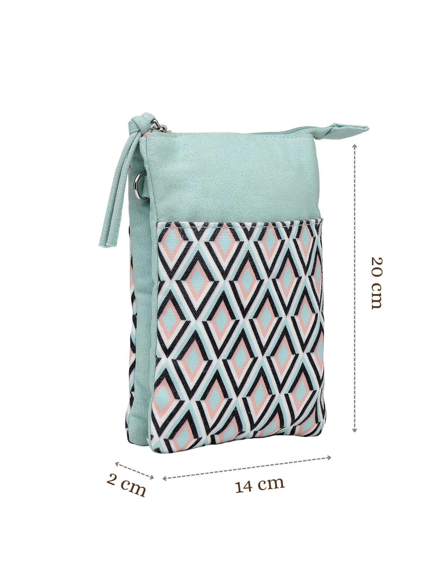 This Anekaant sling bag from the Tile Trip collection features a streamlined triple-compartment design secured with a zip closure for everyday convenience. Styled in a teal blue base highlighted with peach, black, and off-white accents, it offers a modern and balanced appeal. Crafted from a blend of polycotton and canvas and finished with a smooth polyester-lined interior, the bag showcases a geometric diamond print in a clean, contemporary layout. Thoughtfully designed, it includes a front slip pocket, a spacious main compartment divided into three organised sections, a secure back zip pocket, and an adjustable, detachable sling strap for versatile wear. Dimensions (L × H × W): 14 × 20 × 2 cm.
