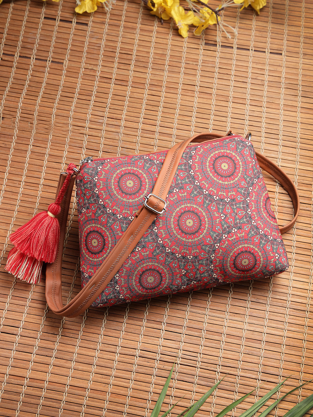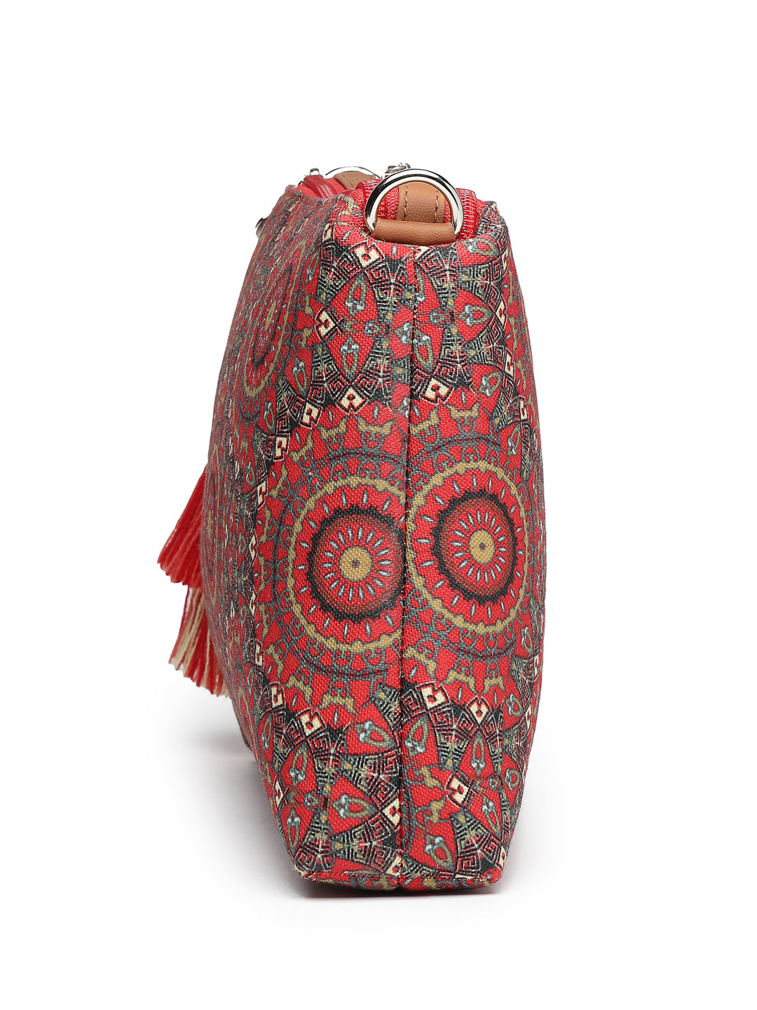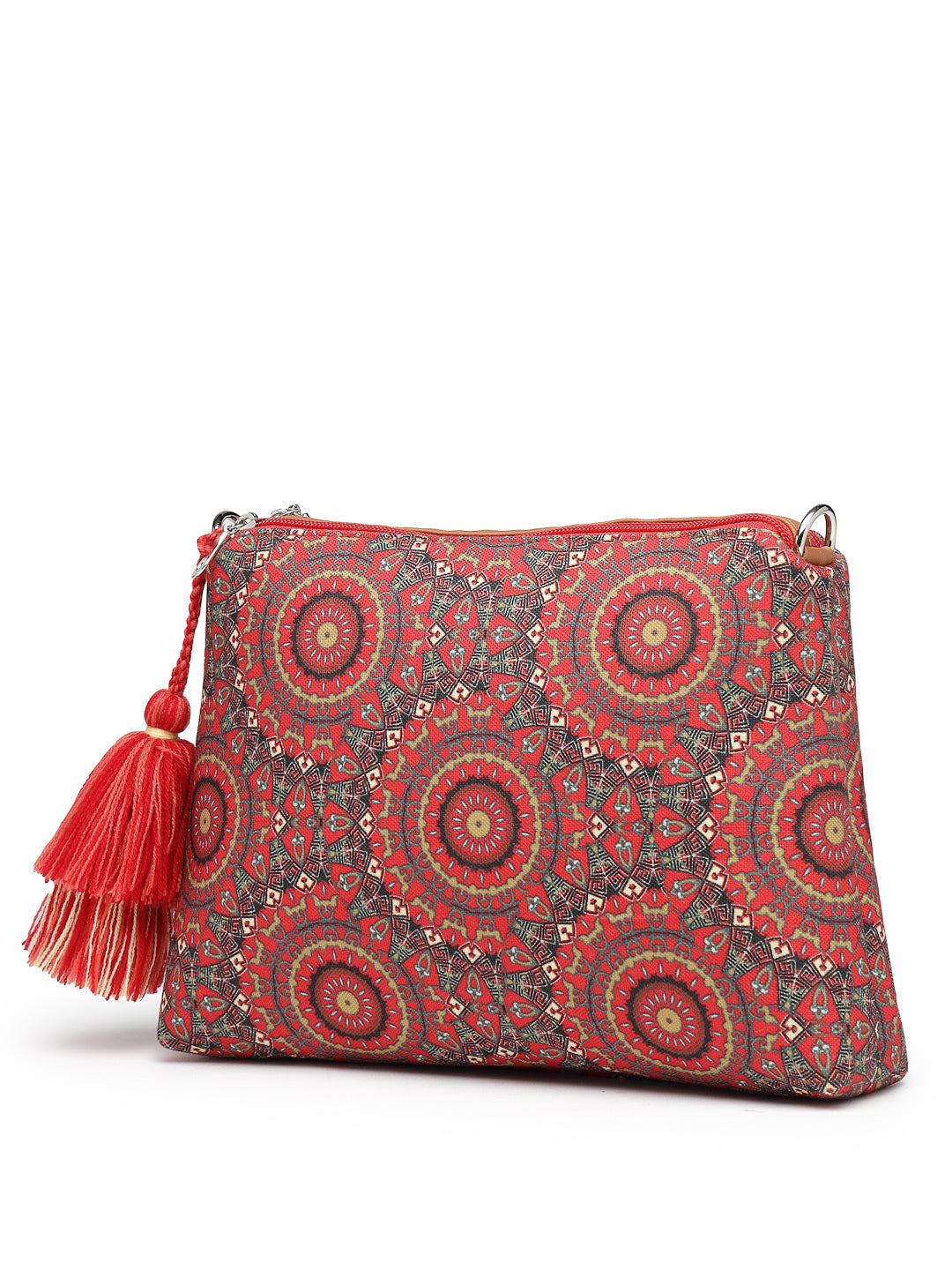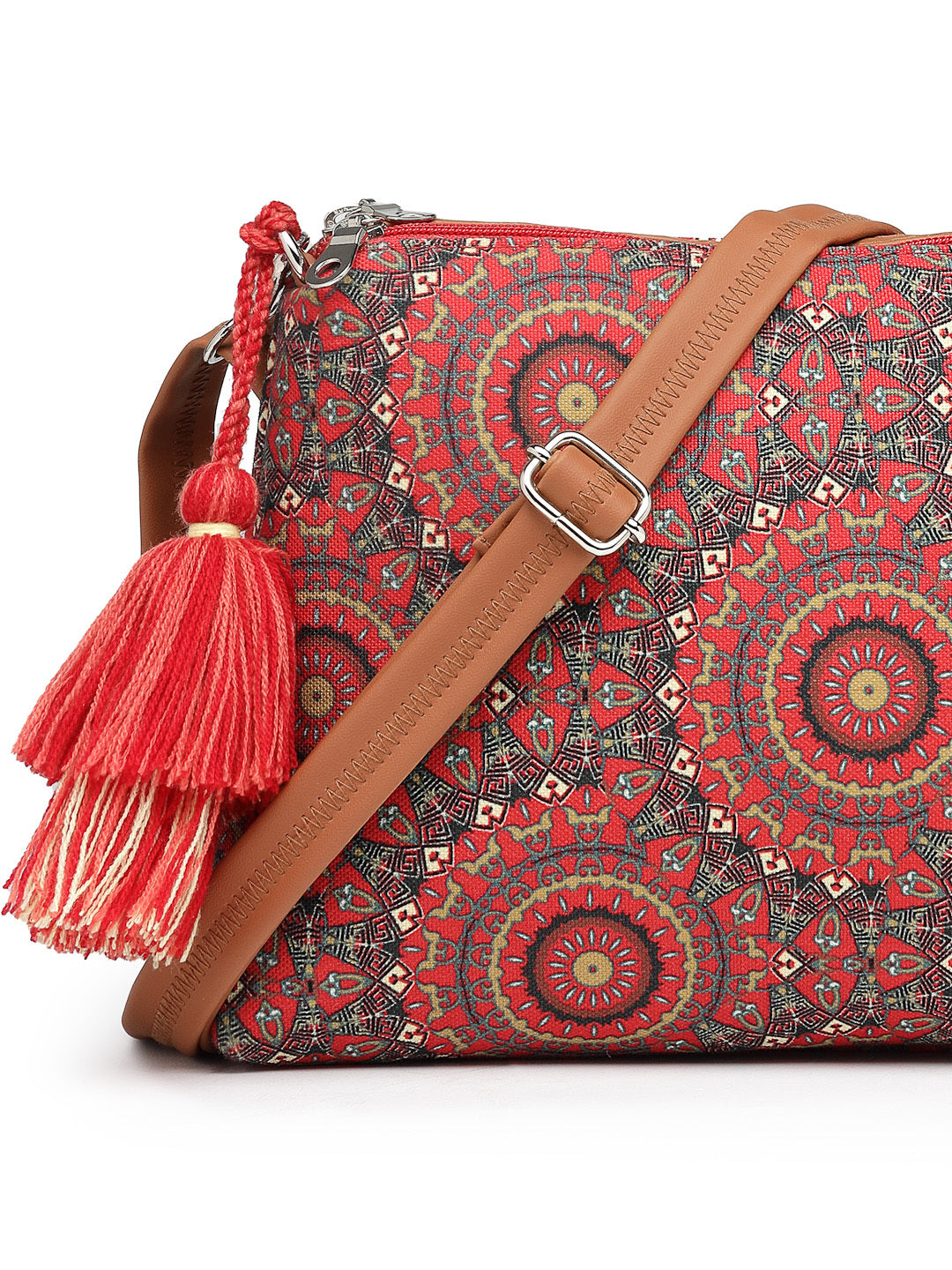 This Anekaant sling bag from the Tile Trip collection is designed with dual main compartments, both secured with zip closures for organised storage. Styled in a deep red colourway complemented by vibrant multicolour accents, it offers a rich and festive appeal. Crafted from durable polycotton canvas with PU accents and finished with a polyester lining, the bag features an ethnic mandala print detailed with fine, intricate elements. It is equipped with an inner zip pocket for essentials and an adjustable, detachable sling strap accented with matching tassels for a refined finishing touch. Dimensions (L × H × W): 26 × 17 × 5 cm.