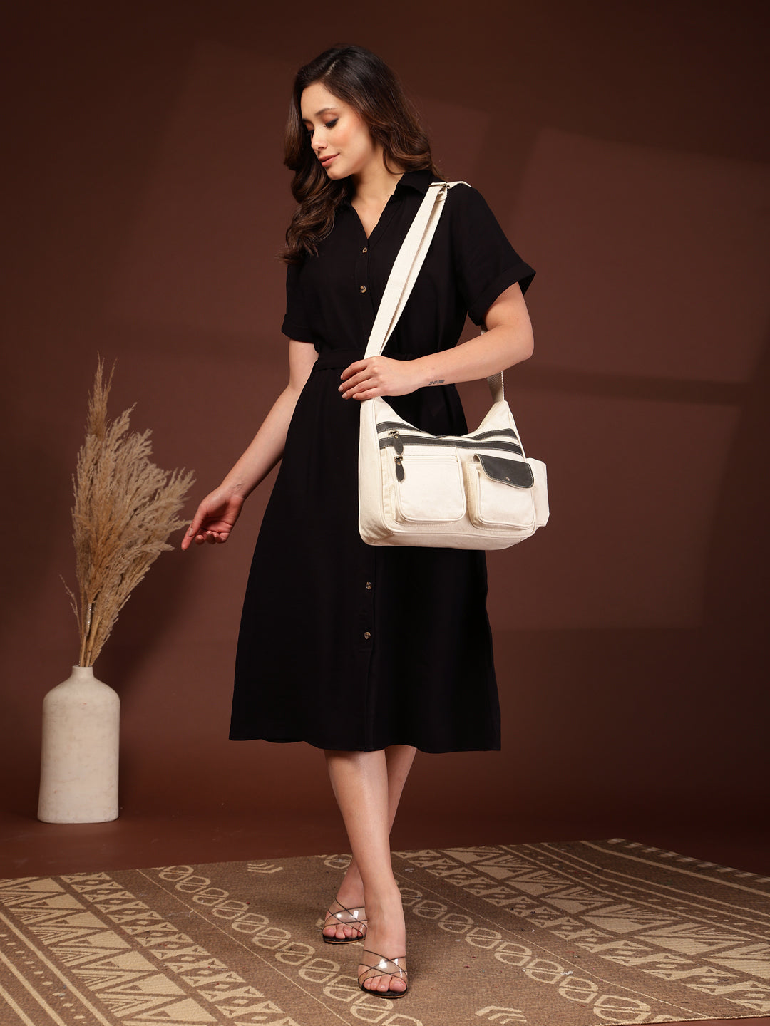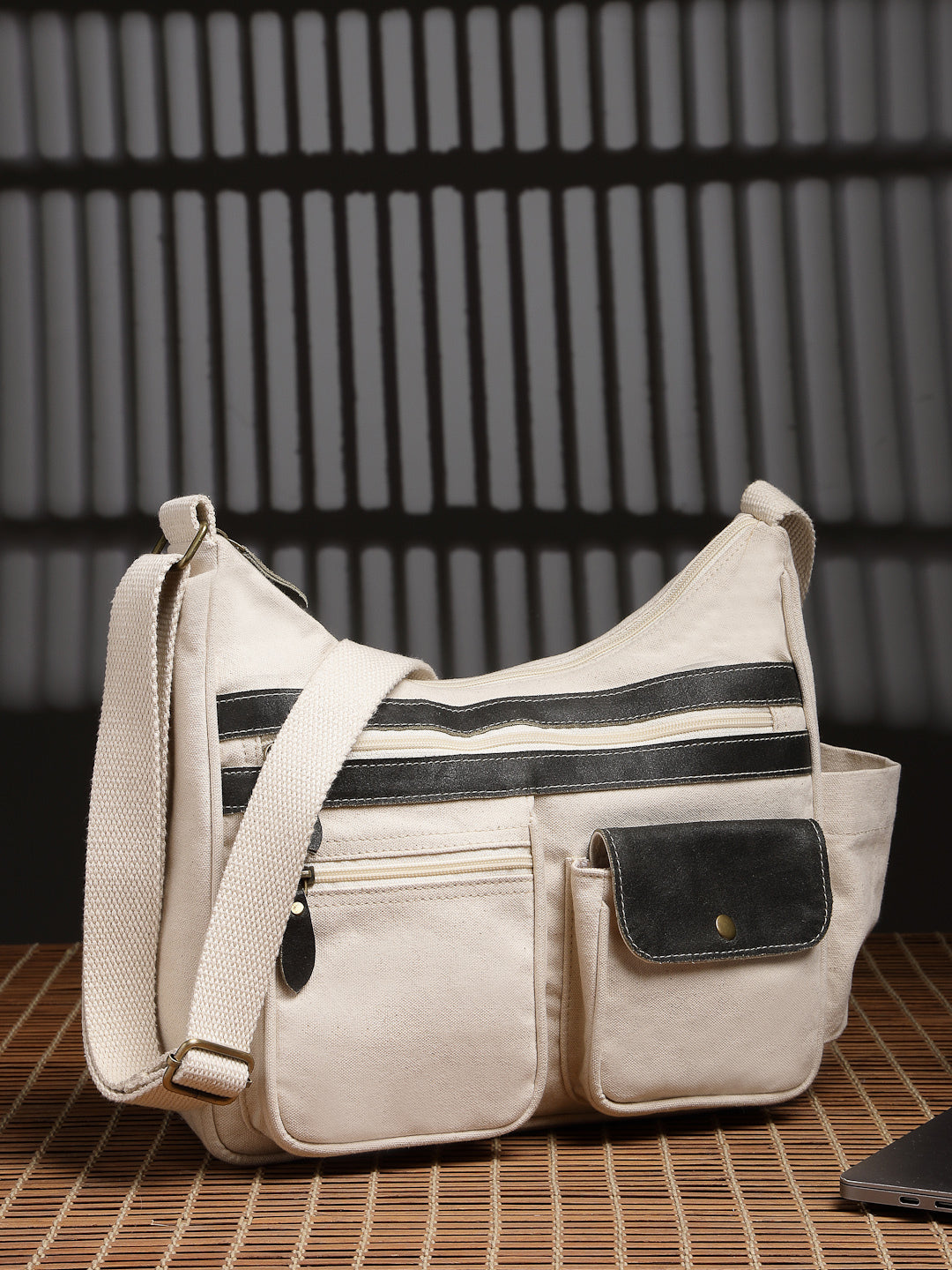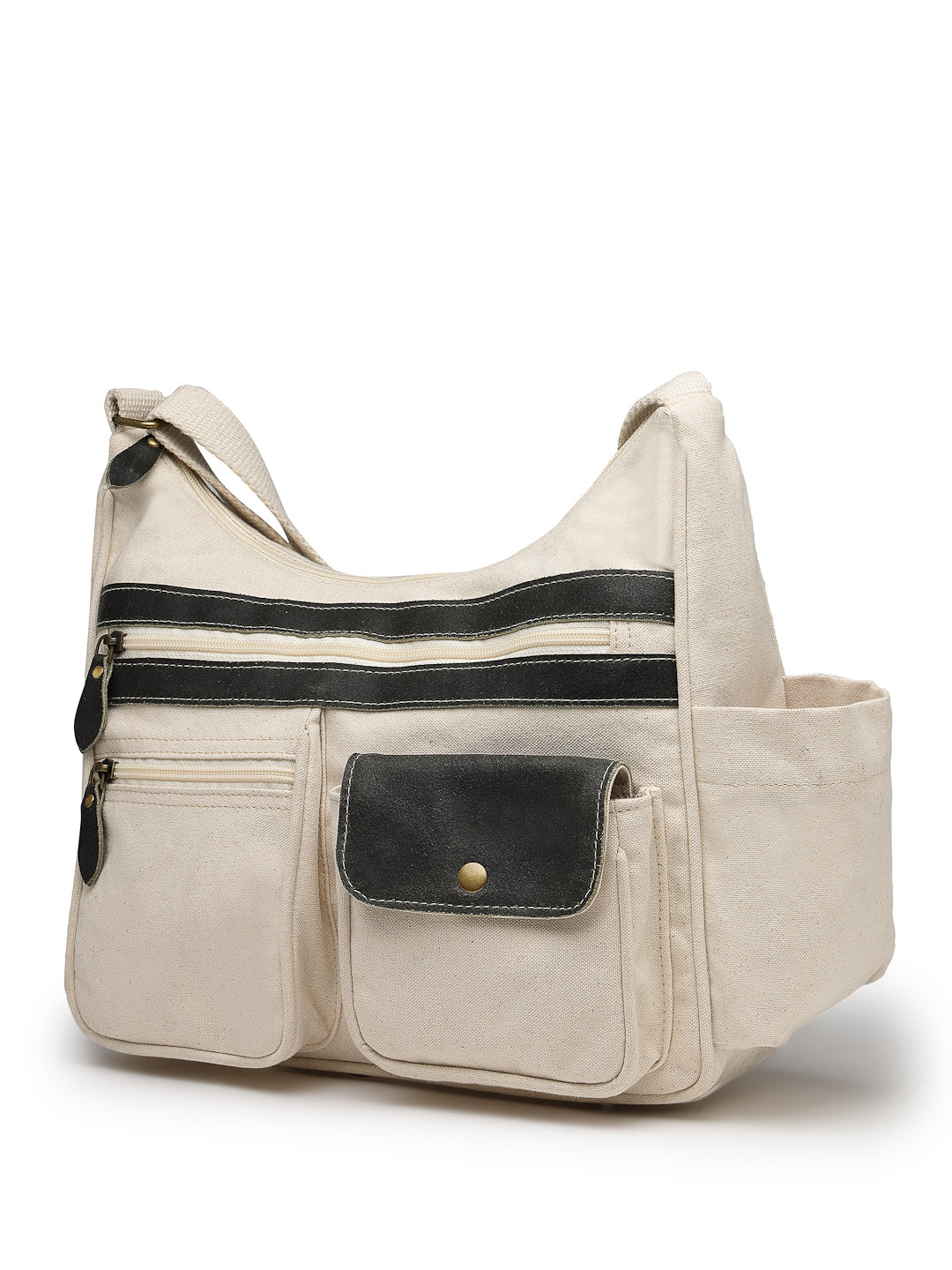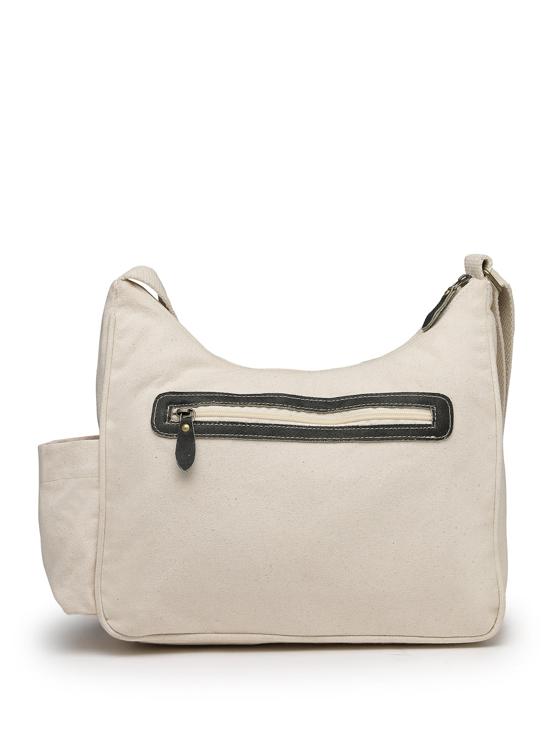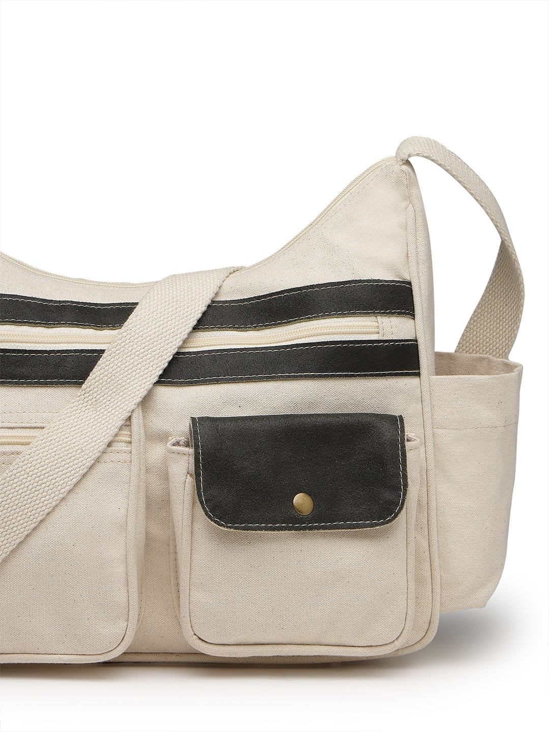 This Anekaant Sling Bag from the Timber & Thread collection is crafted with a single spacious main compartment secured by a smooth zip closure, combining utility with a refined silhouette. Designed in an off-white tone, the bag is elevated with olive detailing throughout for a sharp, modern contrast. Its dual-tone utility styling is enhanced with stitched olive leather panel accents, adding depth and character to the design. Made from a refined combination of crackle leather and cotton canvas, the bag is finished with a durable polyester lining for long-lasting use. Thoughtfully designed for everyday organization, it features a front flap pocket secured with a magnetic button closure, three external zip pockets—two at the front and one at the back,along with an inner zip pocket and a dedicated mobile pocket. A side bottle holder and an adjustable strap complete the design, offering comfort and versatility for daily wear. Dimensions (L × H × W): 32 × 28 × 10 cm
