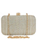 This hand crafted designer box clutch has one main compartment with clasp closure and a detachable metallic chain. Can also be used as a sling.