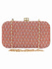 This hand crafted designer box clutch has one main compartment with clasp closure and a detachable metallic chain. Can also be used as a sling.