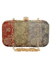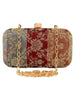 This hand crafted designer box clutch has one main compartment with clasp closure and a detachable metallic chain. Can also be used as a sling.