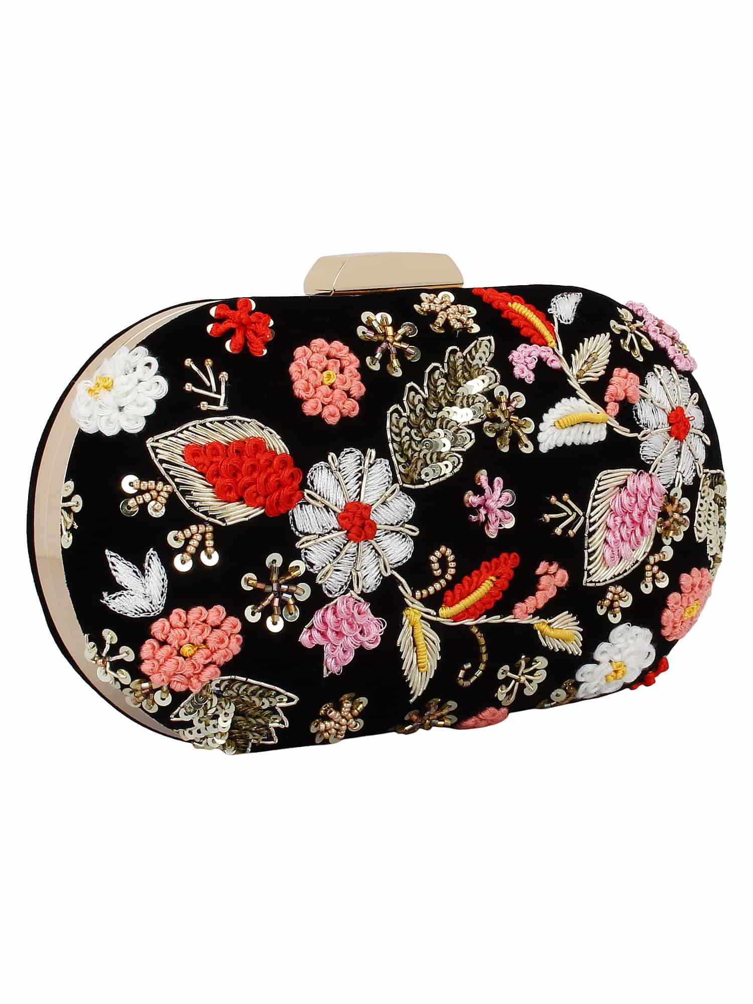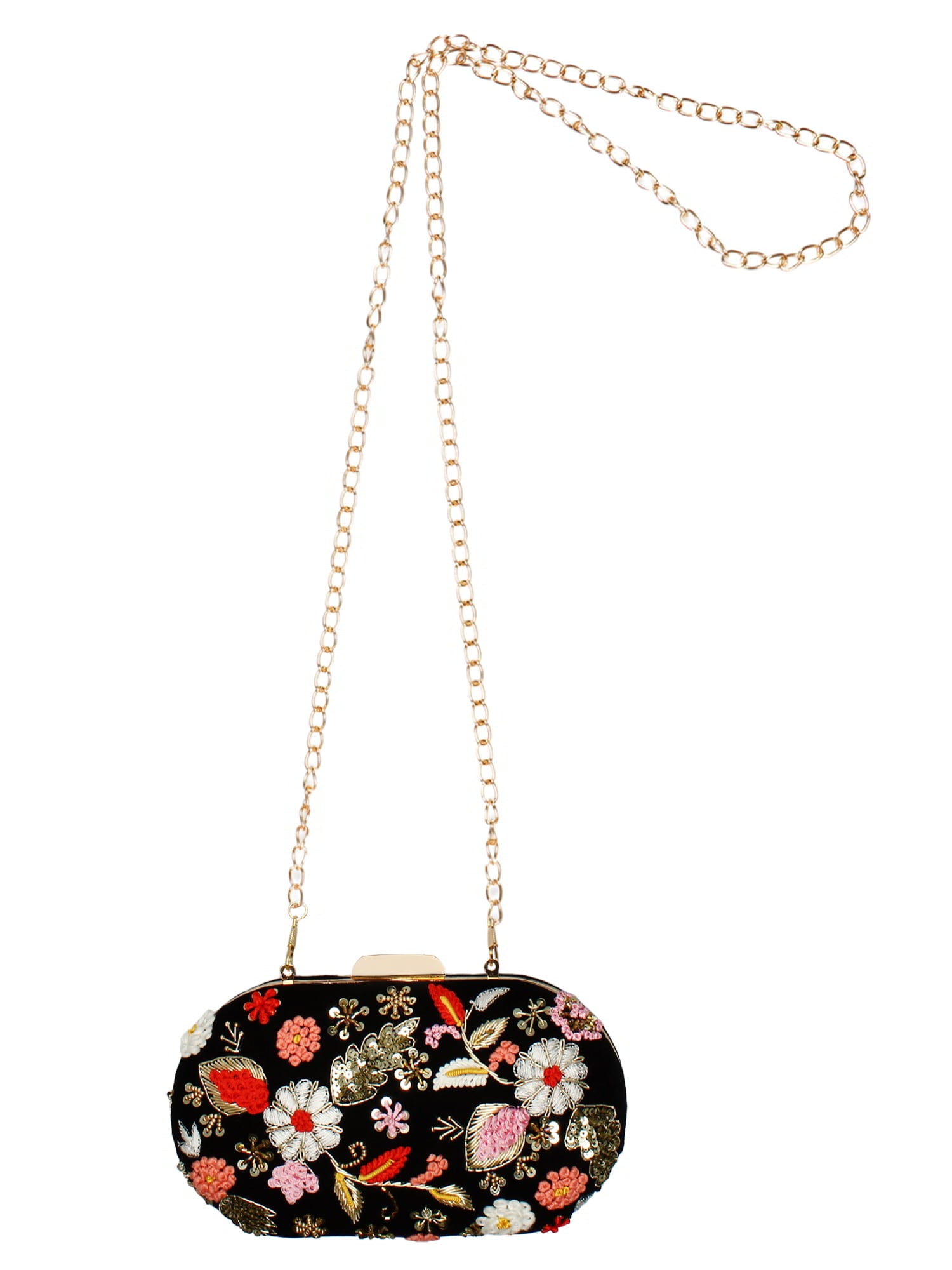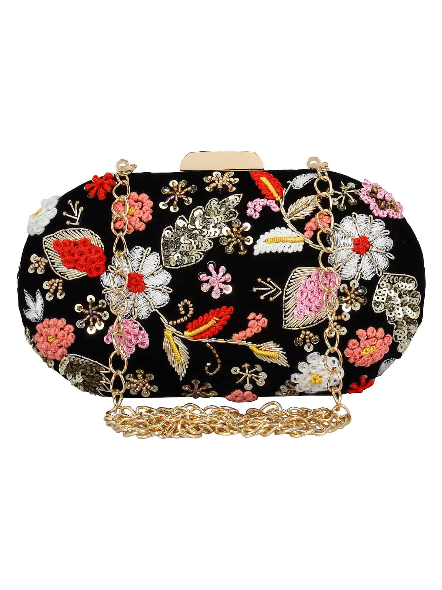 This hand crafted designer box clutch with zari embroidery and sequins work has one main compartment with clasp closure and a detachable metallic chain. Can also be used as a sling.