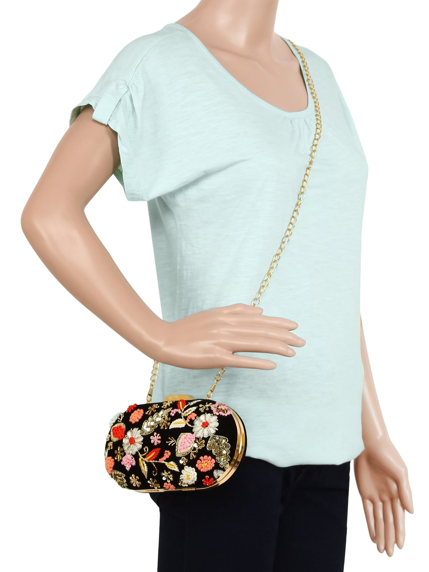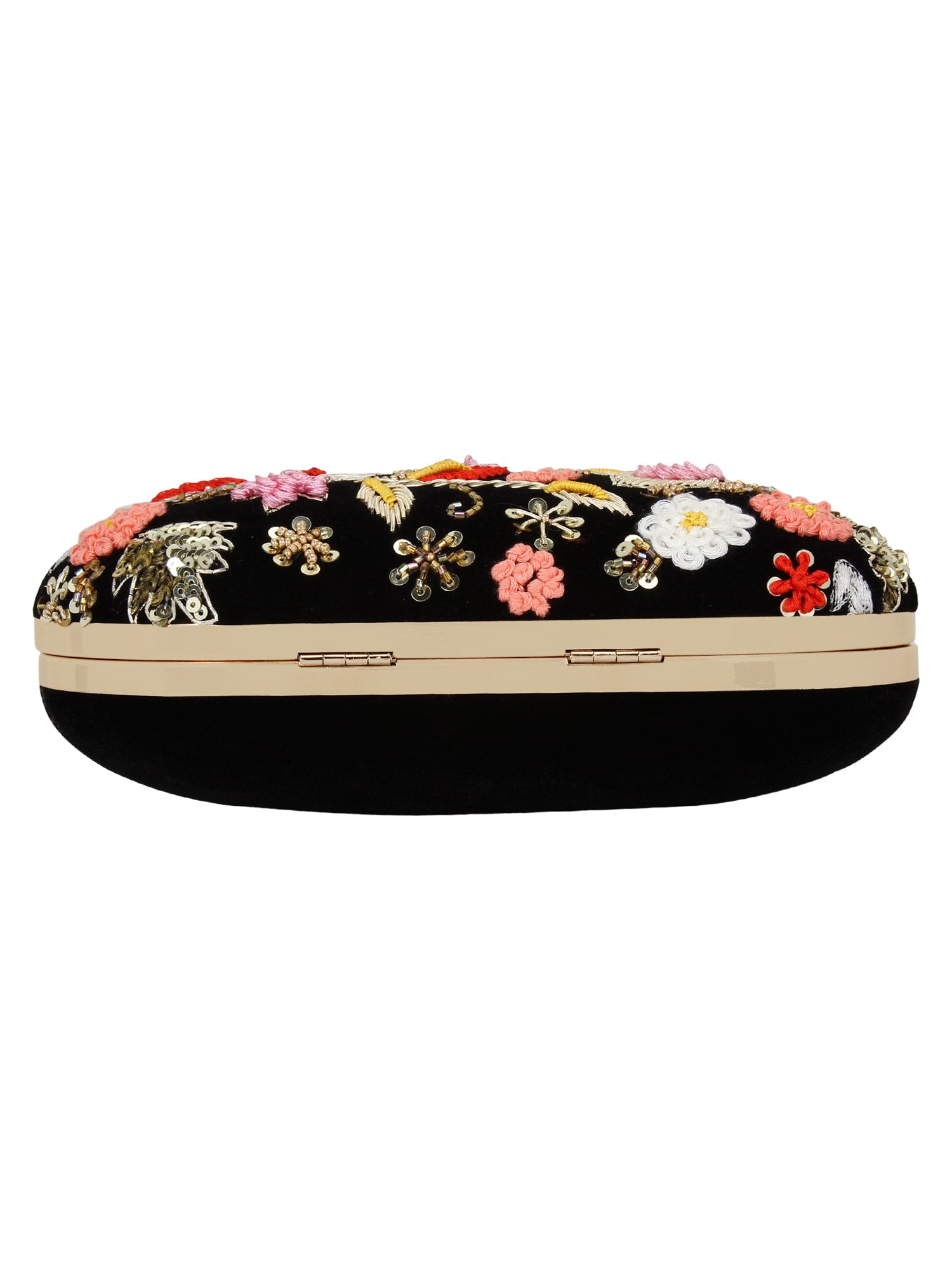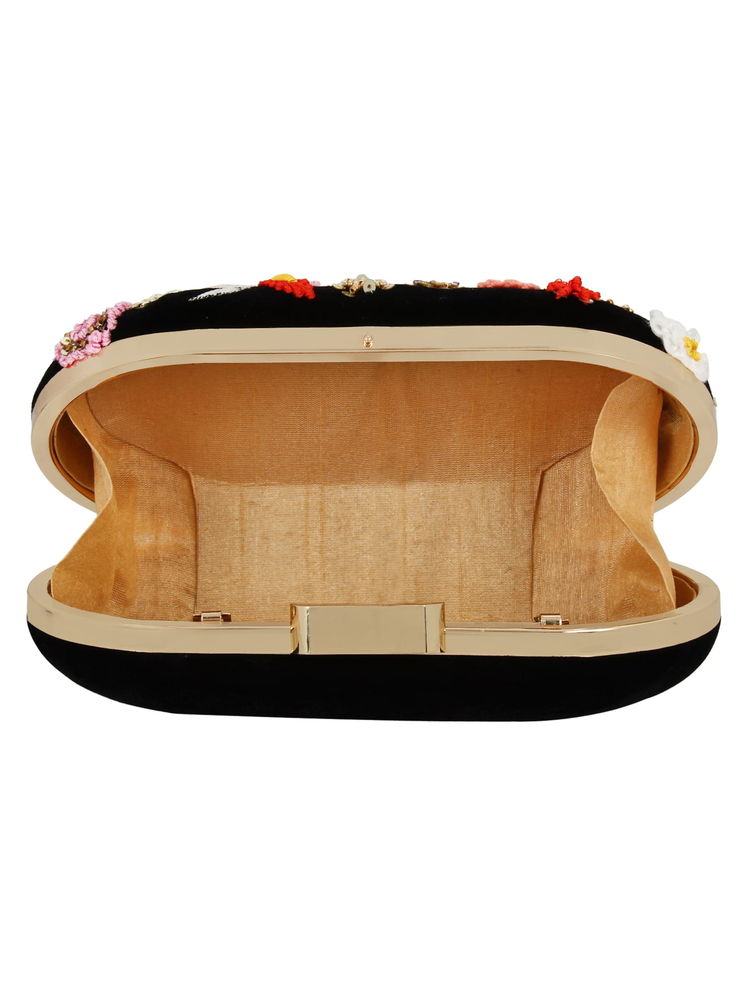 This hand crafted designer box clutch with zari embroidery and sequins work has one main compartment with clasp closure and a detachable metallic chain. Can also be used as a sling.