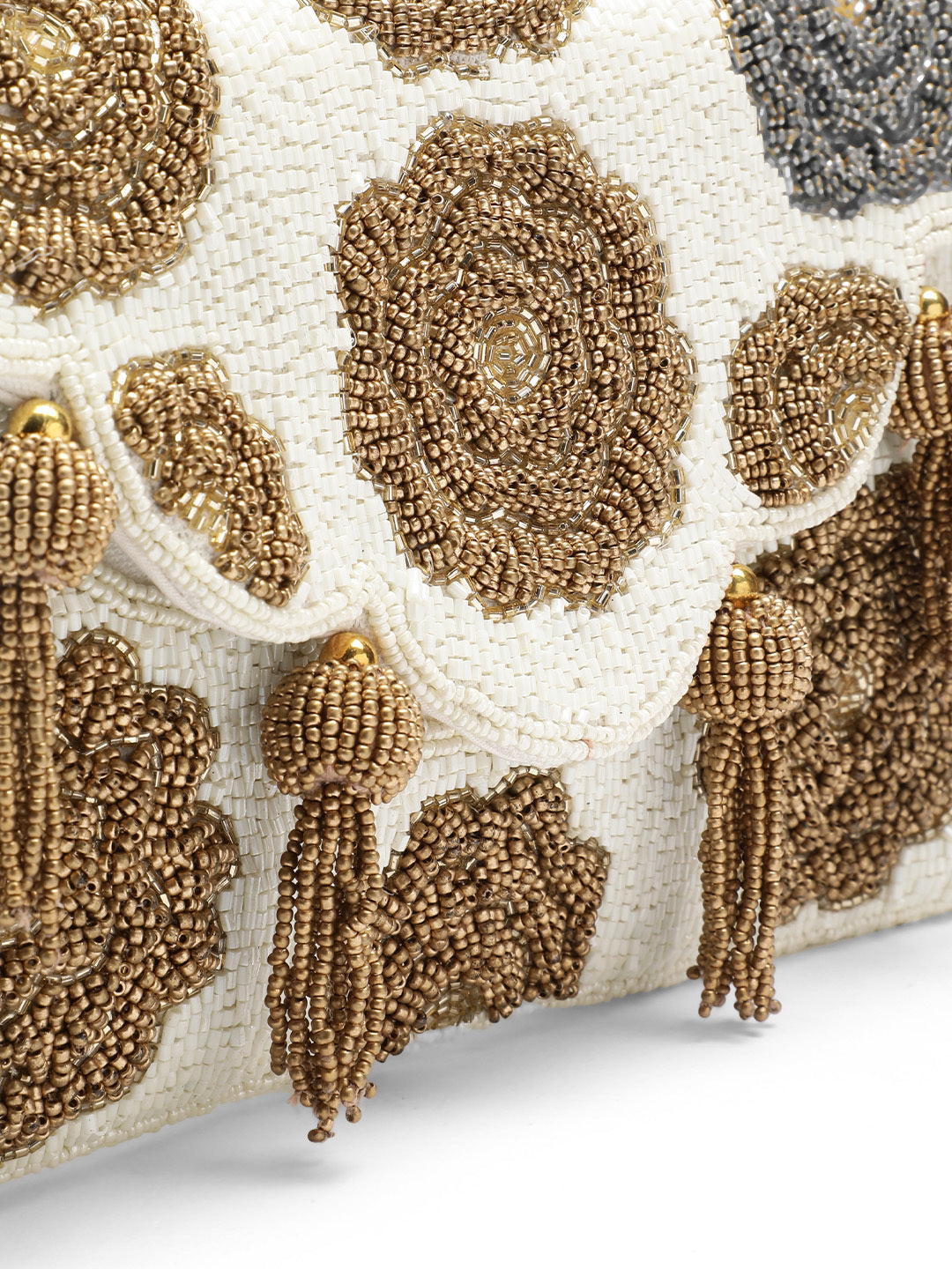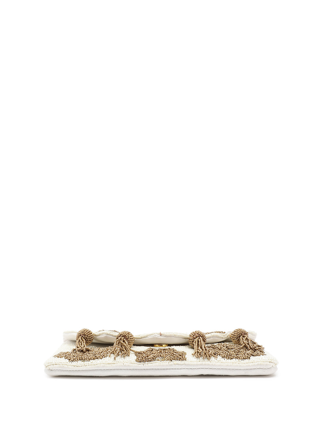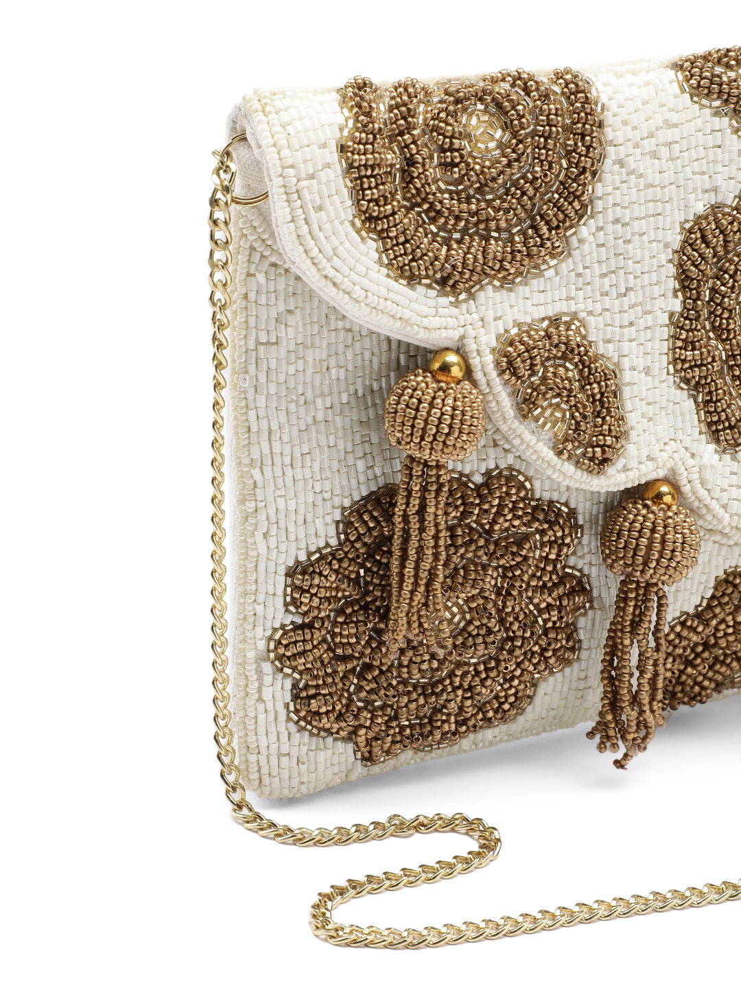 This Anekaant Embellished Sling Bag in Ivory and Metallic Gold is a charming festive accessory from the Tassel Tales Sling Bag collection. Made from high-quality canvas with a soft polycotton lining, it features a beautifully embellished floral motif with intricate beadwork and tasselled accents that add a playful touch. Designed with a single main compartment and a secure magnetic button closure, it also includes an inner slip pocket and a detachable chain strap for versatile styling. Lightweight and easy to carry, it's perfect for festive occasions. Dimensions (L x H x W): 25 x 16 x 2 cm.
