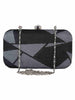 Hand crafted designer box clutch with geometric jacquard fabric. It has one main compartment with clasp closure and a detachable metal chain. Can also be used as a sling.